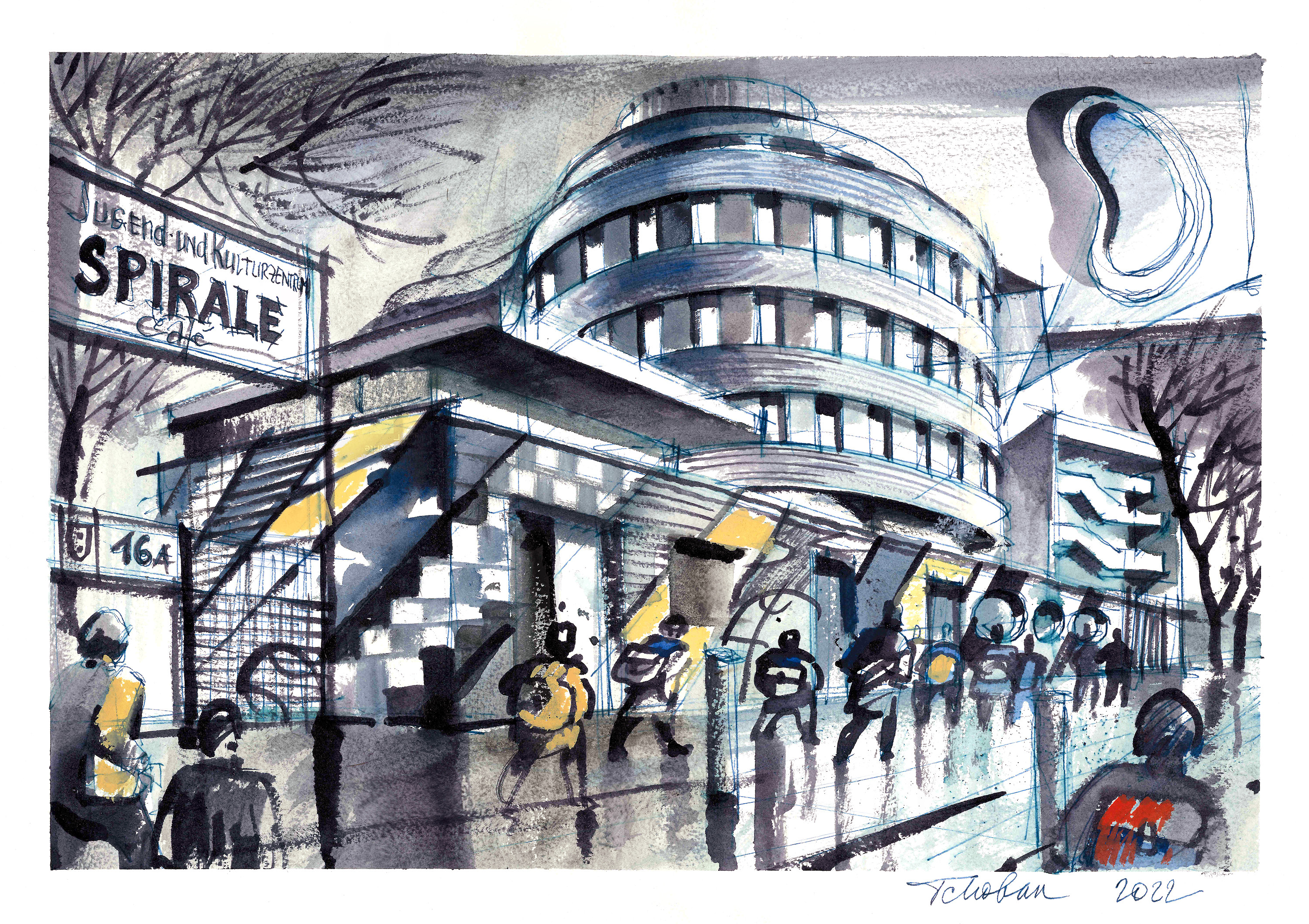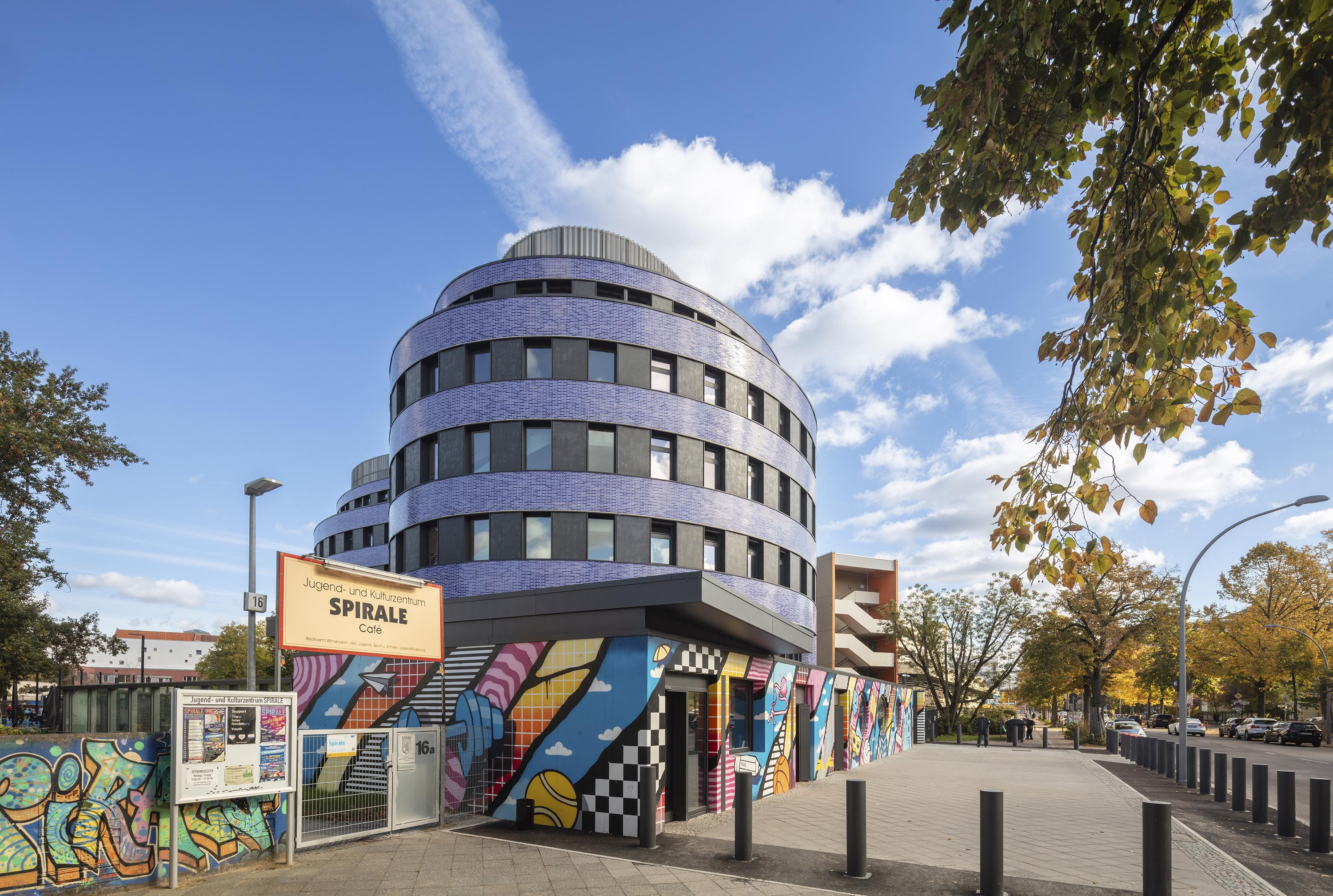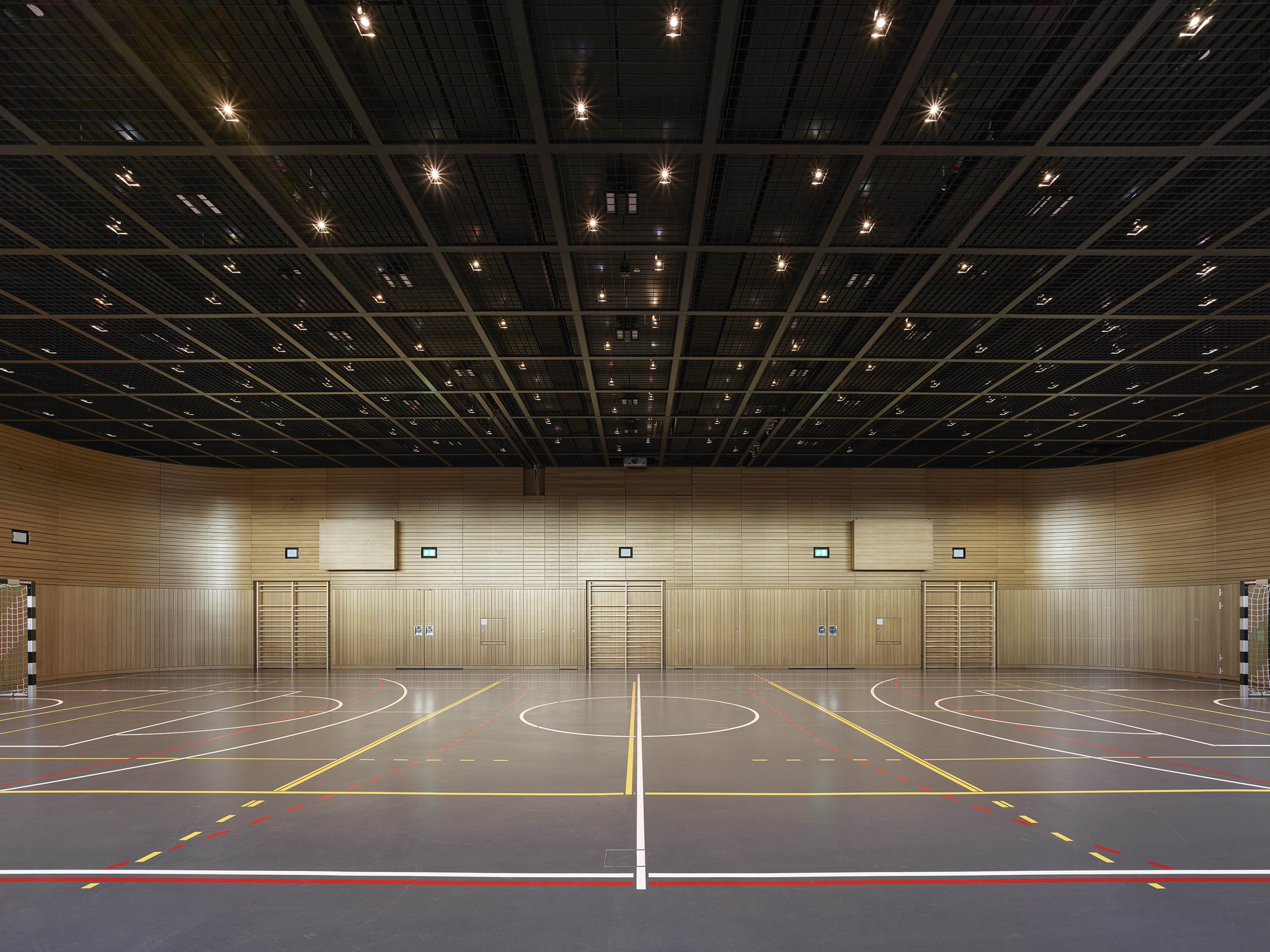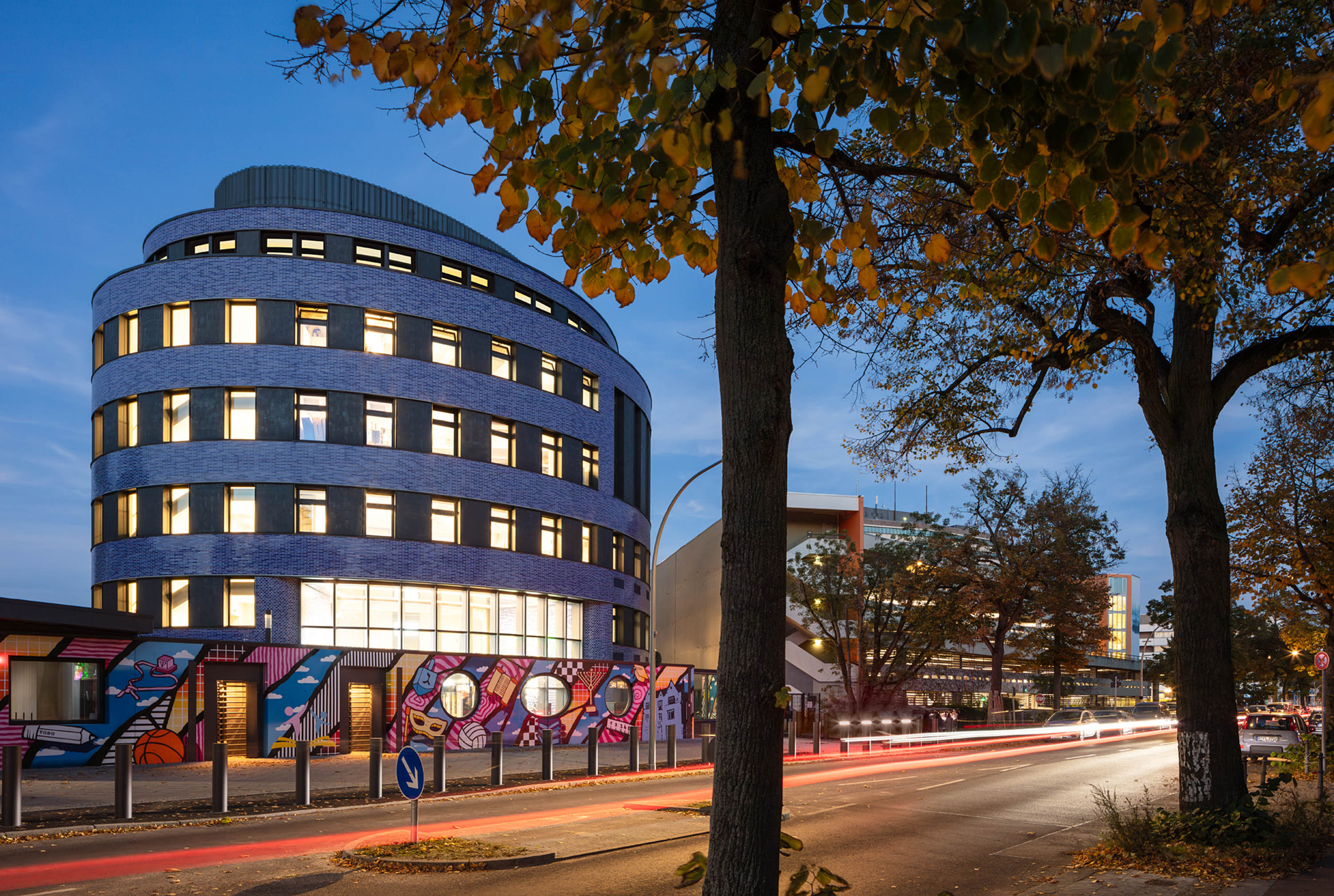 The two-storey multi-purpose hall on the third floor can be used flexibly for sports activities but also for cultural events and religious celebrations. The concrete wall on the street side shows graffiti by the Berlin street artist TOBO.