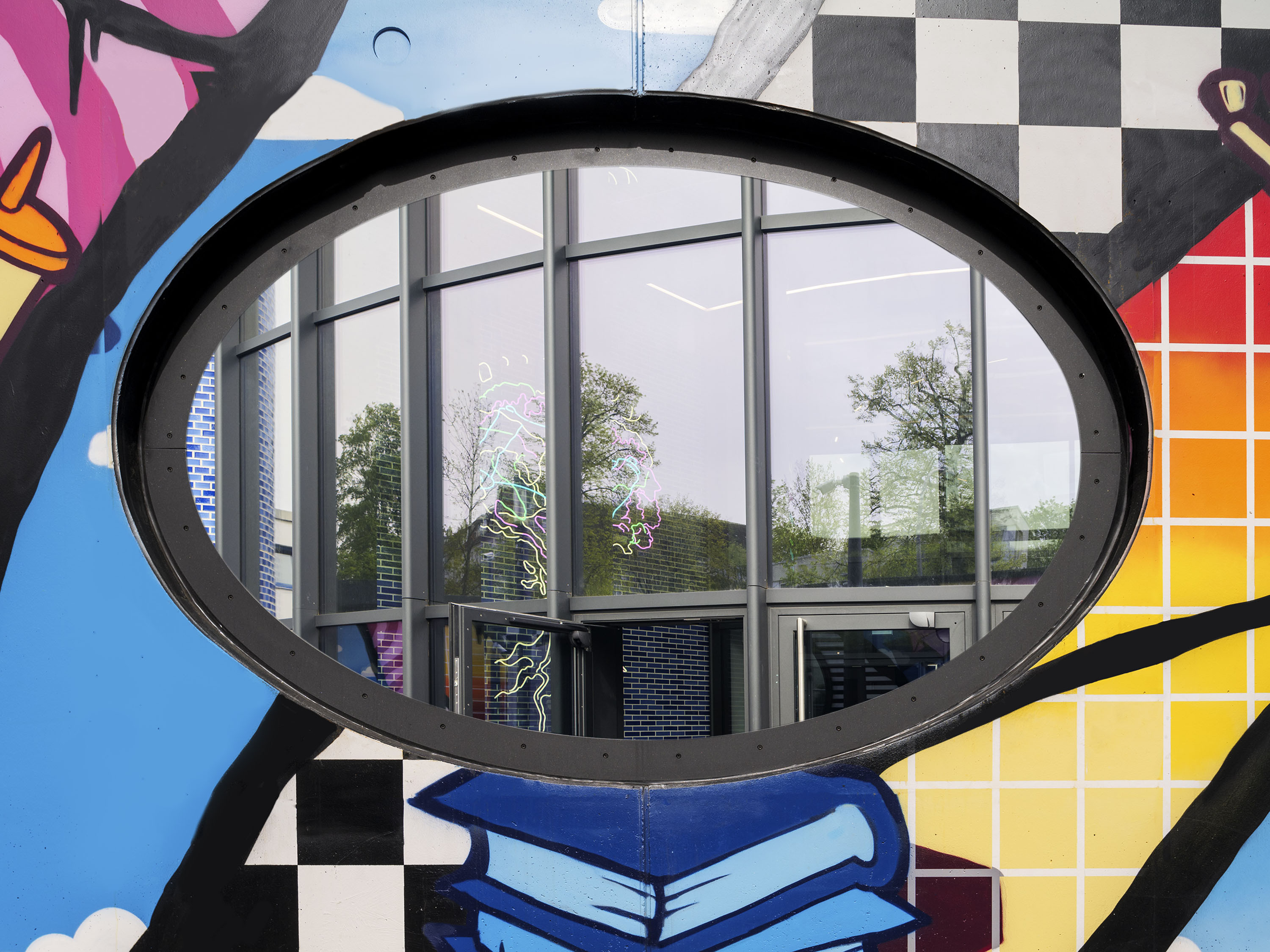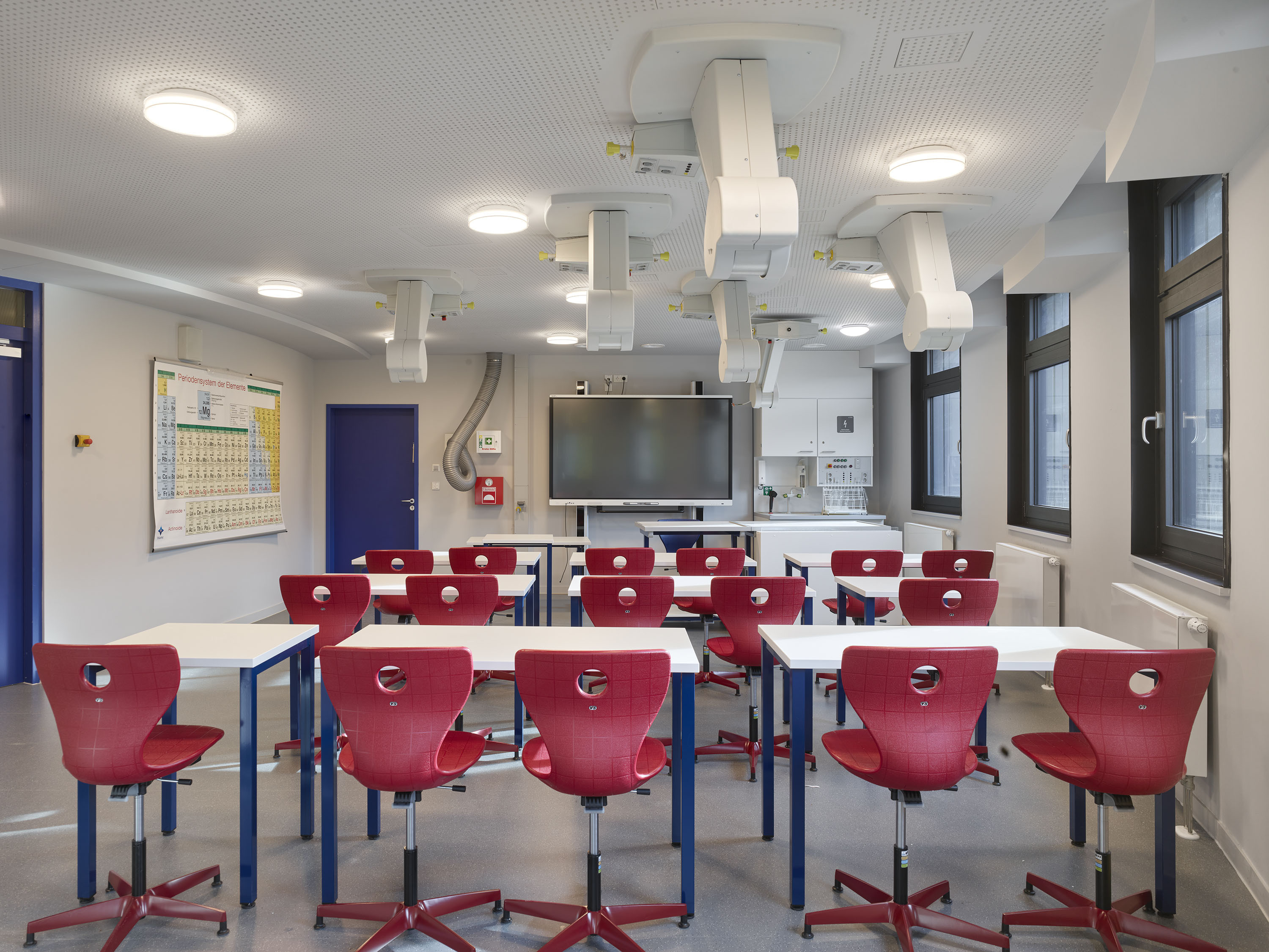 The walls of the school’s main entrance are adorned with two kabbalistic trees of life – light installations by the Berlin artist Anna Nezhnaya.