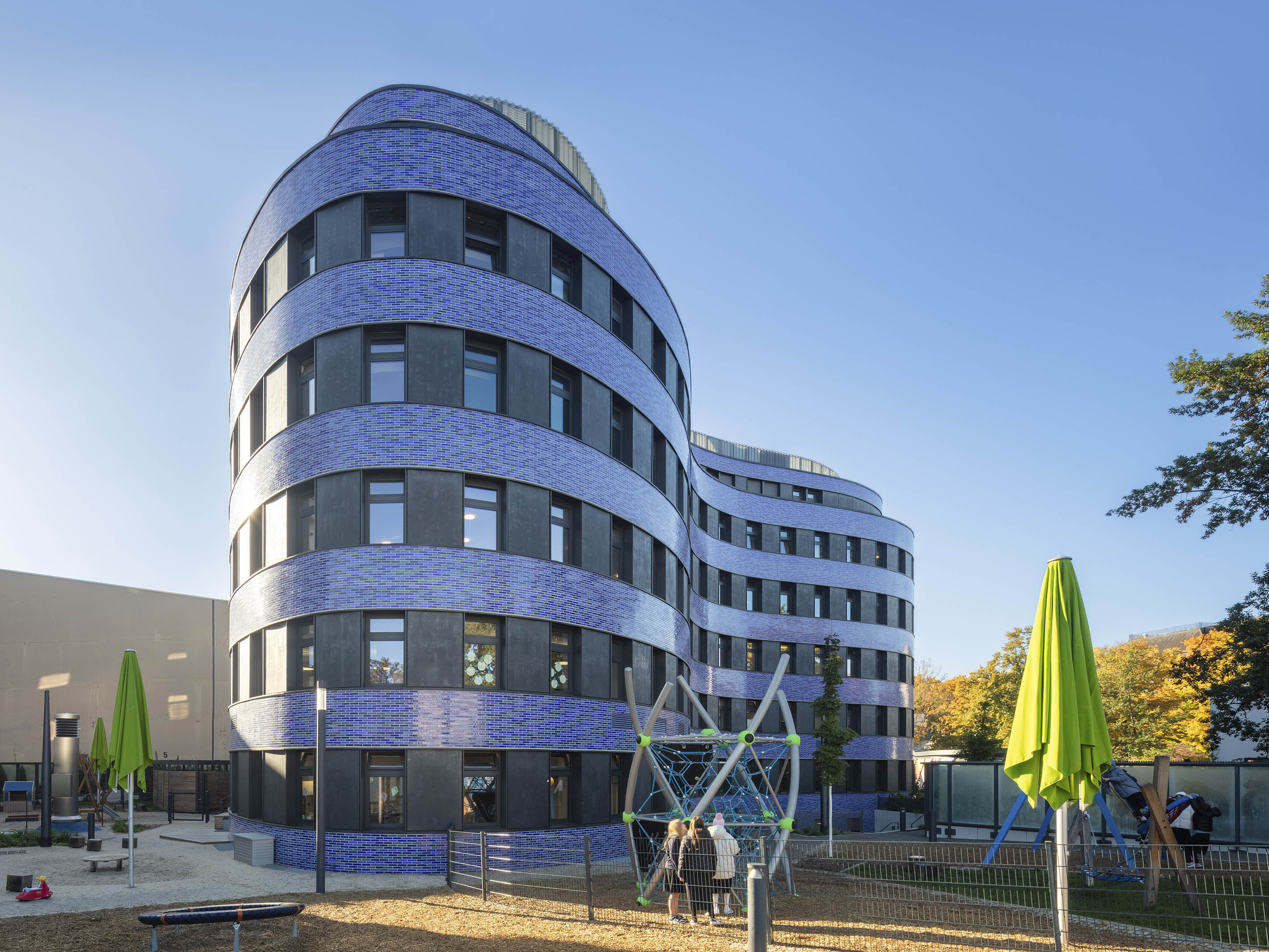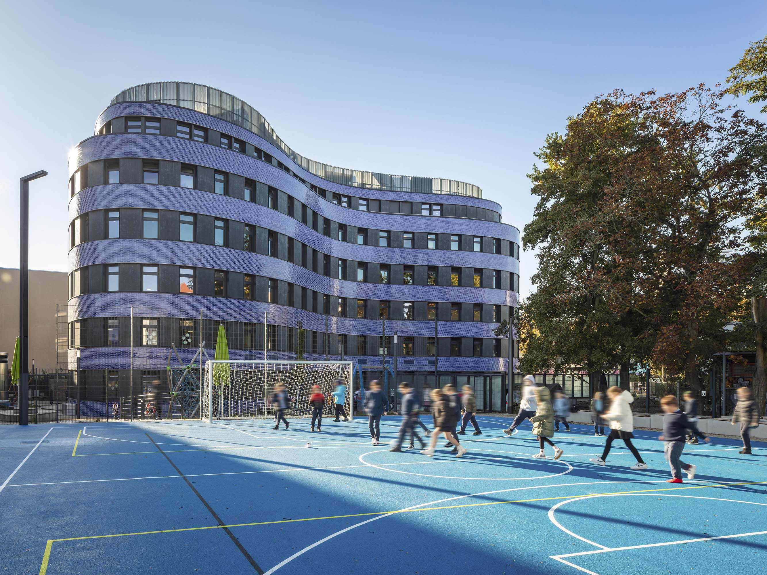 The organically curved new school building is reminiscent of a Torah scroll and is embedded in a green school garden with a variety of open spaces for different uses.
