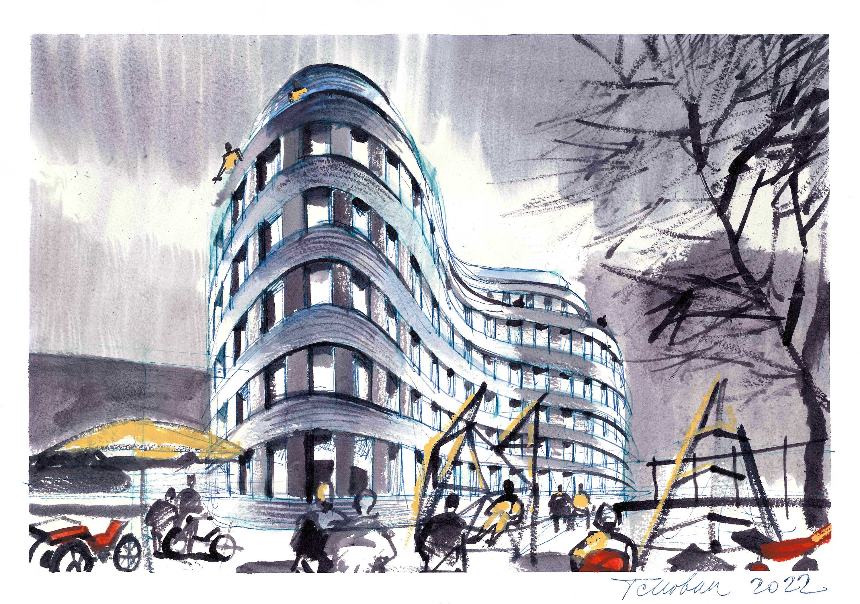 Constructed in masonry and concrete, the building immediately catches the eye with its colourfulness and materiality. This is where its name, “The Blue House’, comes from.