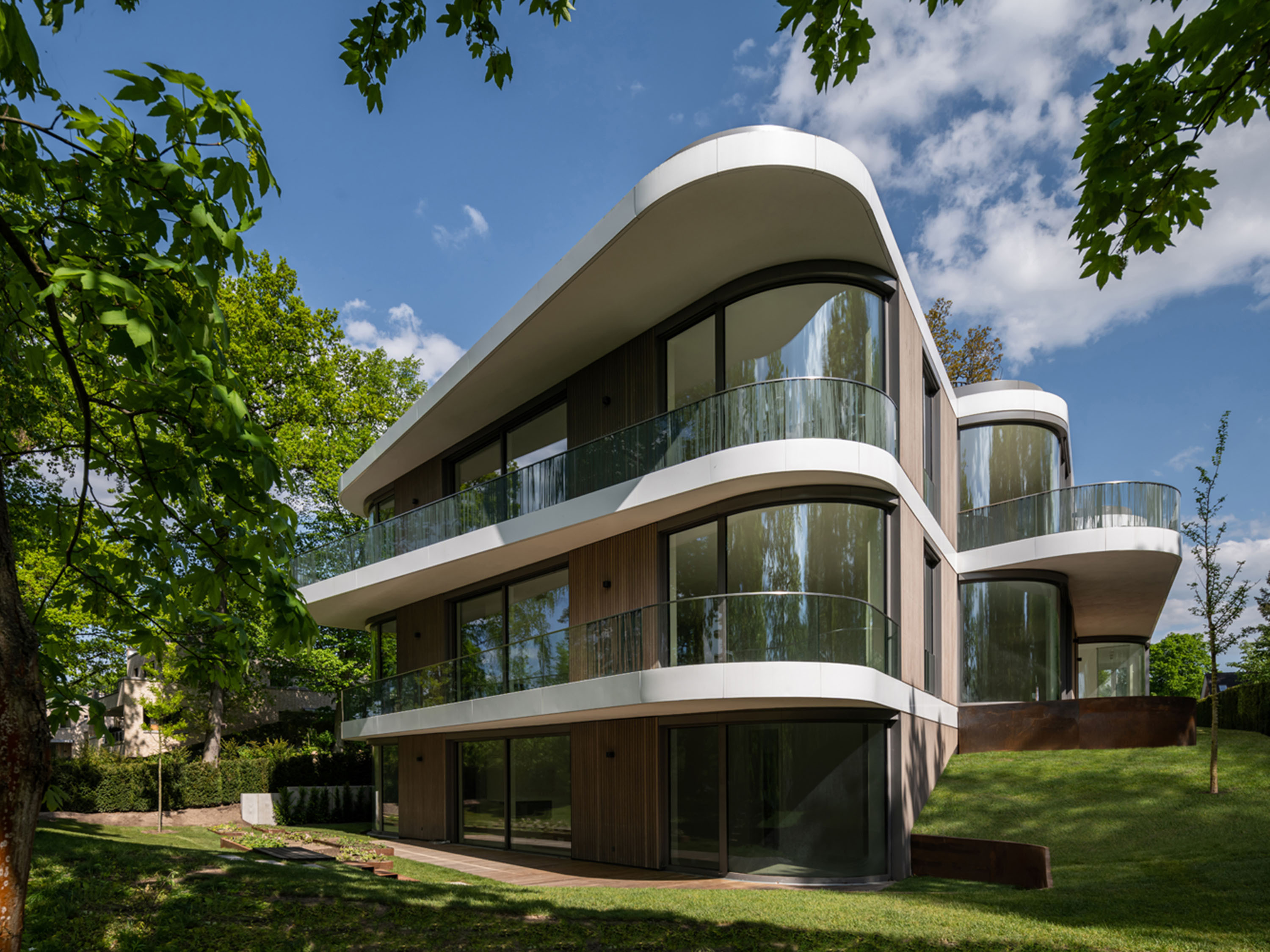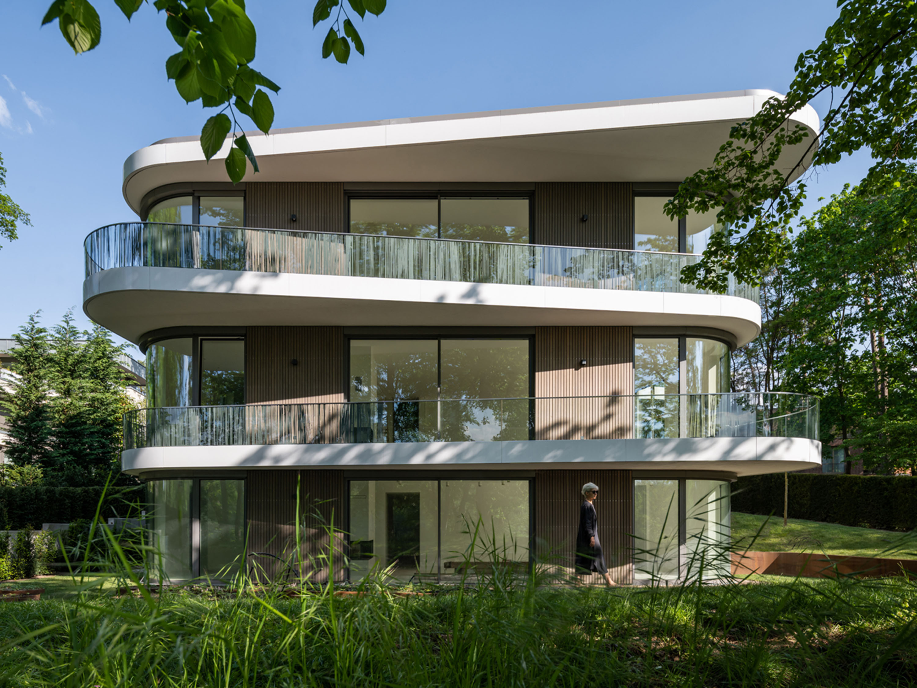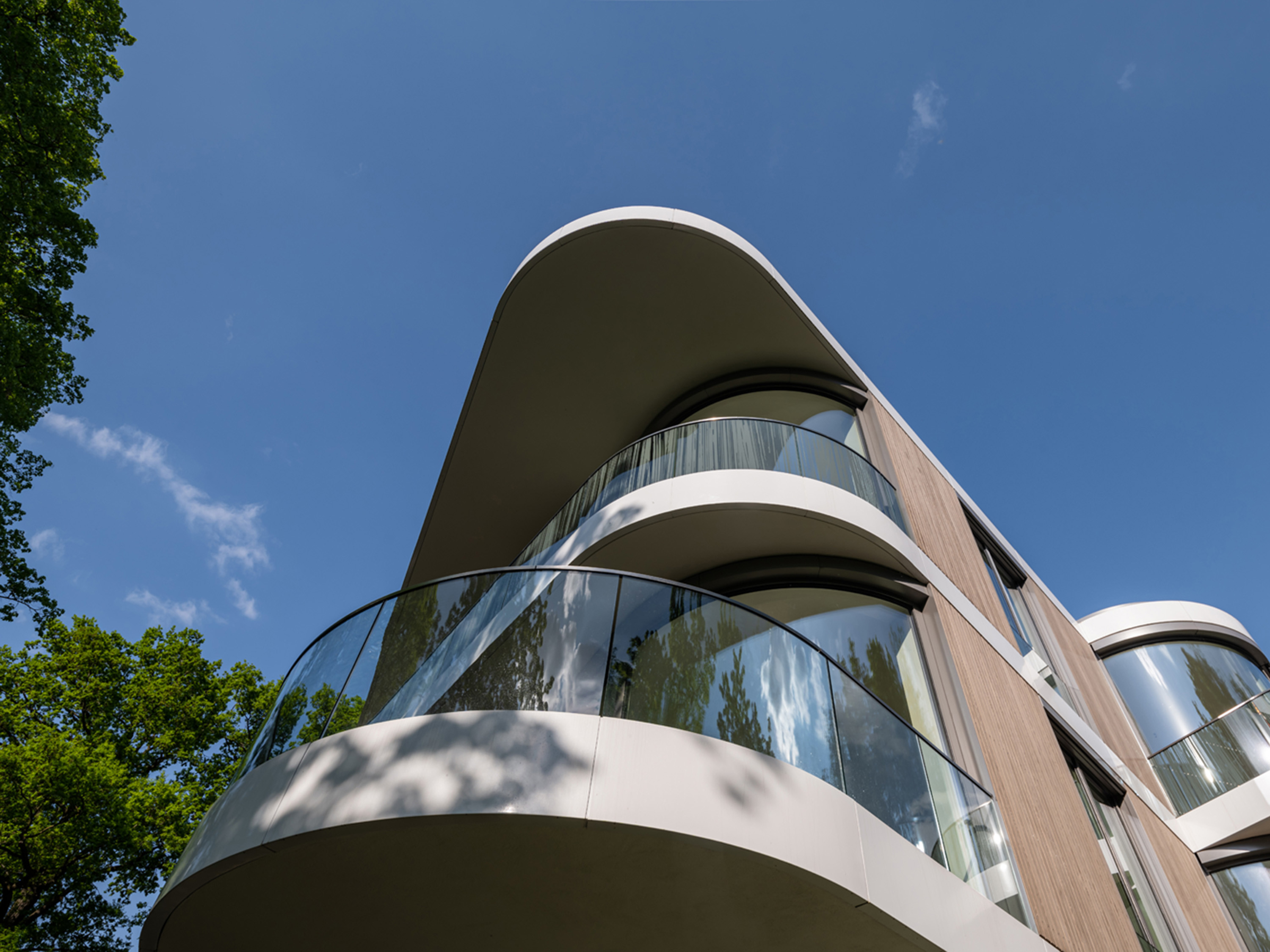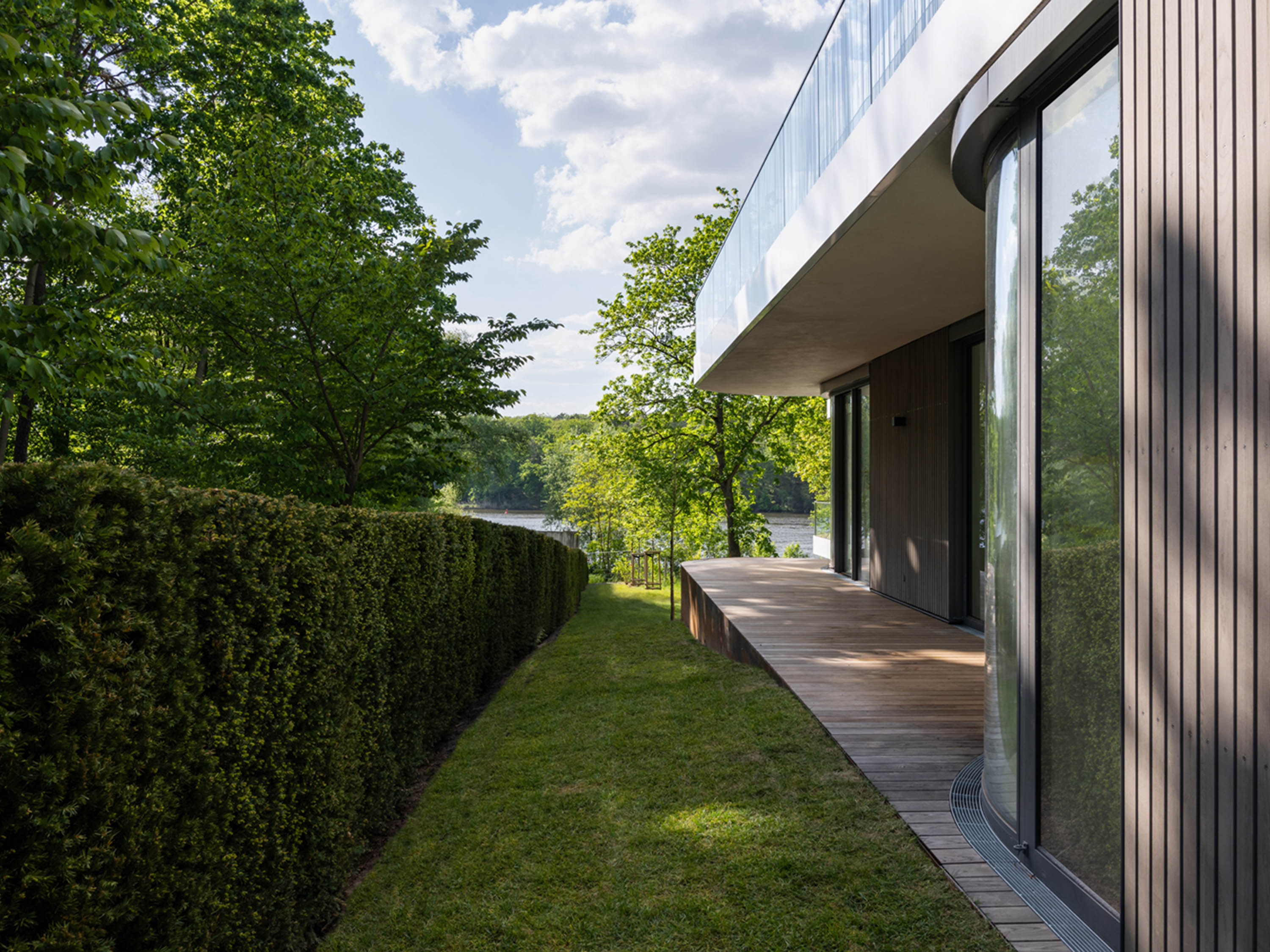 The building is volumetrically orientated to the geometry of the site and widens out in the direction of the riverbank. The shape of the building is stepped with sweeping curves that give the structure a visual structure. The height of the building and the arrangement of the storeys relate directly to the topography of the site, with its gradient towards the water.