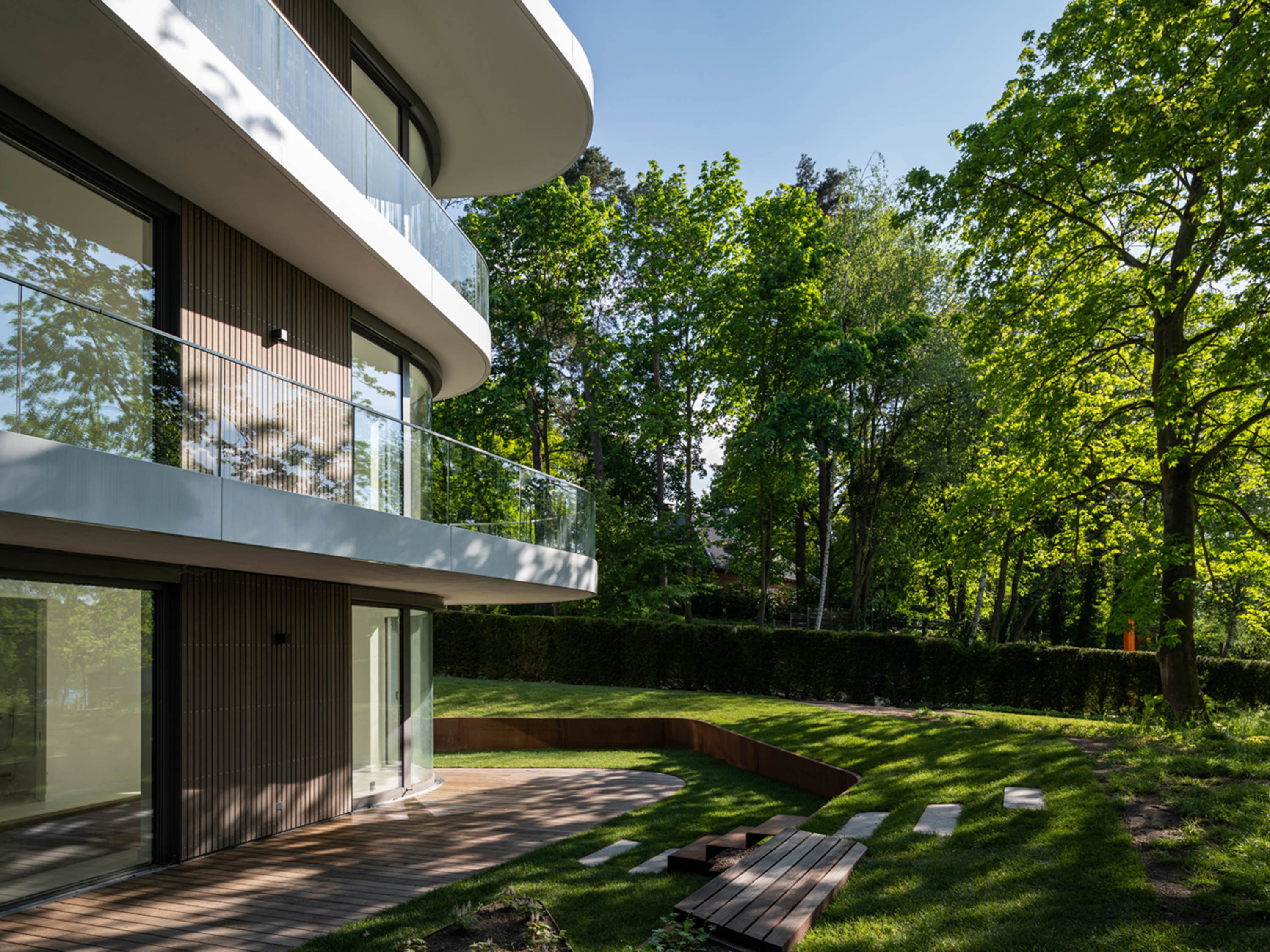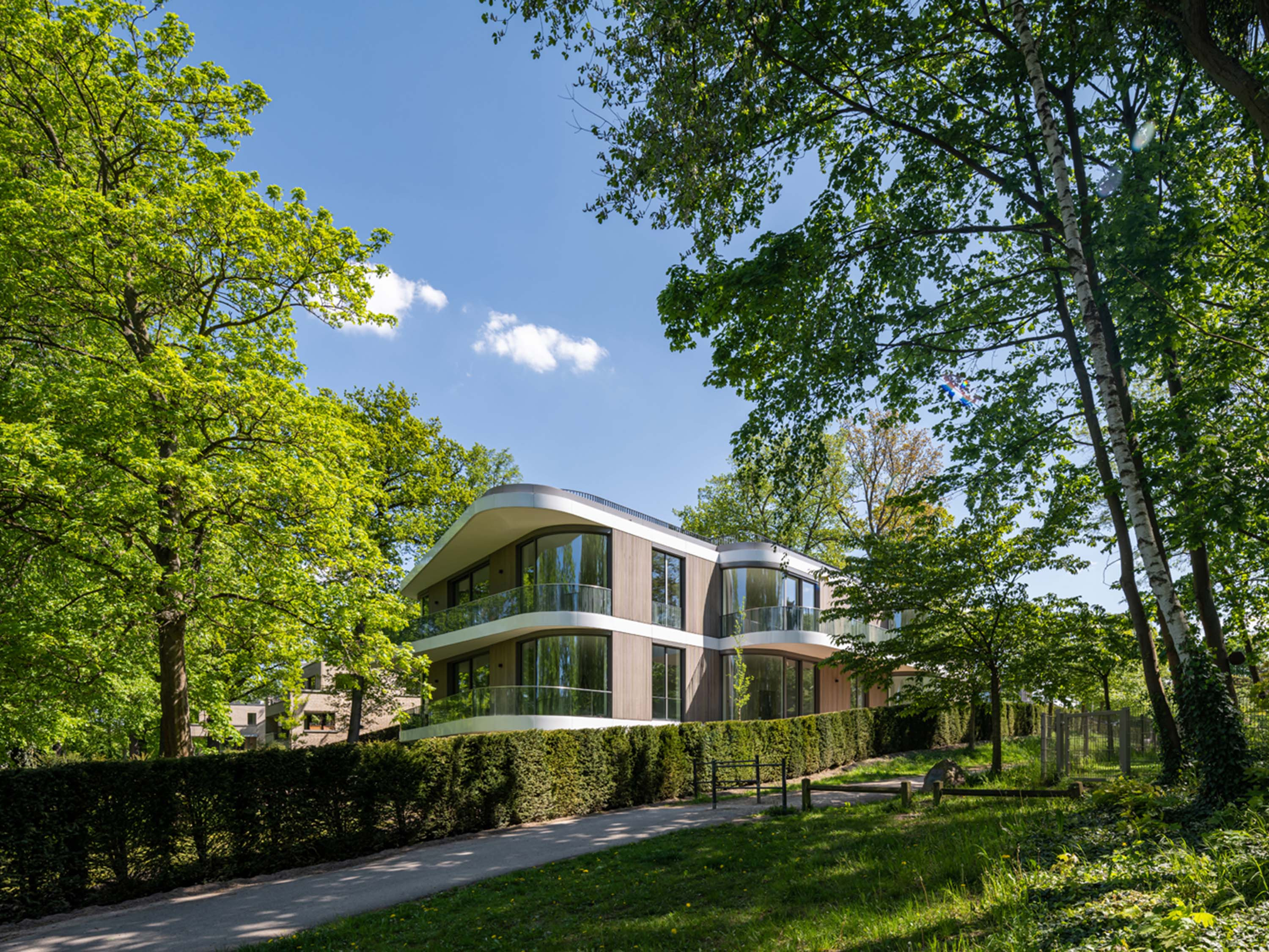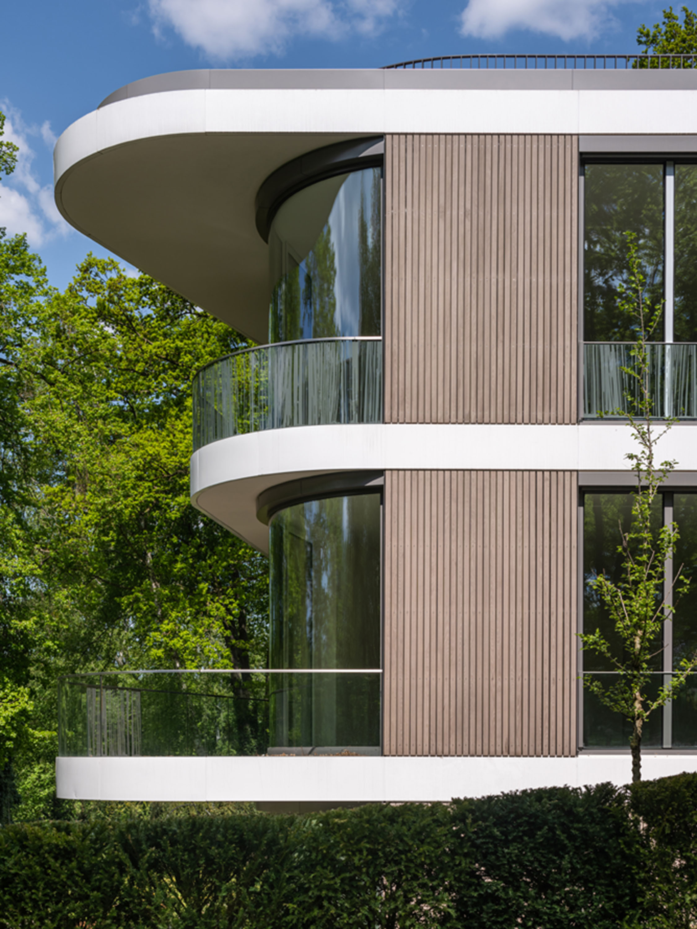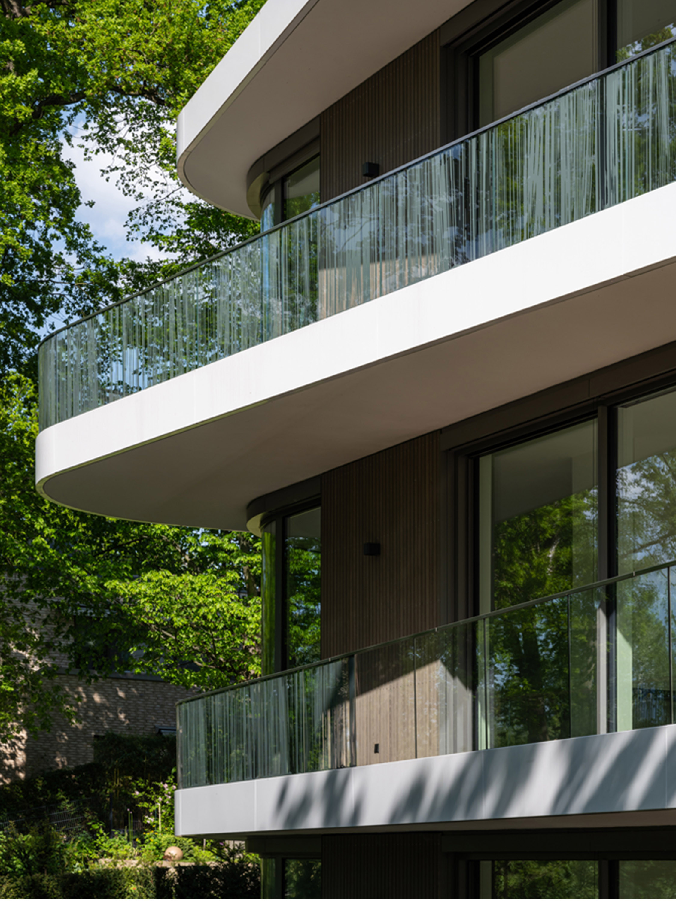 The rear-ventilated wooden façade made of rhombus mouldings in glazed thermo ash structures the façade vertically. The façade is divided horizontally by white, weather-resistant coated metal sheet strips. The expressive window curves and protruding balconies further accentuate the façade and the shape of the building, allowing generous views of Lake Griebnitzsee and bringing the surrounding nature into the interior of the building.
