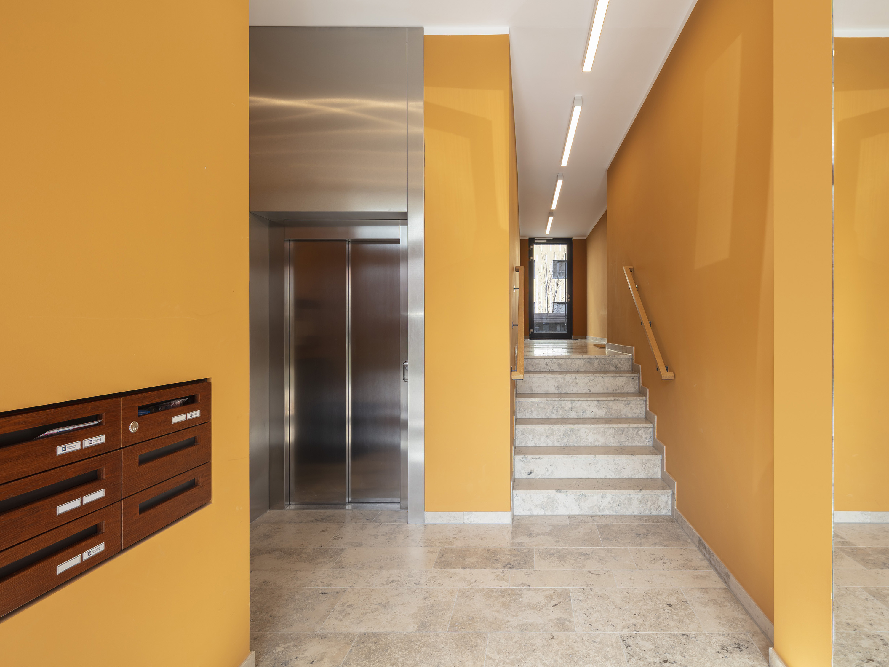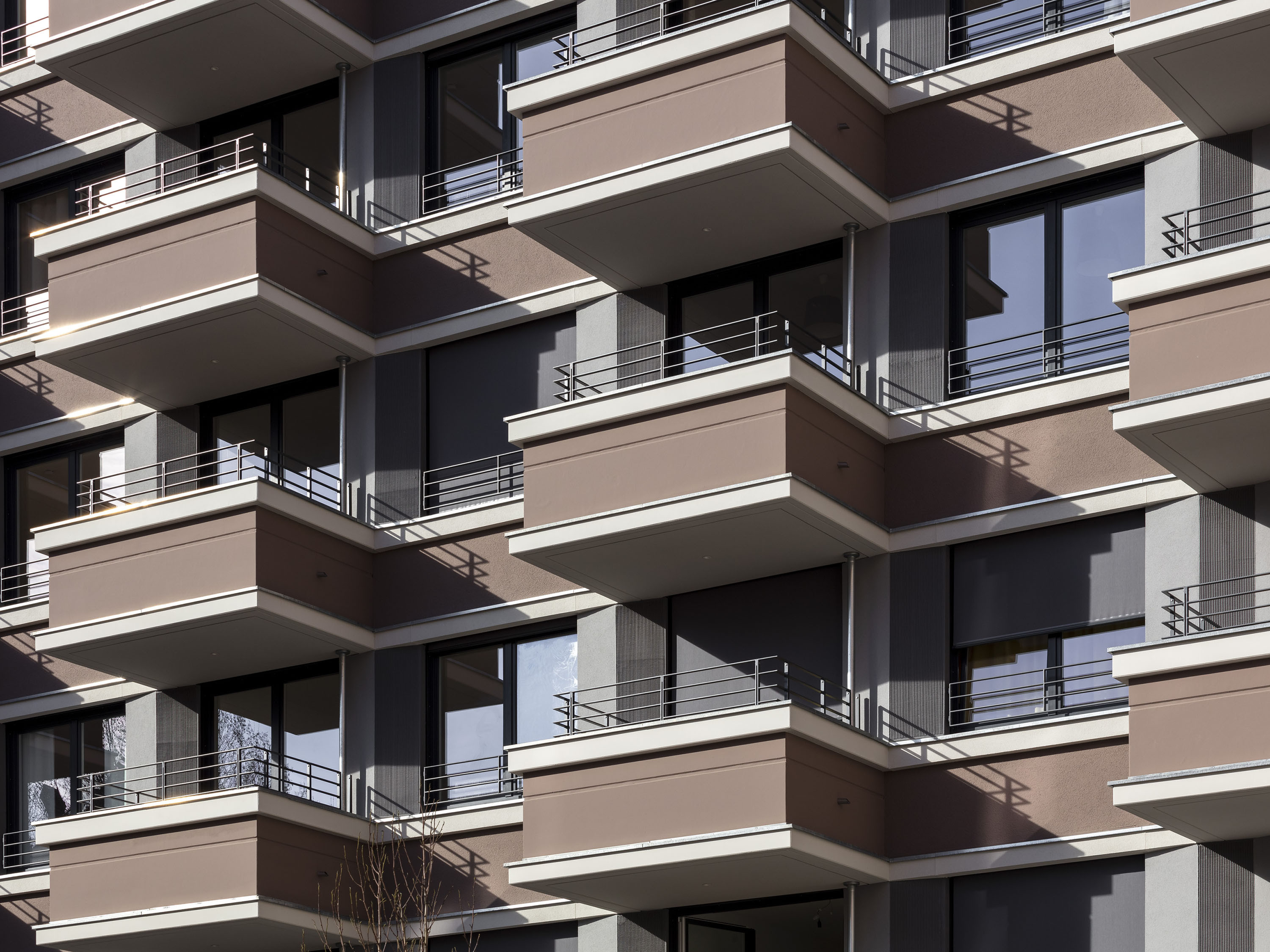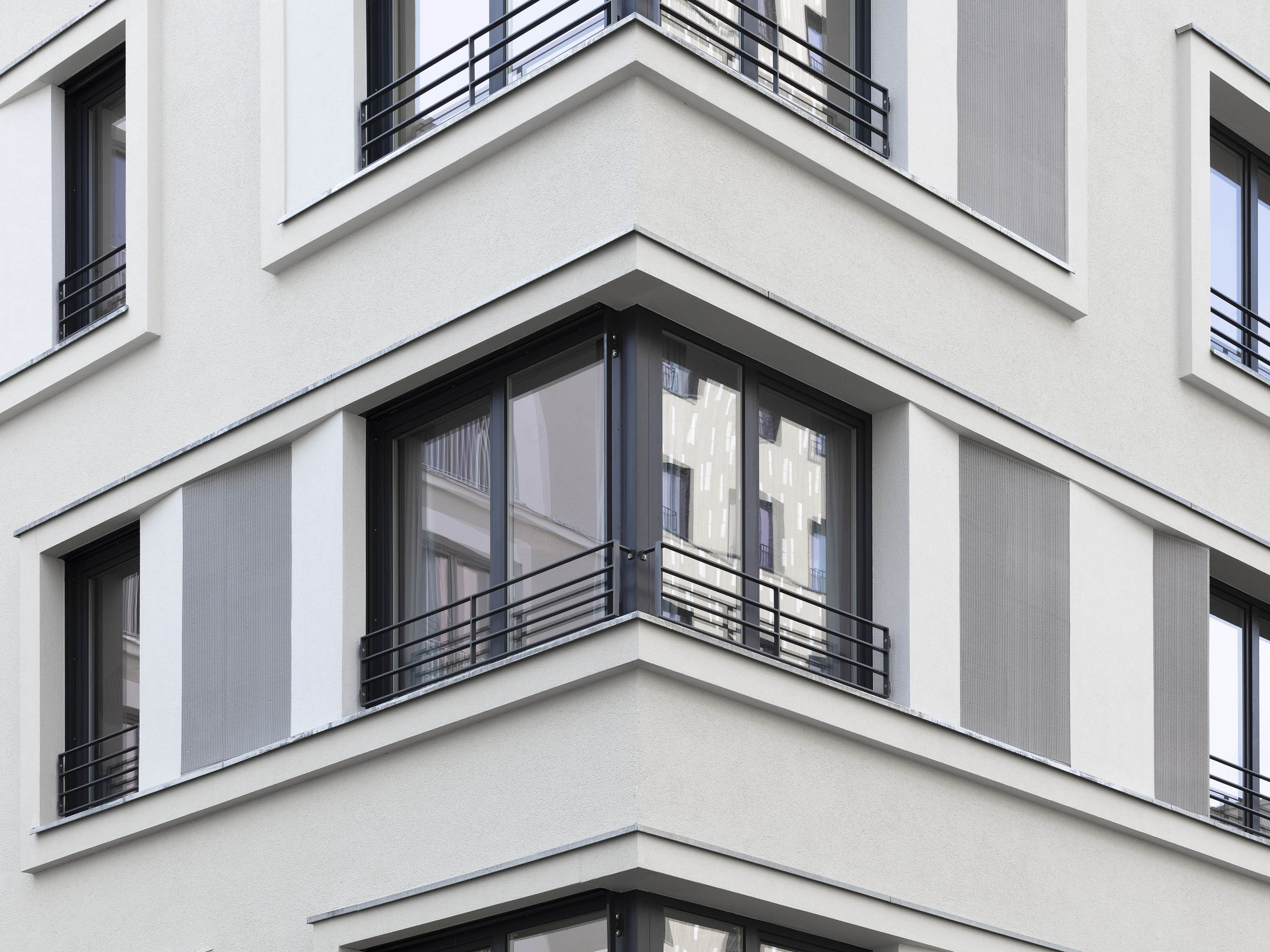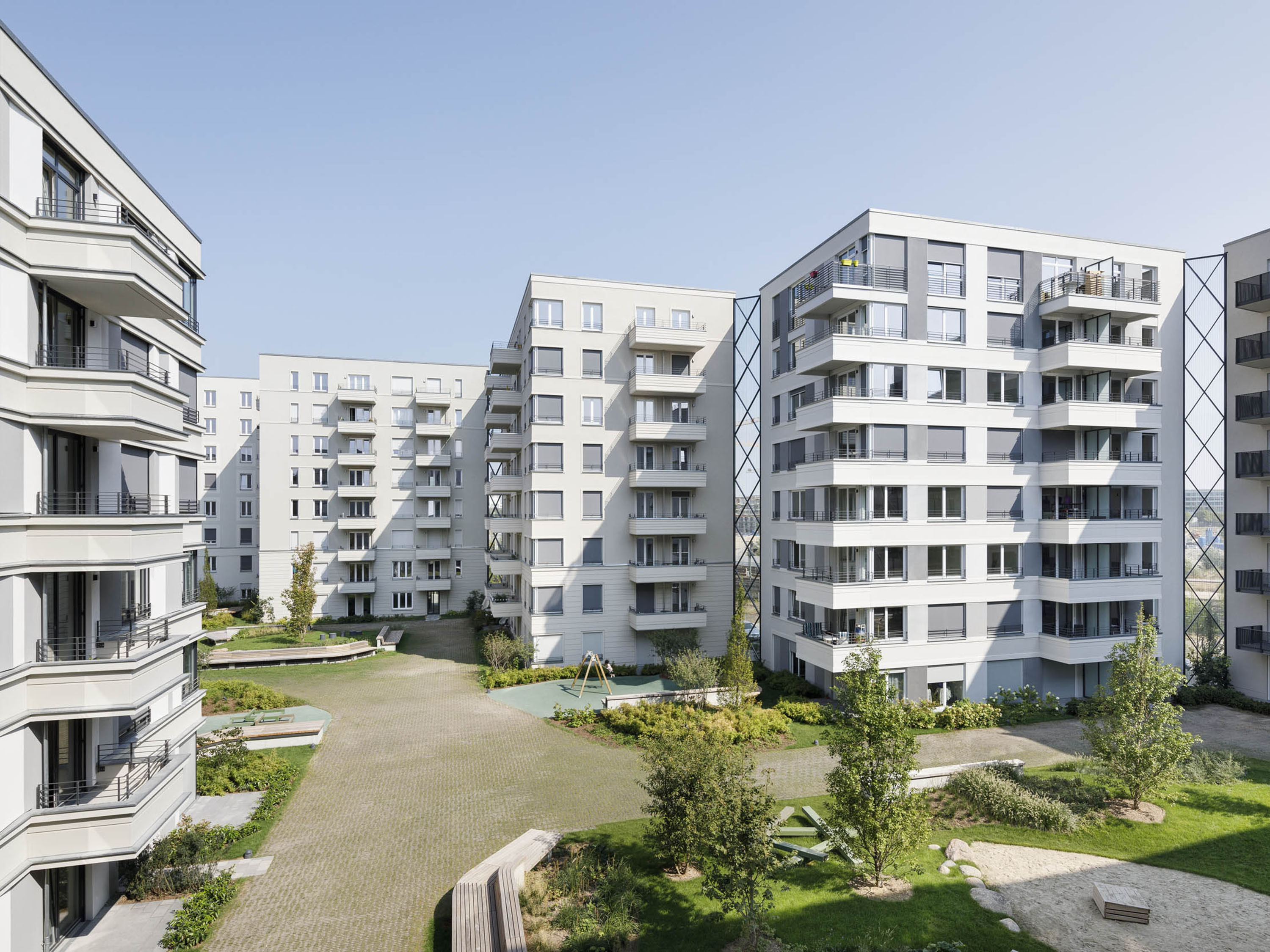 While the colour palette of the facades facing the streets is dominated by stronger tones such as terracotta and yellow, the houses facing the inner courtyard are a simple combination of white and light grey. This serene appearance harmonizes with the green and play areas in the courtyard.