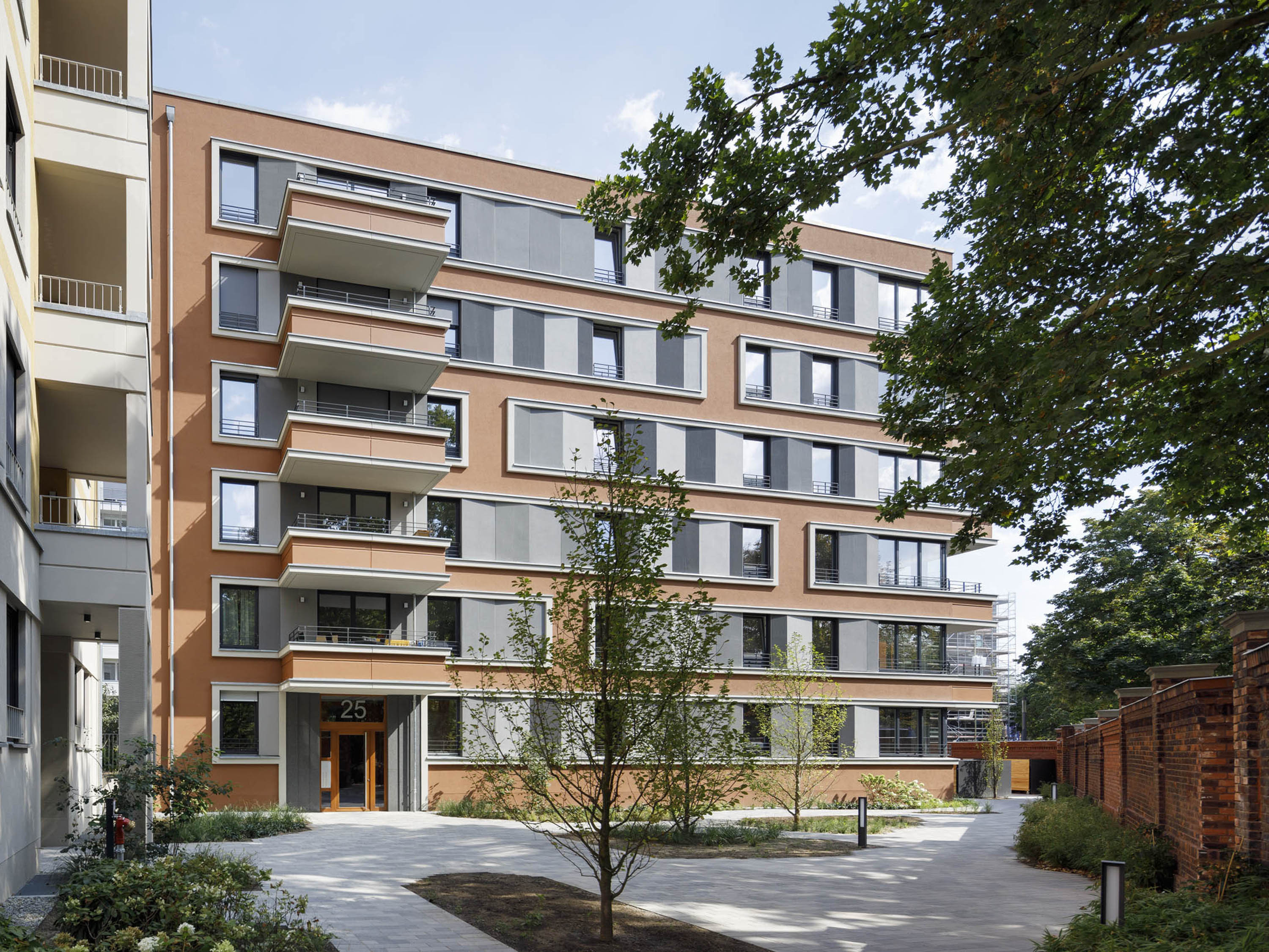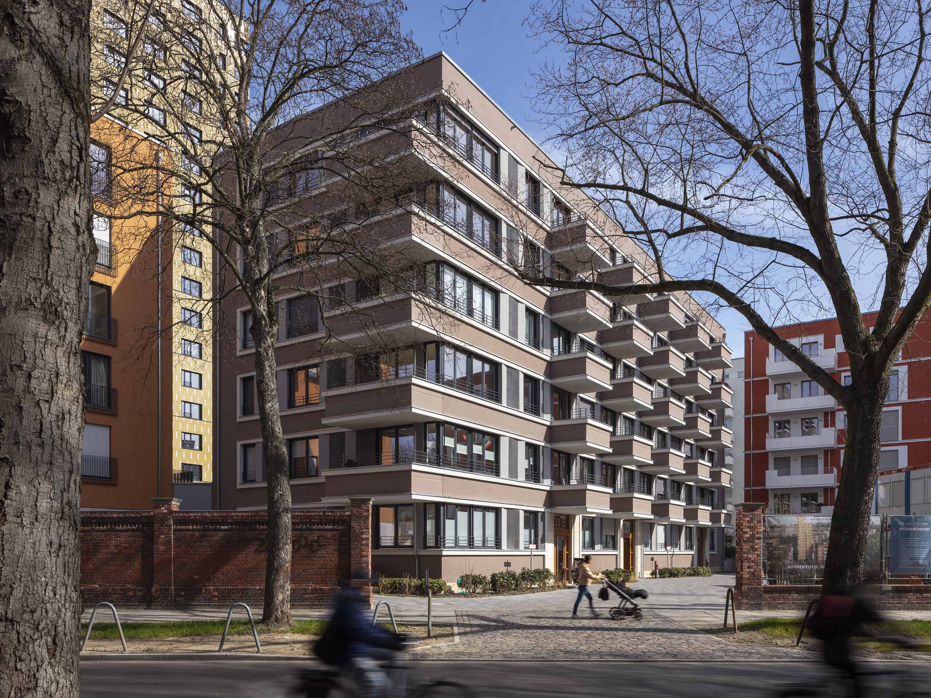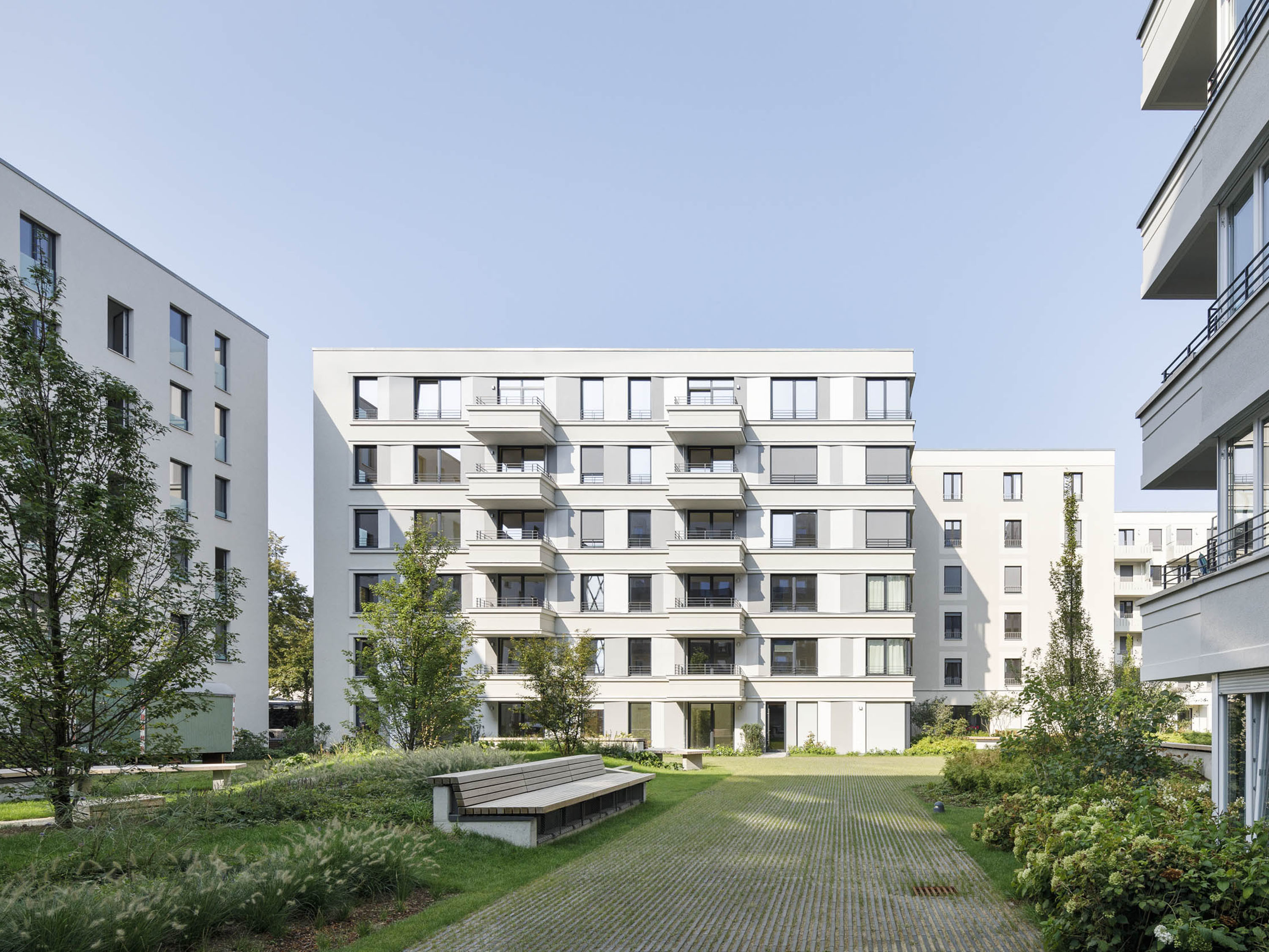 Within the acute-angled building arrangement, which is aligned on a north-south axis, four residential buildings planned by TCHOBAN VOSS Architekten with six to eight storeys are joined at right angles to each other as four- and three-storey buildings, two of which belong to construction phase 1 and were already completed in 2018, and two others, belong to construction phase 2, in November 2019.