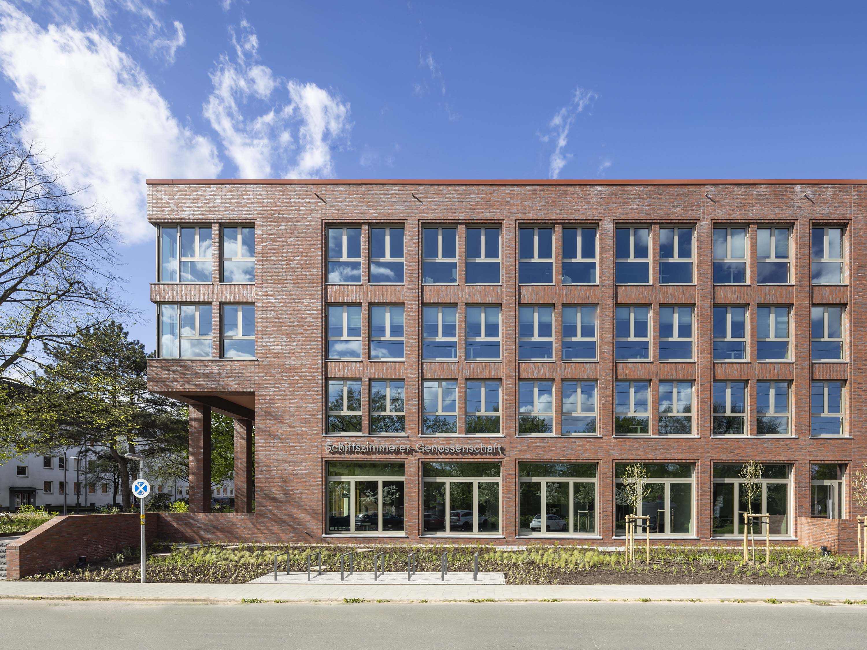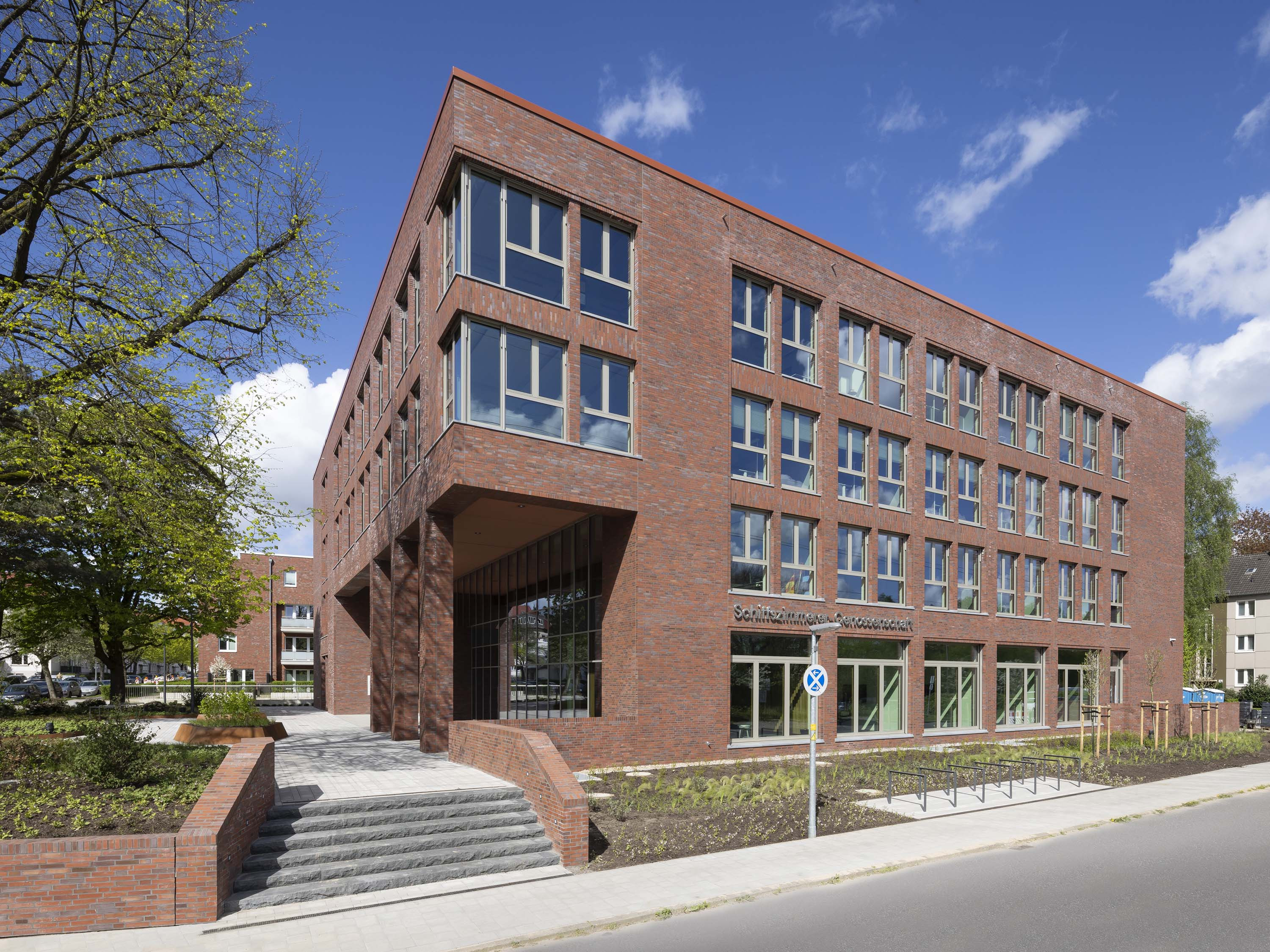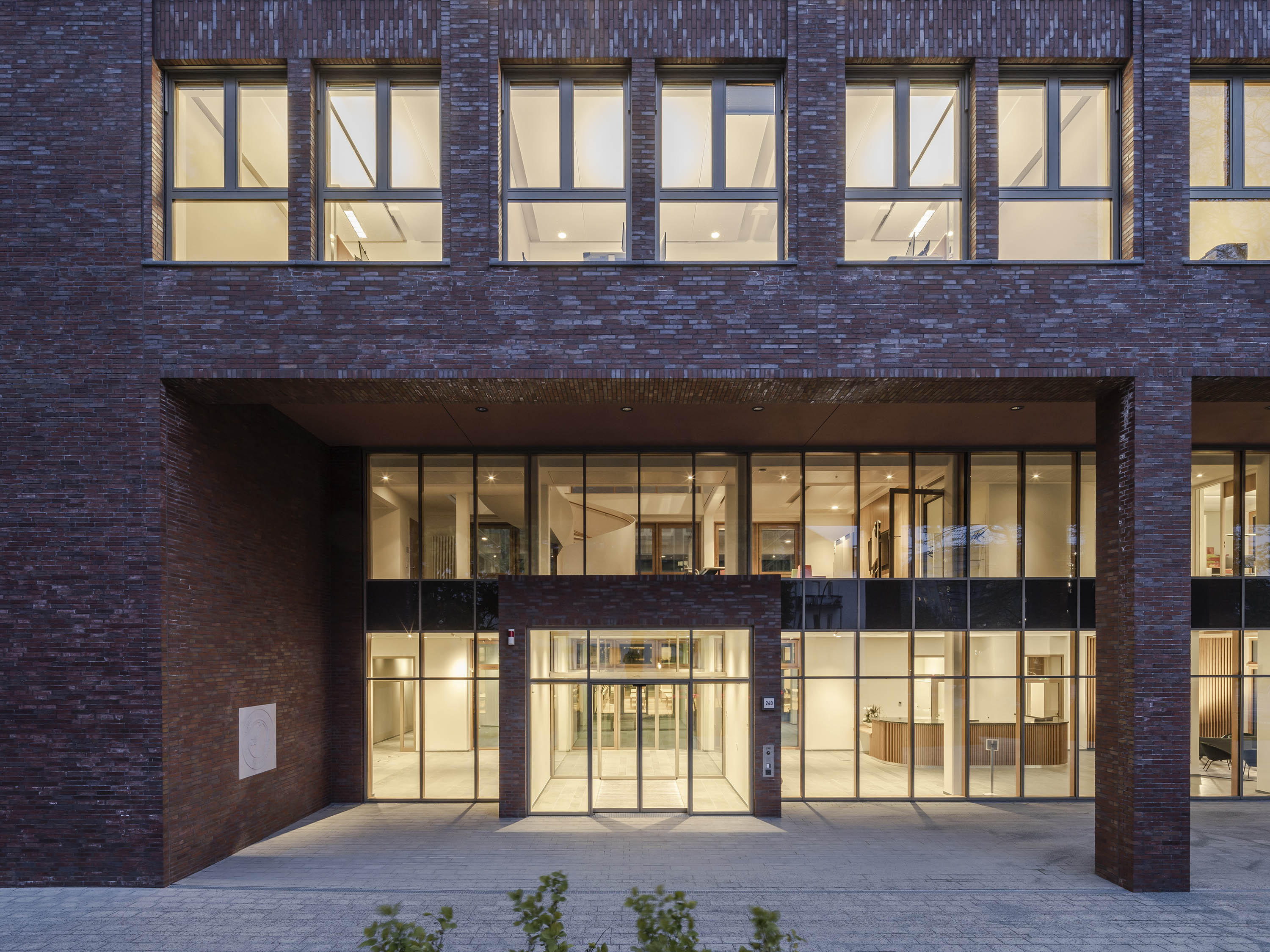 The entrance area to Ruebenkamp is characterised by a two-storey glass façade. The building façade consists of thin red-coloured facing bricks in front of sand-lime brick rear masonry, with dark grouting, coal-fired, in a wild bond. The facing brick around the windows is set back and set off with a rolled layer in areas between the windows.