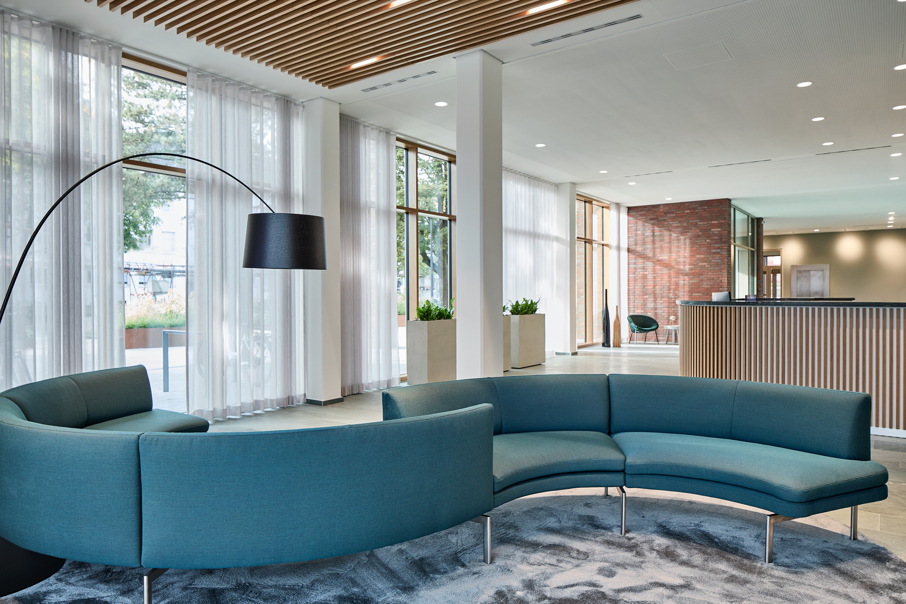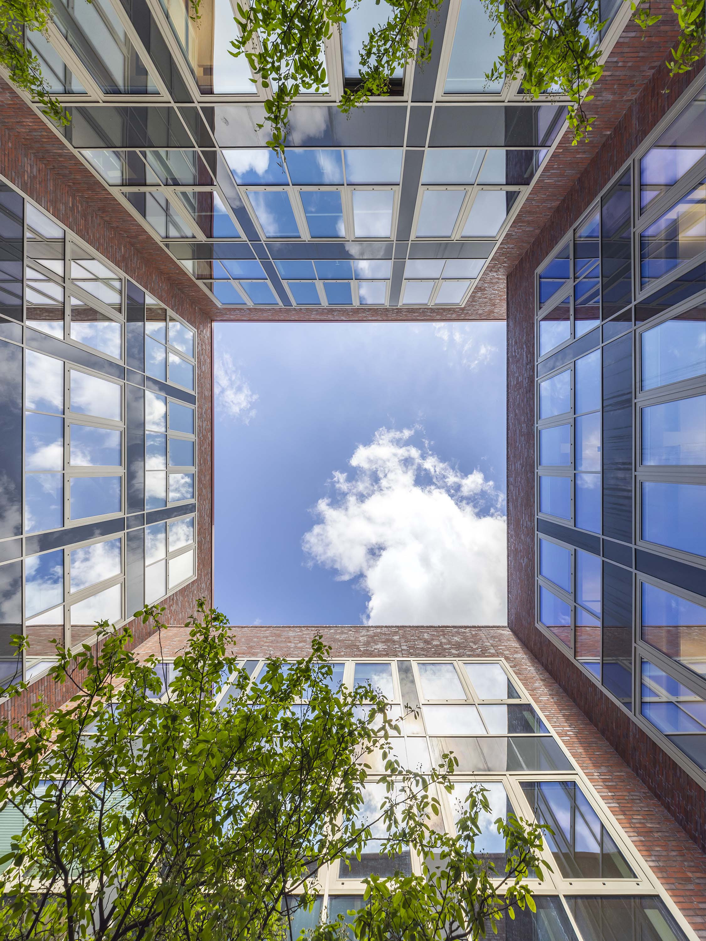 The office solitaire is a closed, three- to four-storey building with a large roof garden and underground car park. The almost square inner courtyard forms the centre of the building. This serves as a green oasis for employees and a prestigious location for guests.