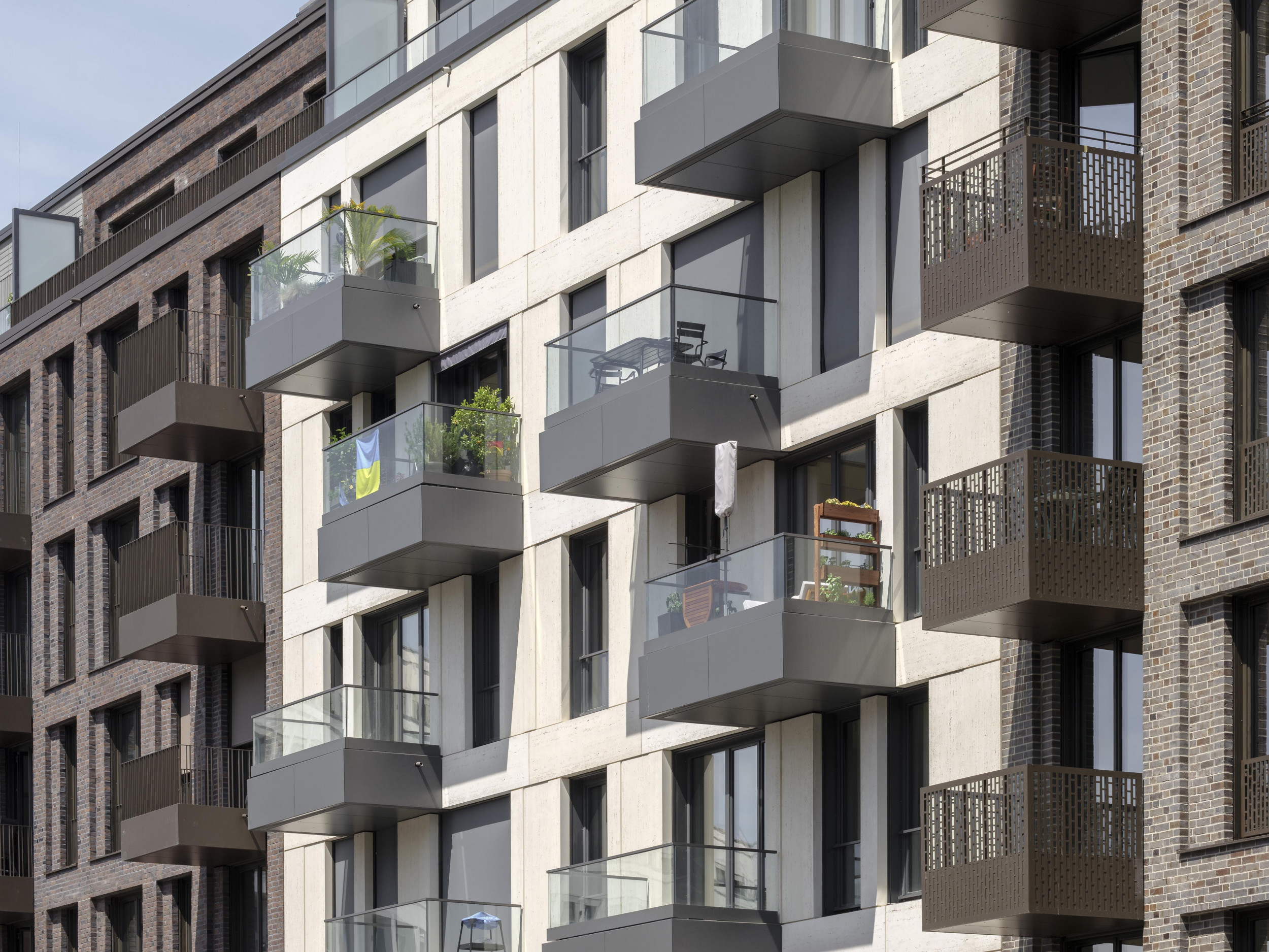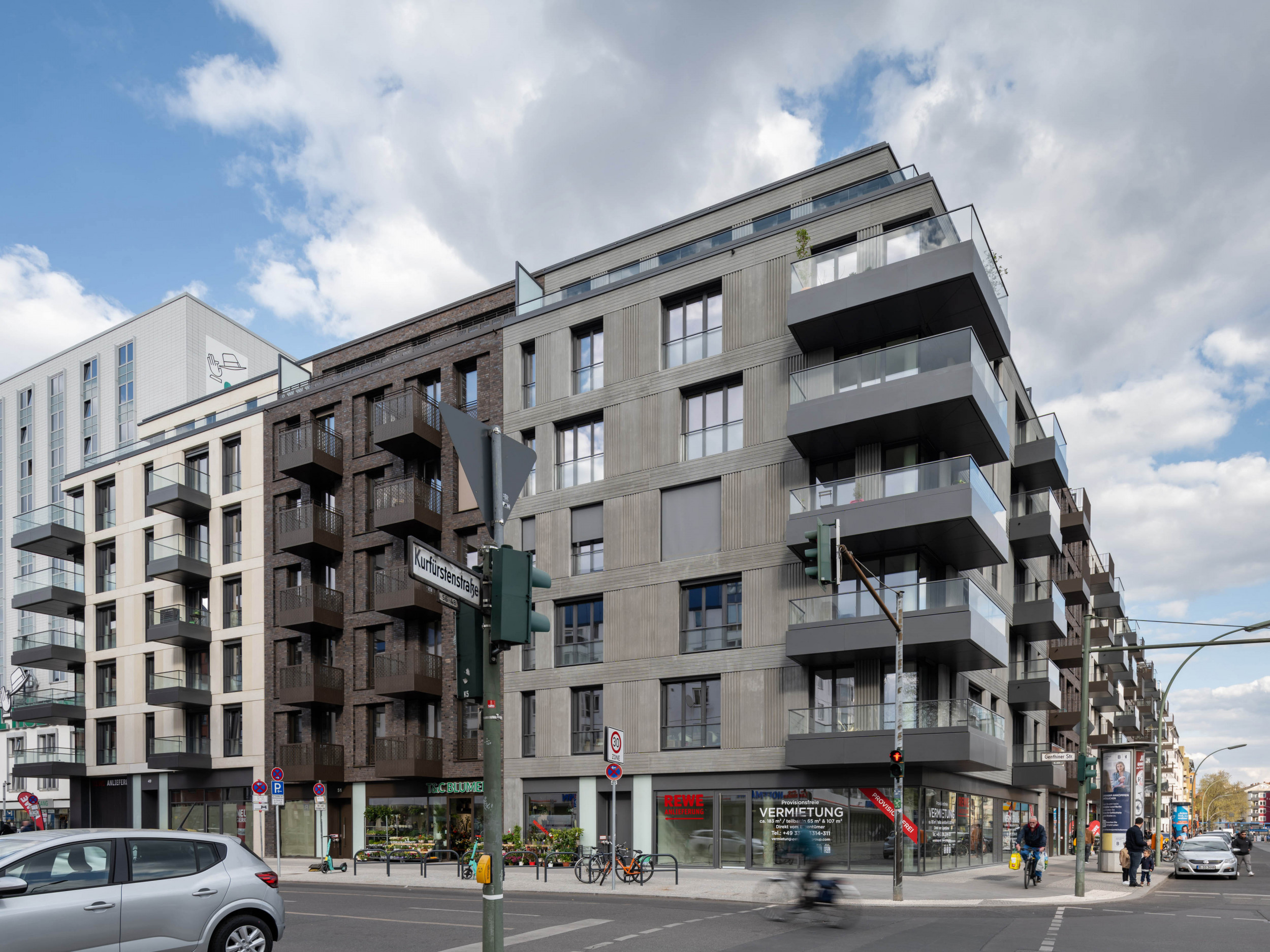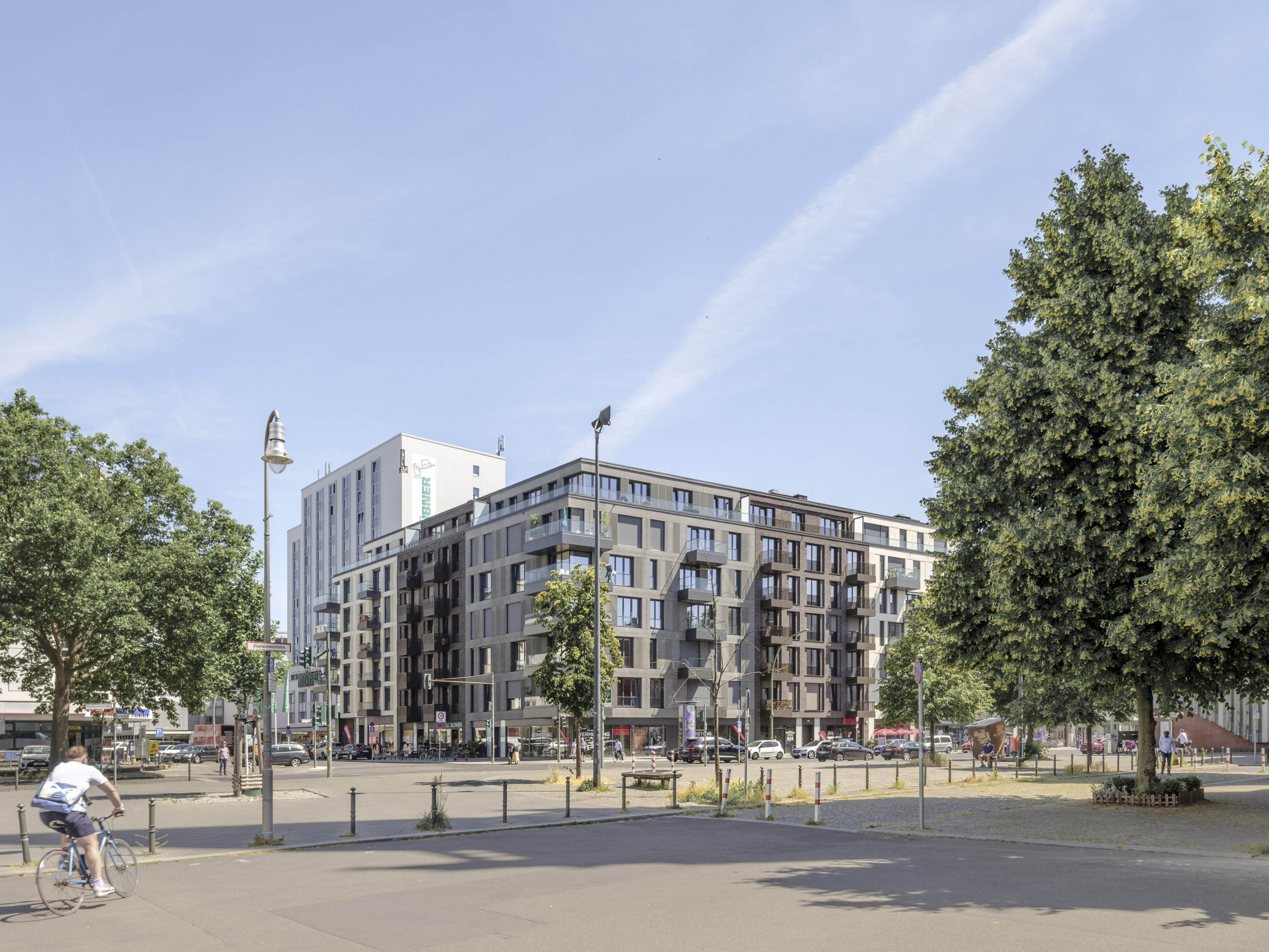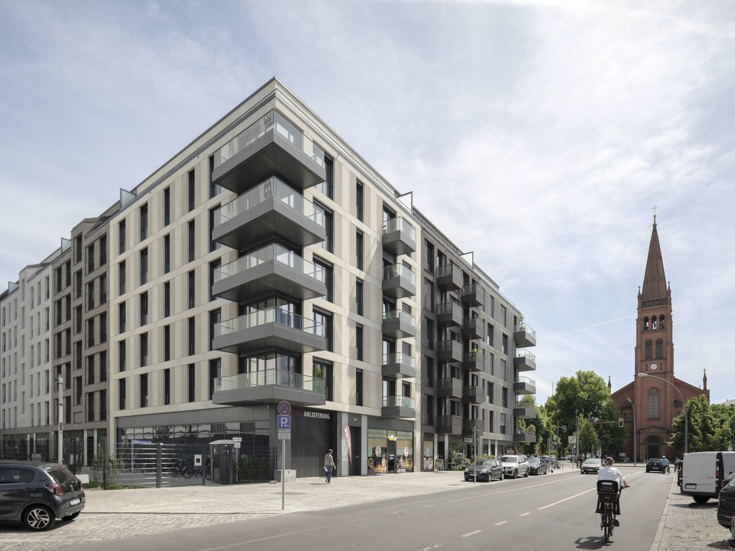 Architectural concrete and masonry are the basic materials for the façade design and are executed differently depending on the building. The design variety blends harmoniously into the street scene. The choice of individual materials for the multi-faceted facades is a reference to Berlin's architectural heritage: bricks, masonry in colour and pattern variations refer to church and industrial buildings, fluted plaster to the Wilhelminian period, exposed concrete and glass speak the language of today's Berlin.