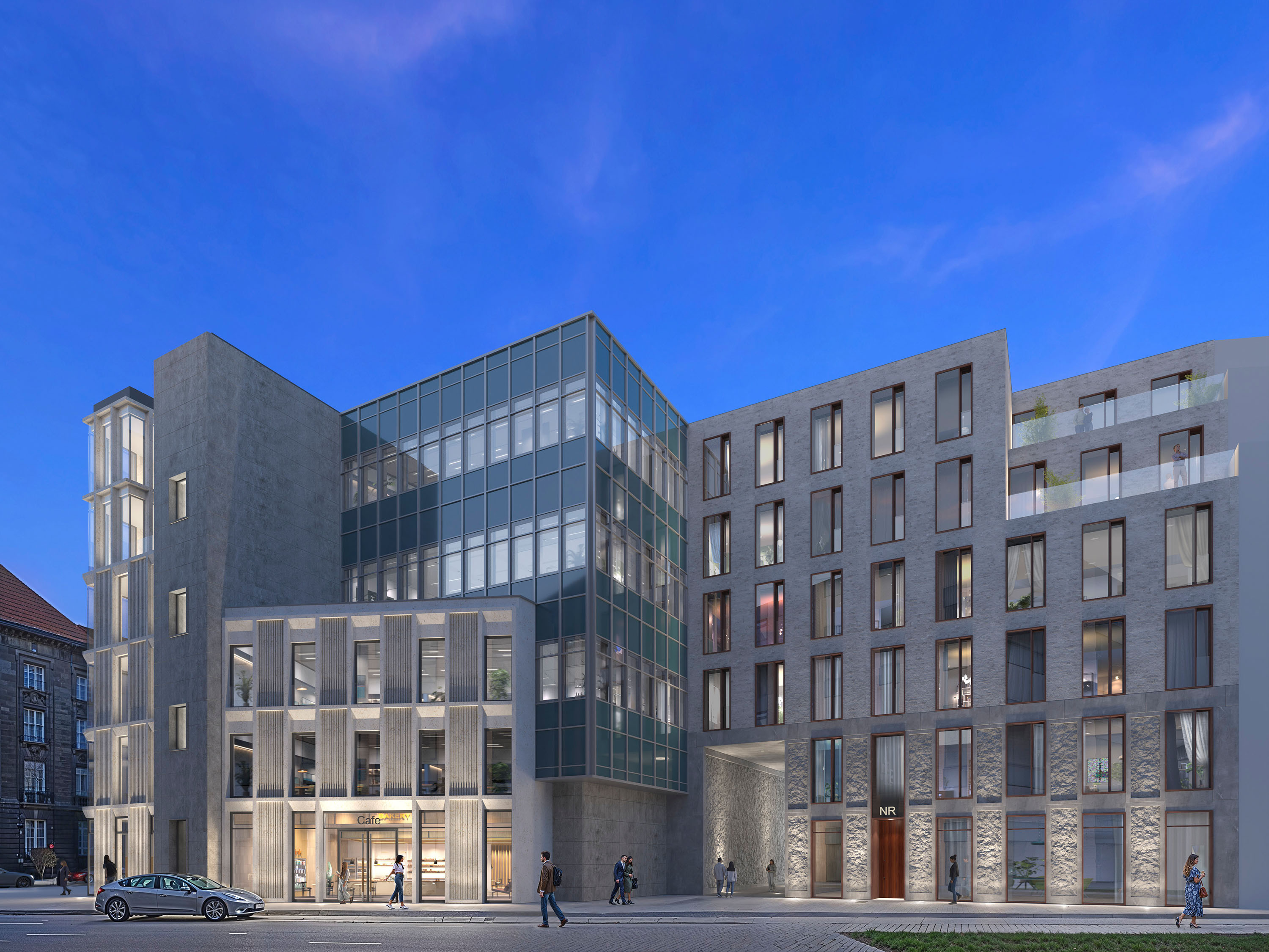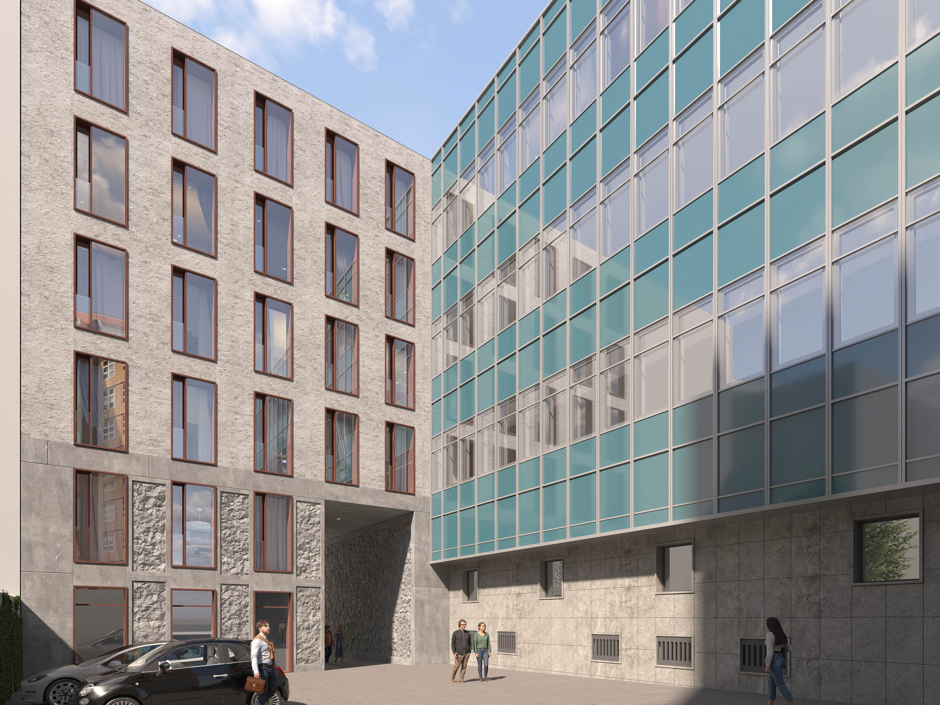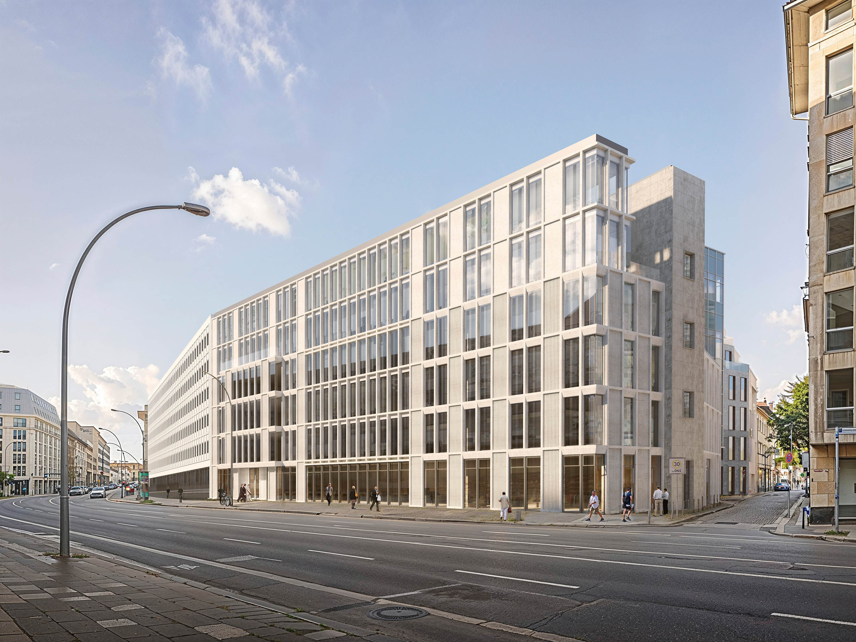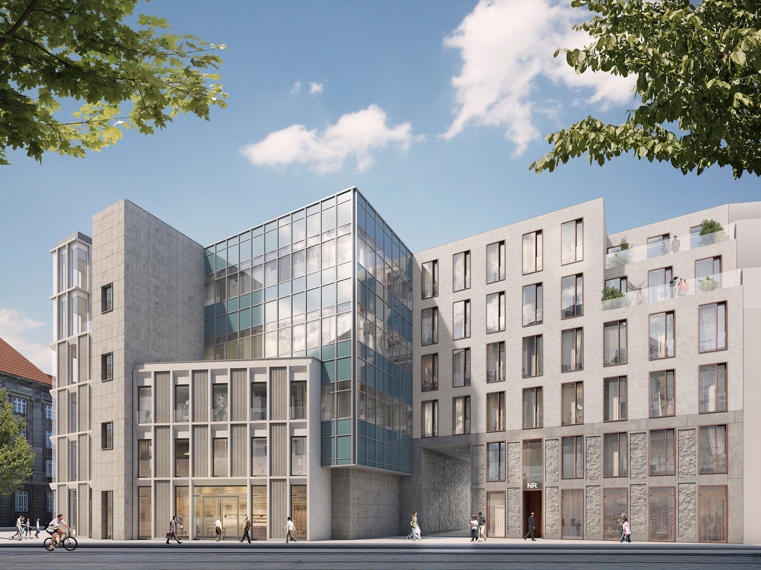 The project is divided into two construction phases and combines a sustainably revitalised existing building with high-quality new buildings. The heights and structures of the surrounding buildings are incorporated and complemented by contemporary staggered storeys.