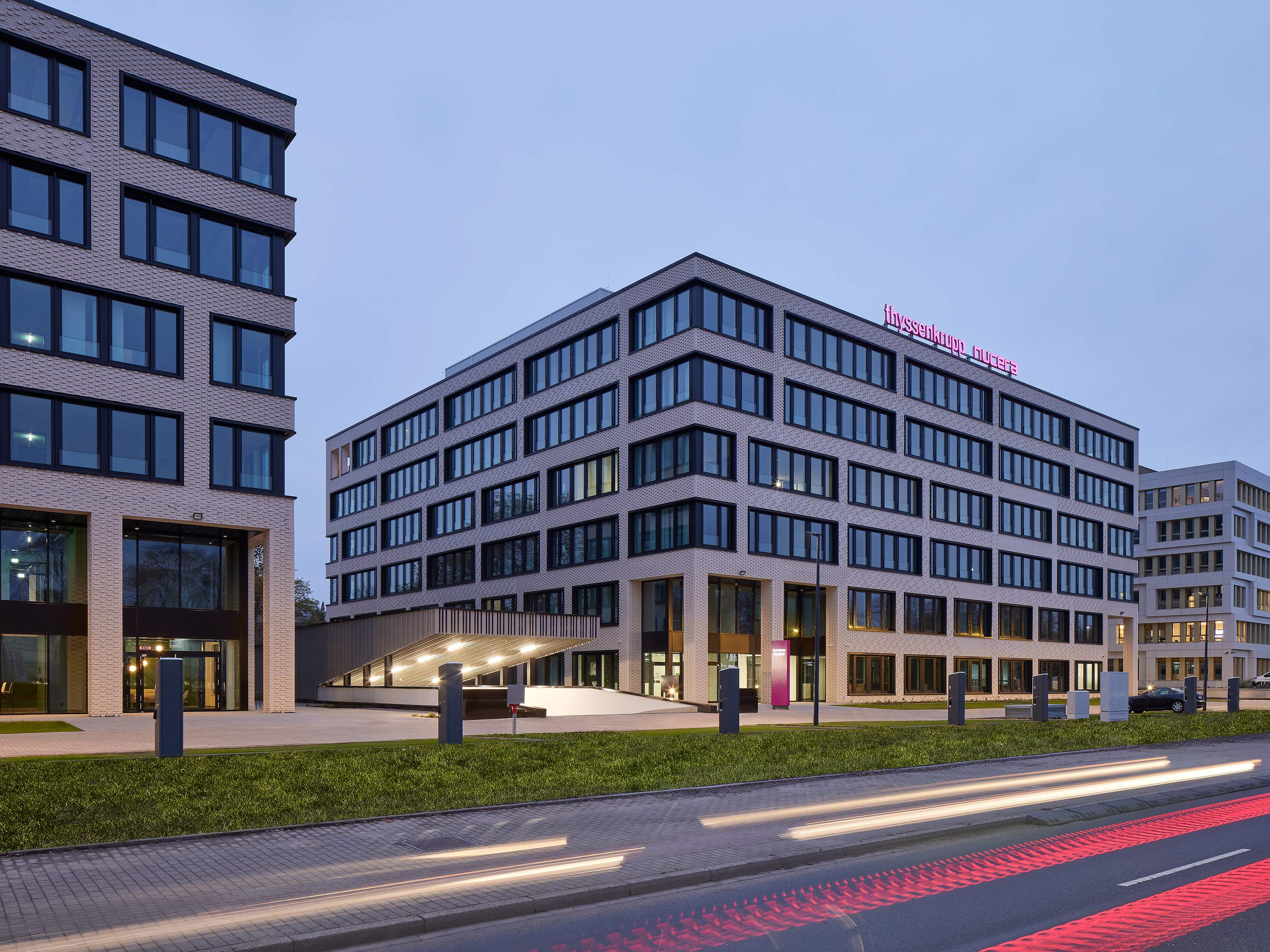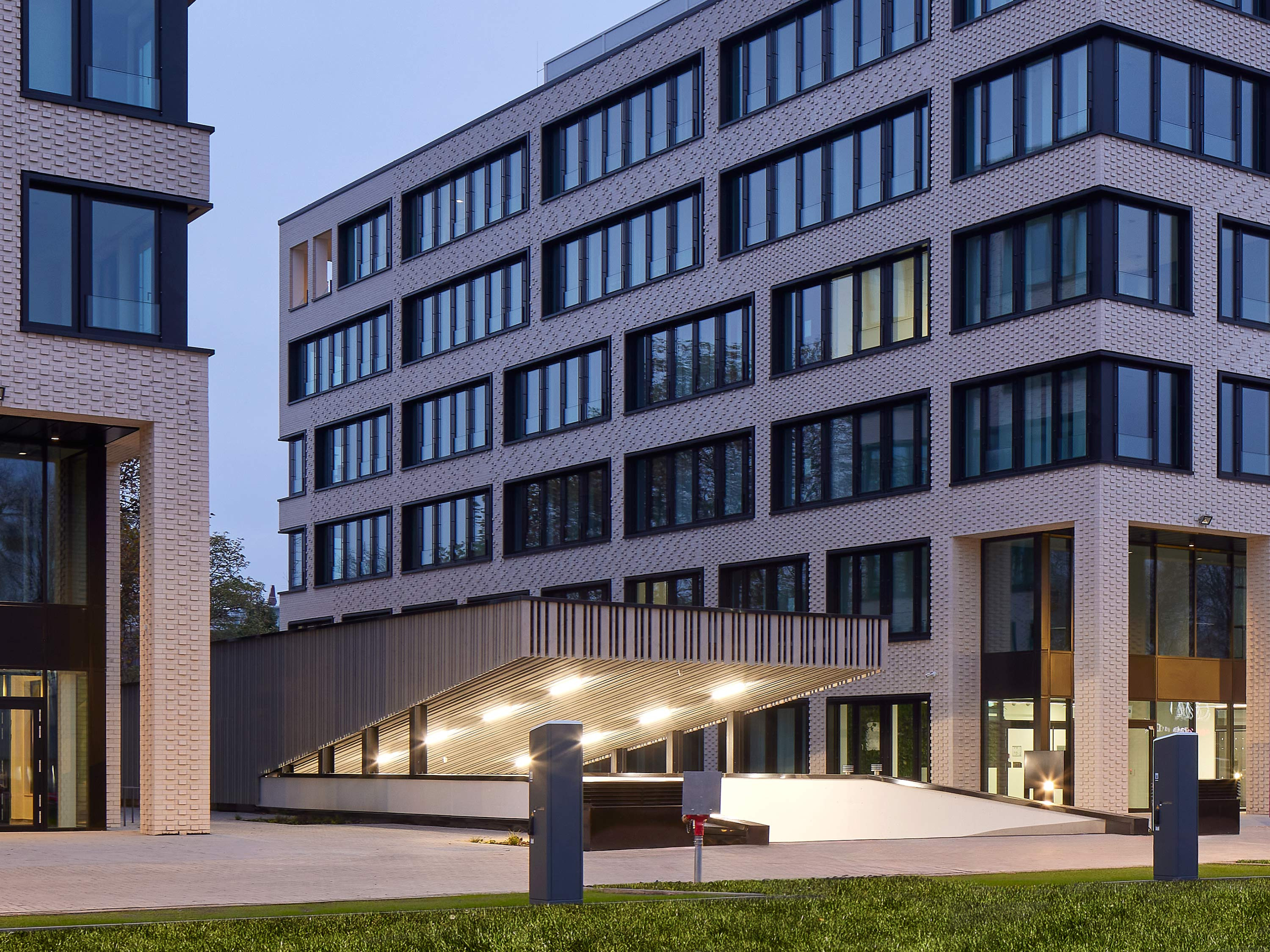 At the corners of the street façades, the first two storeys are set back and mark the main entrances.