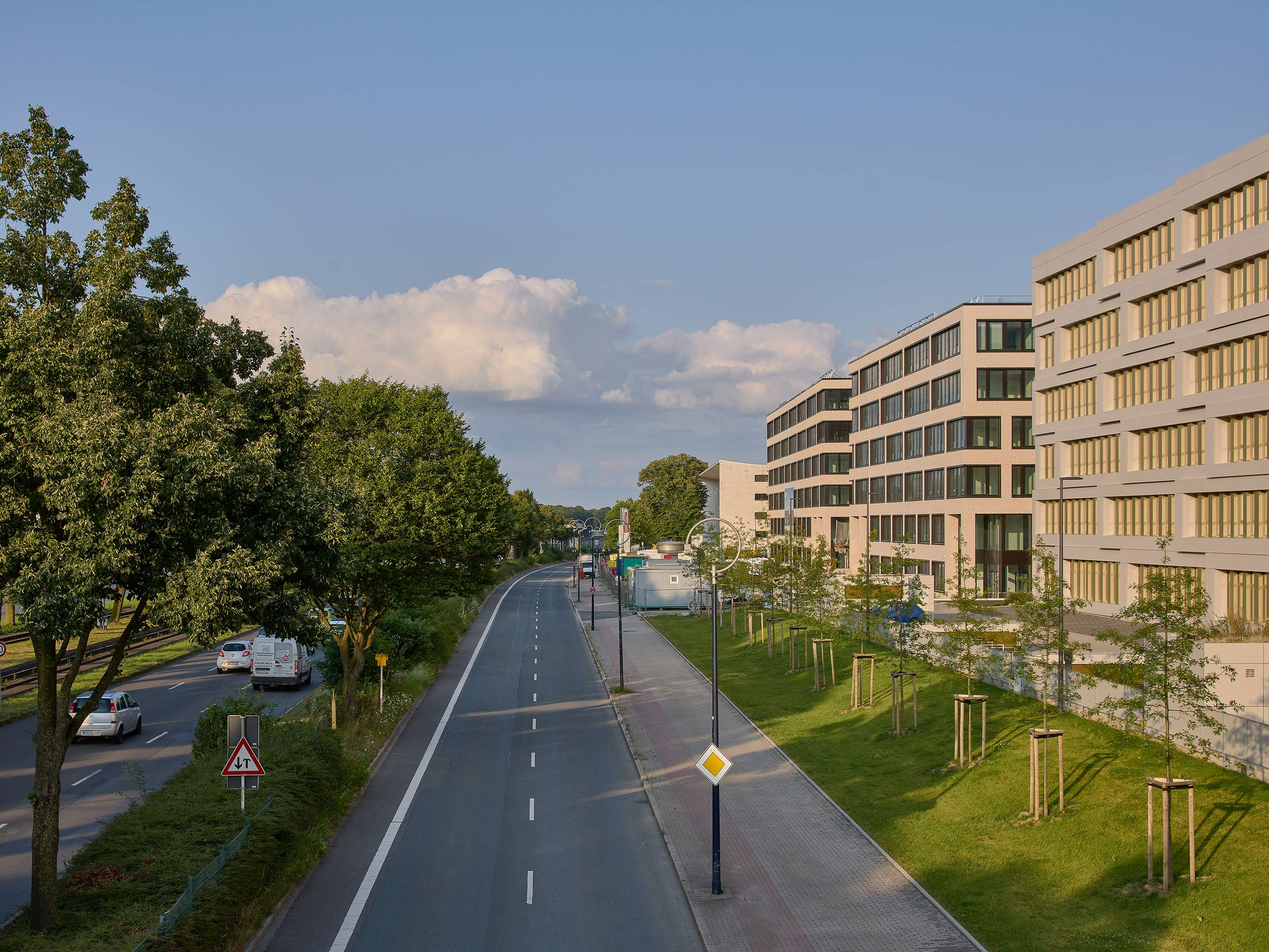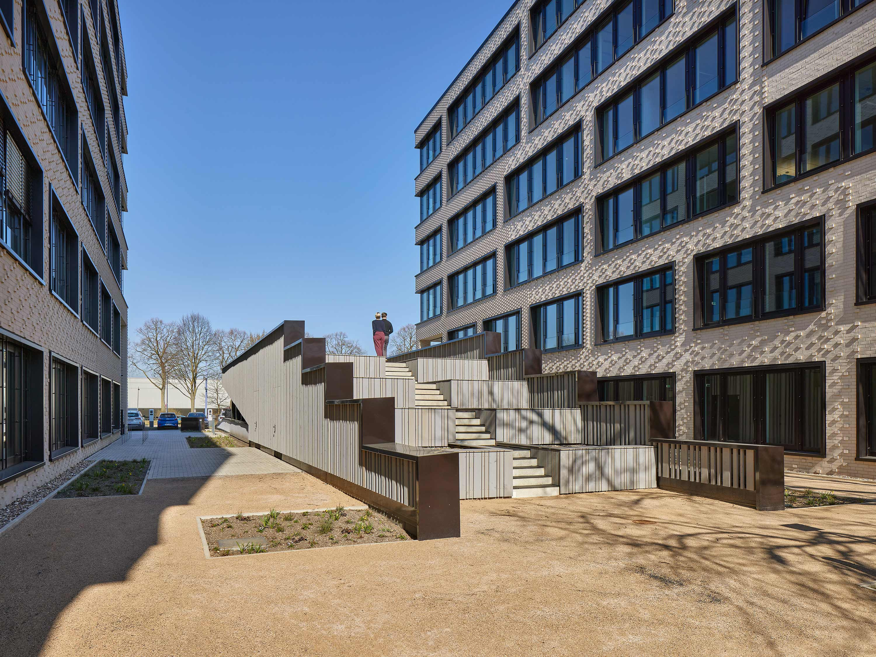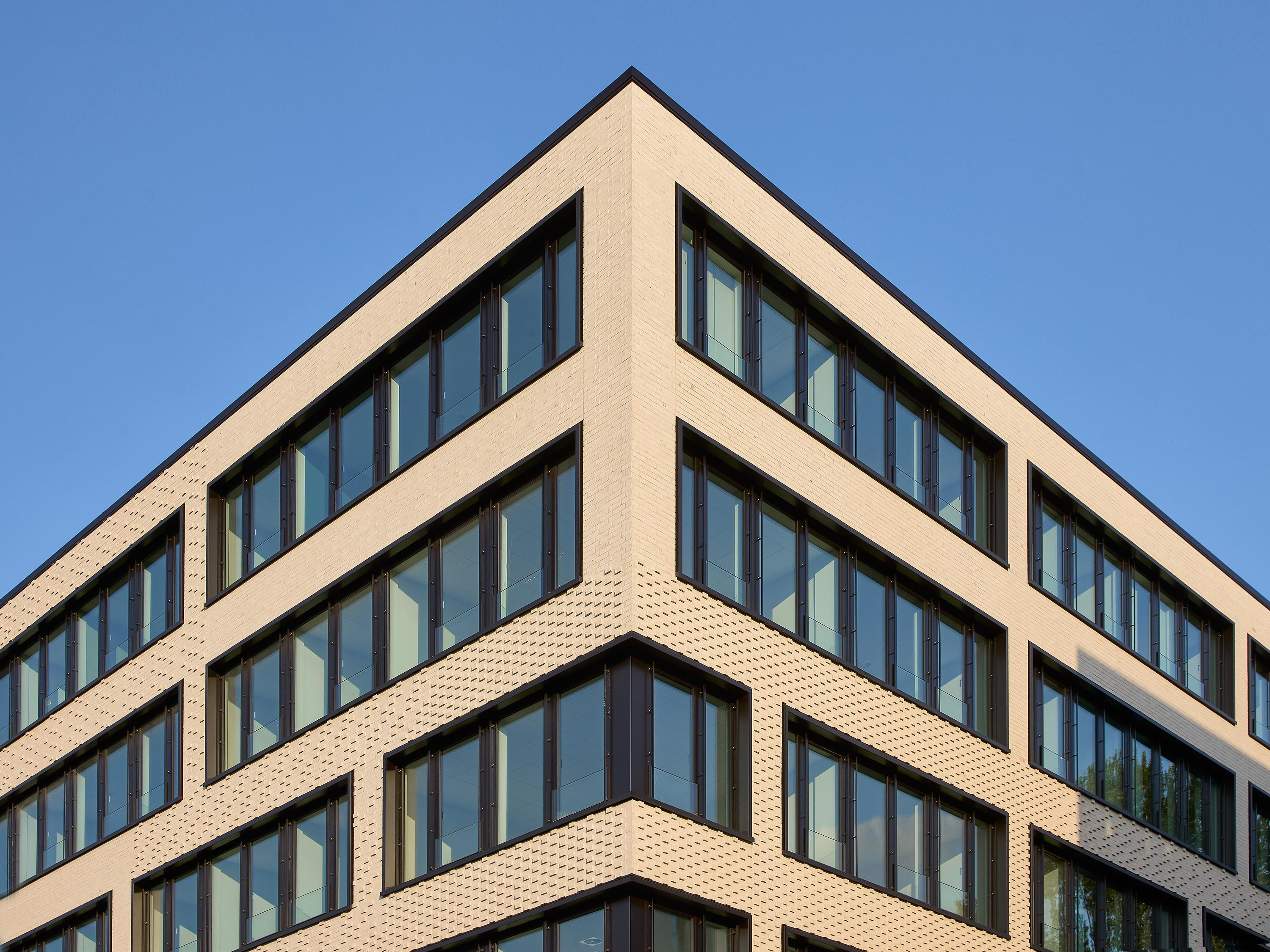 The light-colored brickwork of the street façades has slightly protruding clinker brick heads that create an exciting interplay of light and shadow during the course of the day. These façade accents extend to the corners of the building, where they gradually diminish towards the south. This visually emphasizes the transition from the noisy street to the quiet inner courtyards.