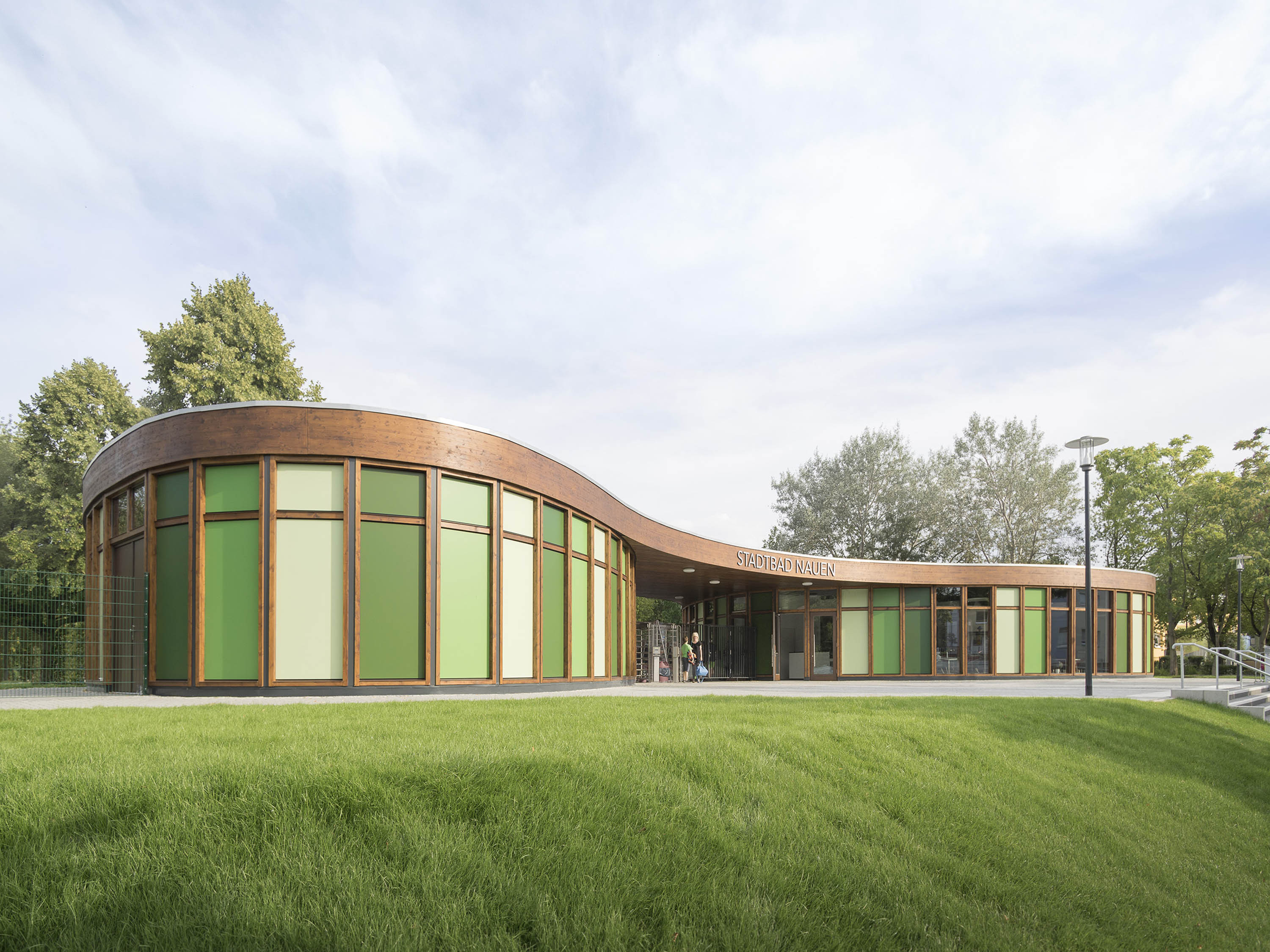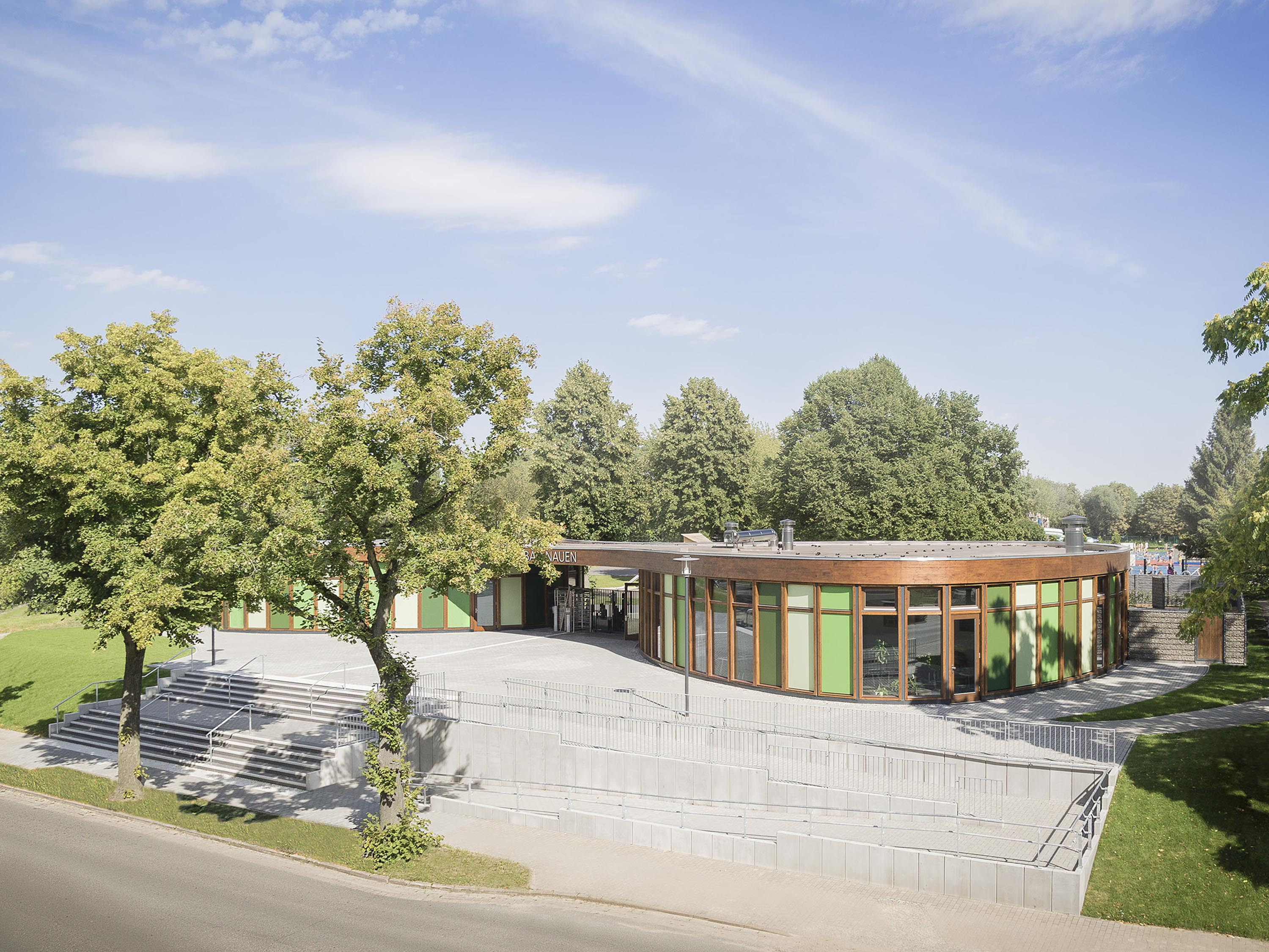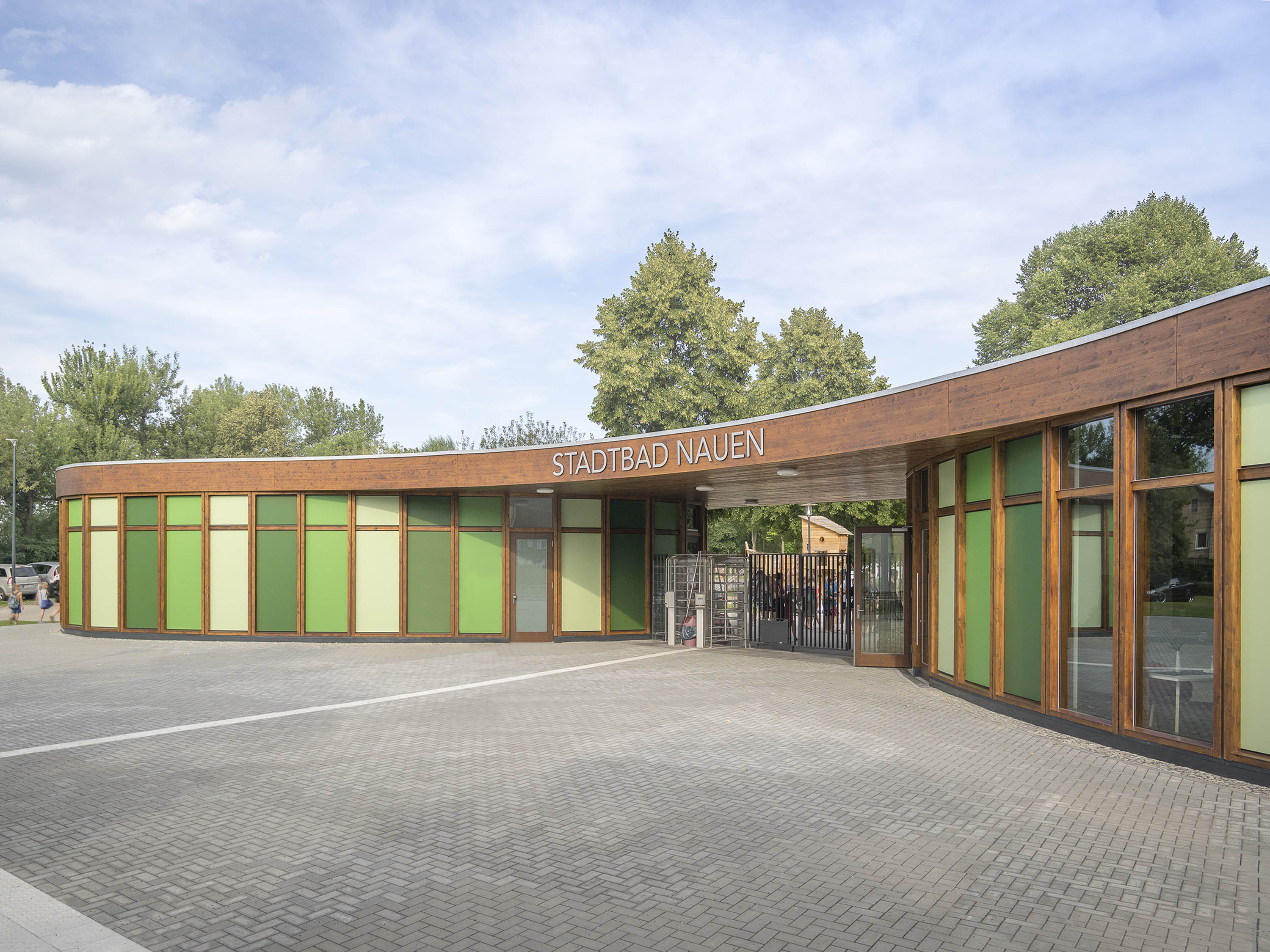 The organic shape of the two single-storey buildings and the colour palette of the façades harmonise with the natural landscaping. The striking, curved parapet runs around the two volumes, connecting them at the same time and thus creating a gateway situation at the entrance to the municipal baths. Wooden frames form the supporting structure and at the same time the façade of the building. It consists of prefabricated polygonal timber frames with double glazing and insulated timber panels in closed façade areas.