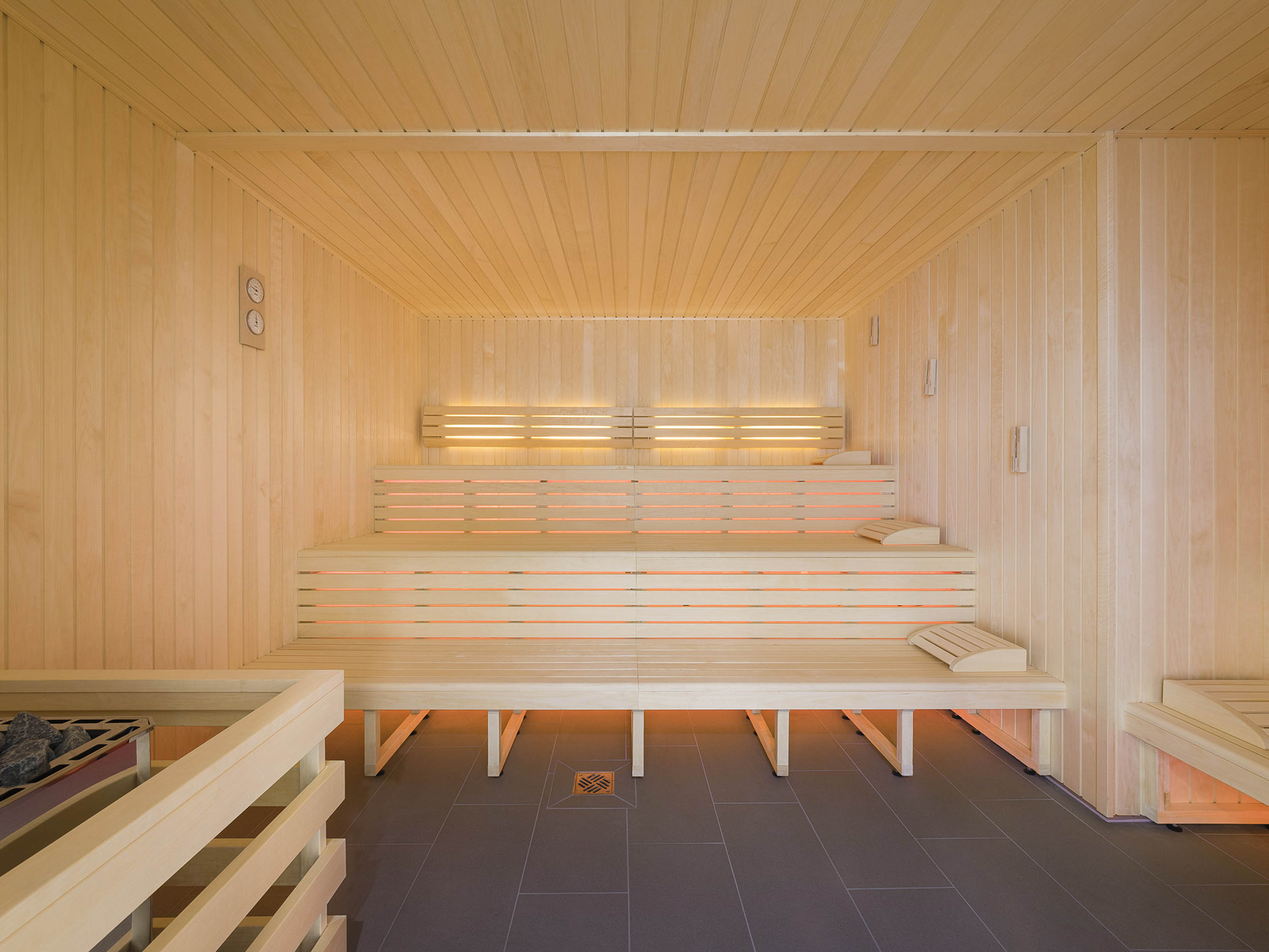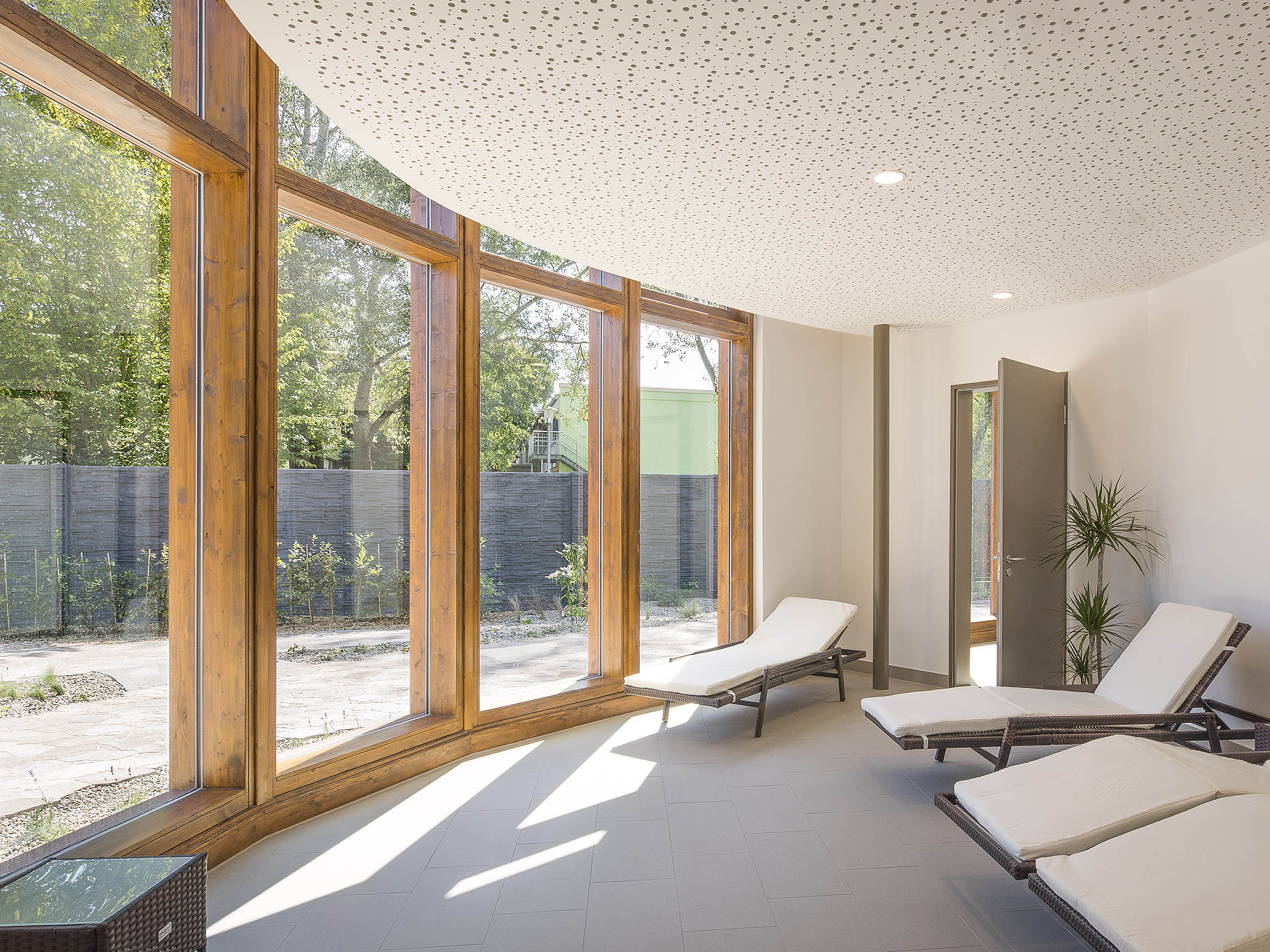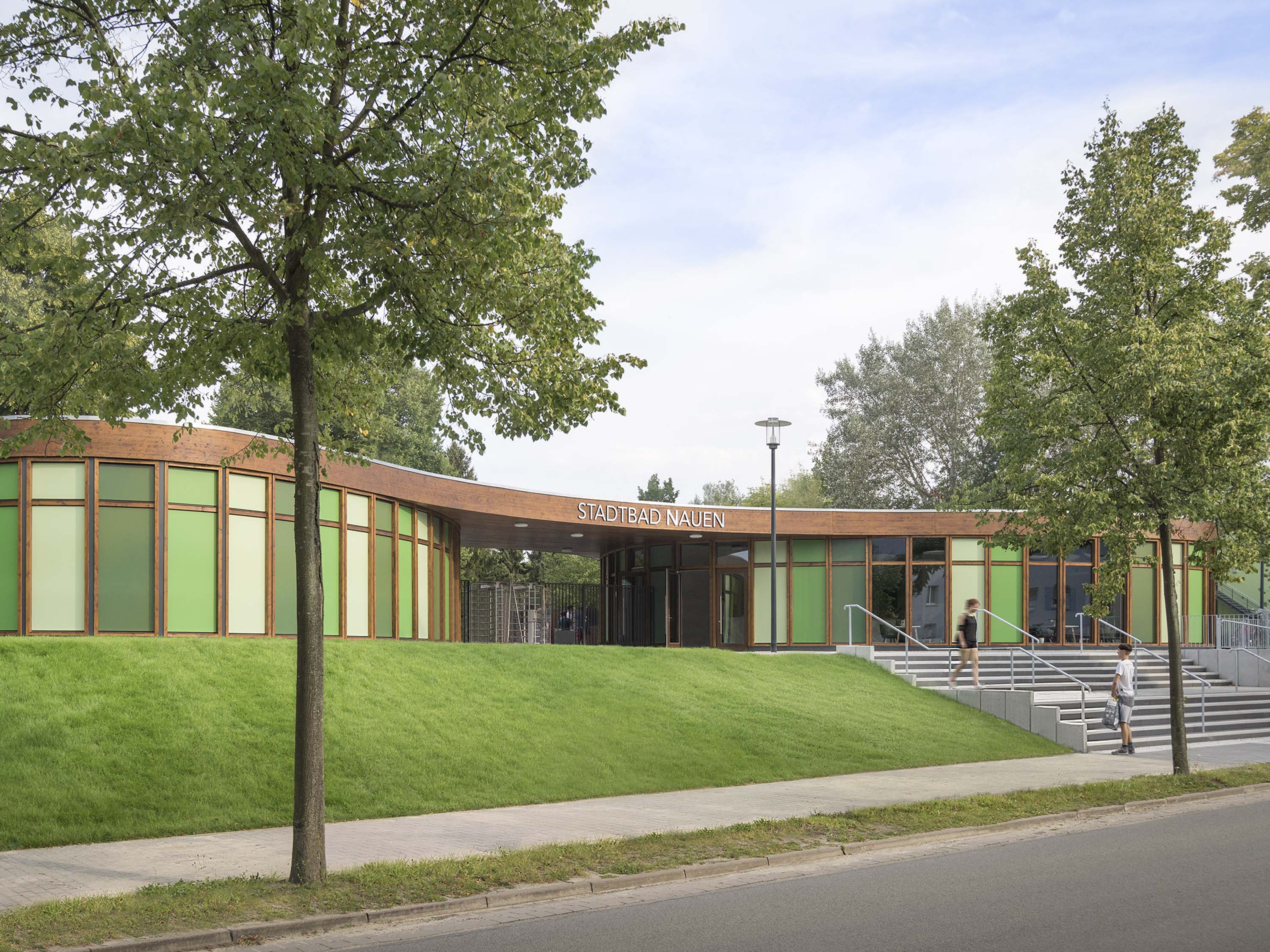 The organic shape of the two single-storey buildings and the colour palette of the façades harmonise with the natural landscaping. The striking, curved parapet runs around the two volumes, connecting them at the same time and thus creating a gateway situation at the entrance to the municipal baths. Wooden frames form the supporting structure and at the same time the façade of the building. It consists of prefabricated polygonal timber frames with double glazing and insulated timber panels in closed façade areas.