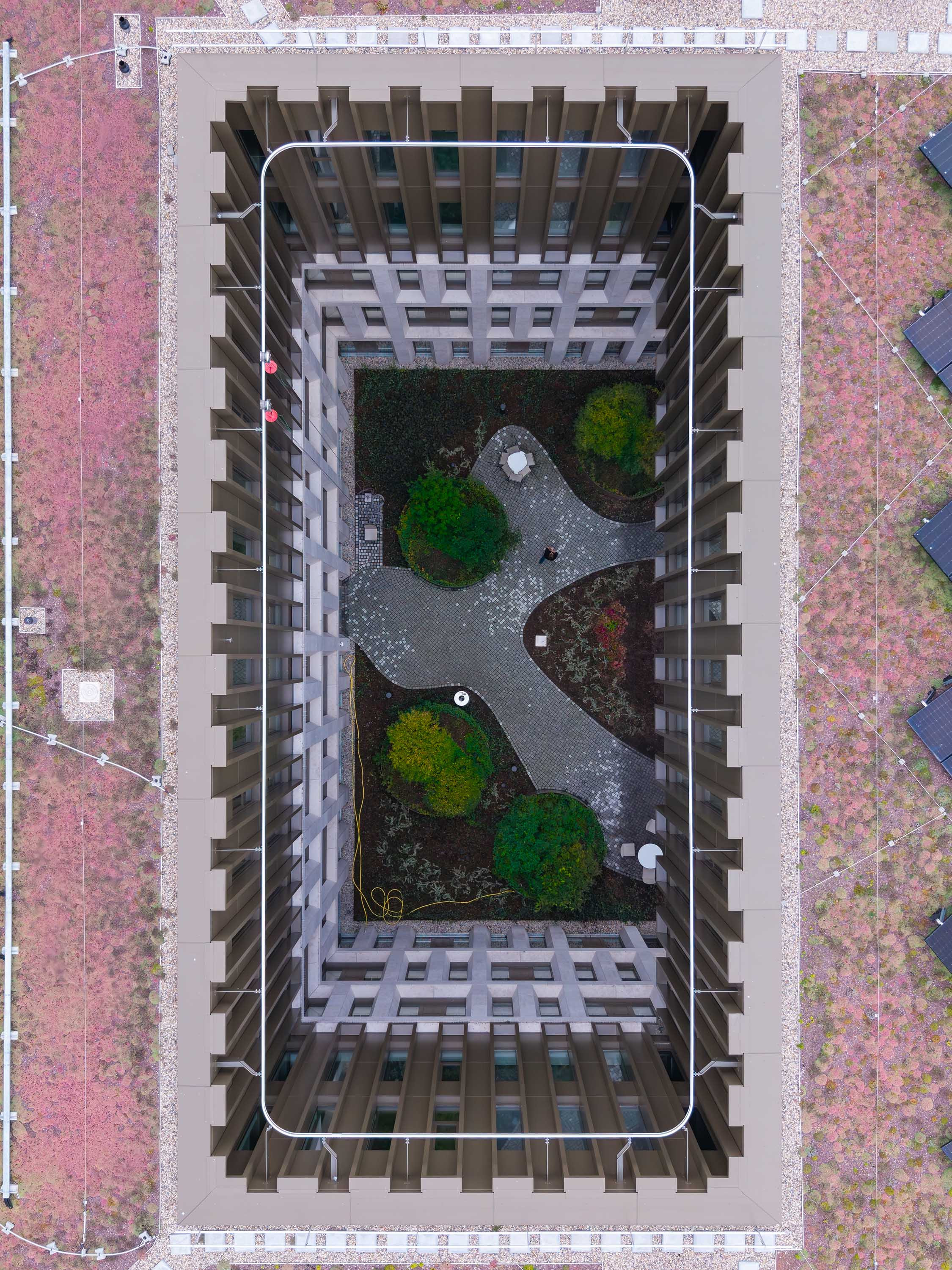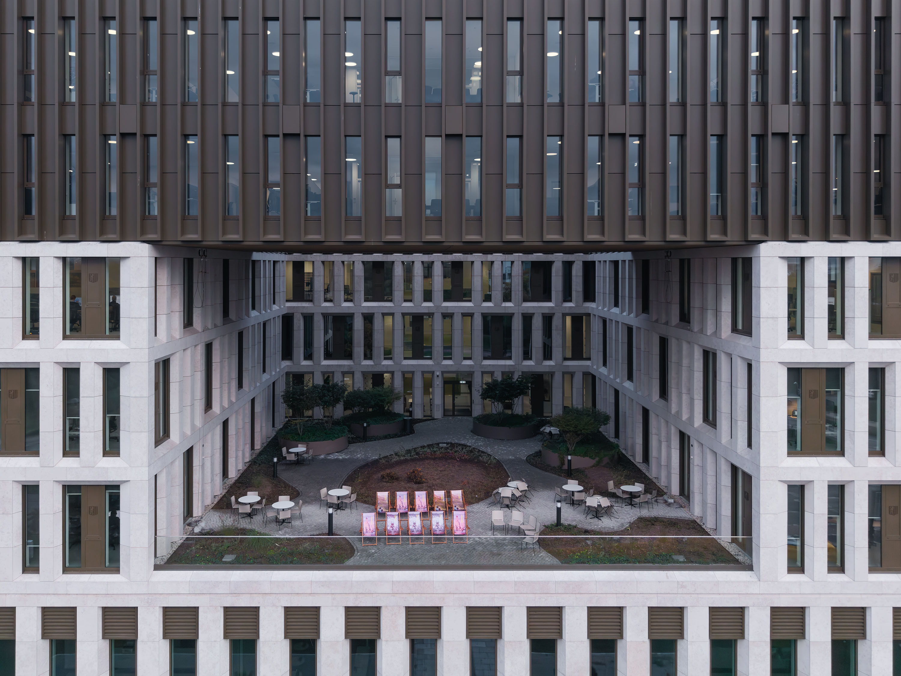Five office floors above are for purely business uses and are organized around two green inner courtyards, which provide natural light and a pleasant working environment.