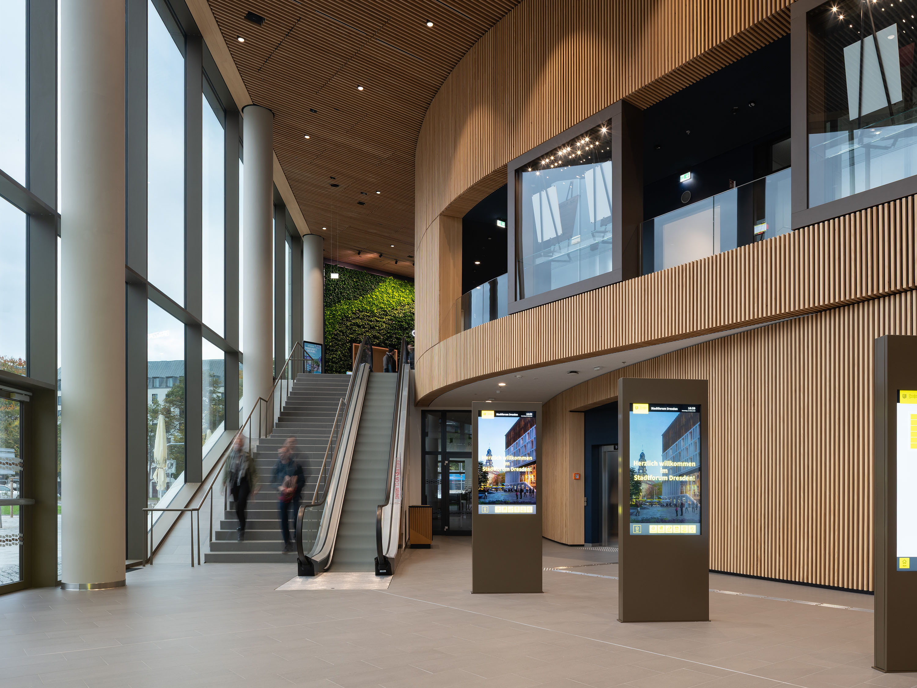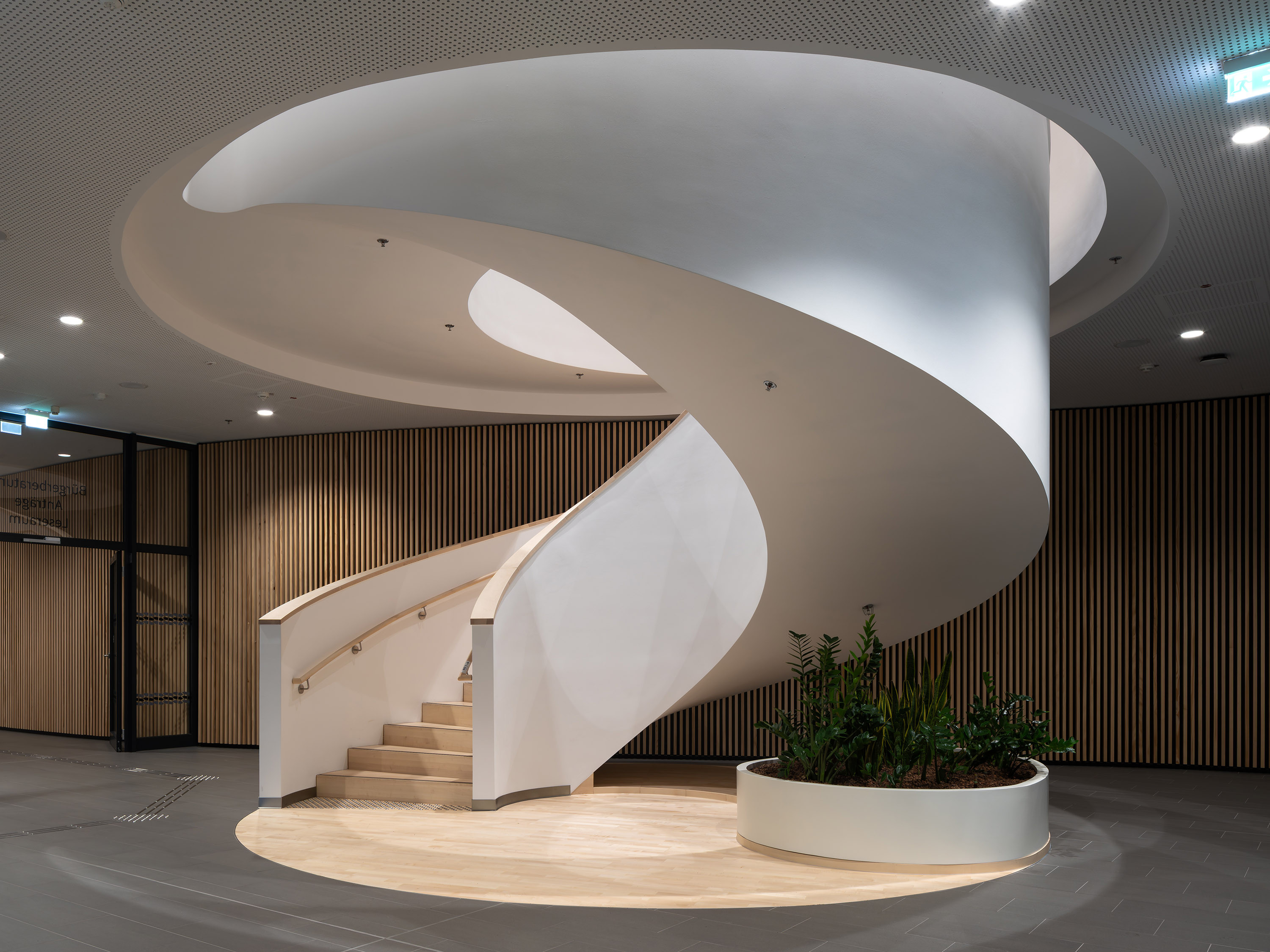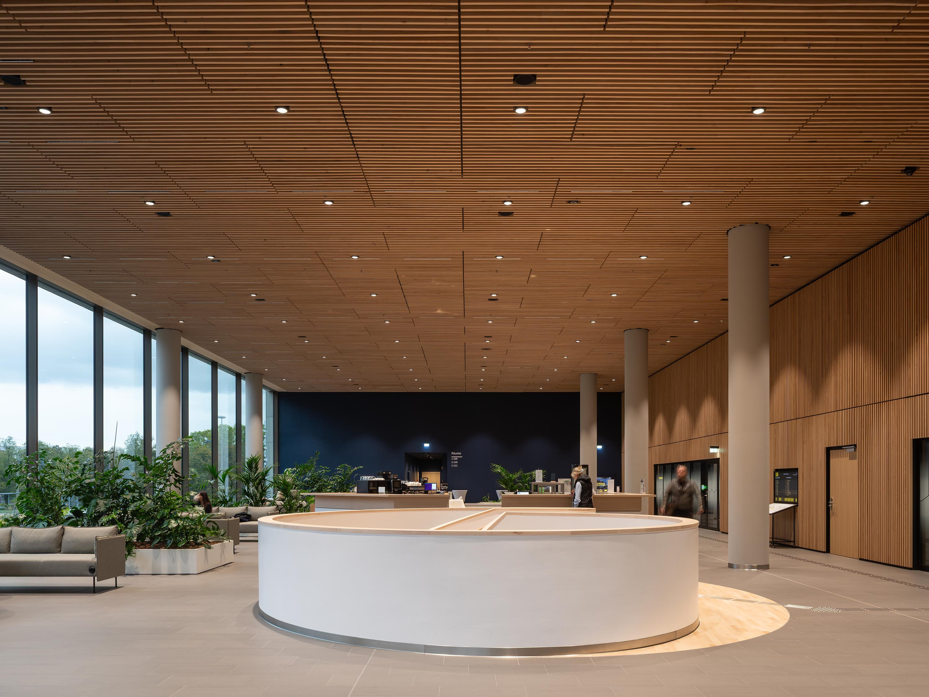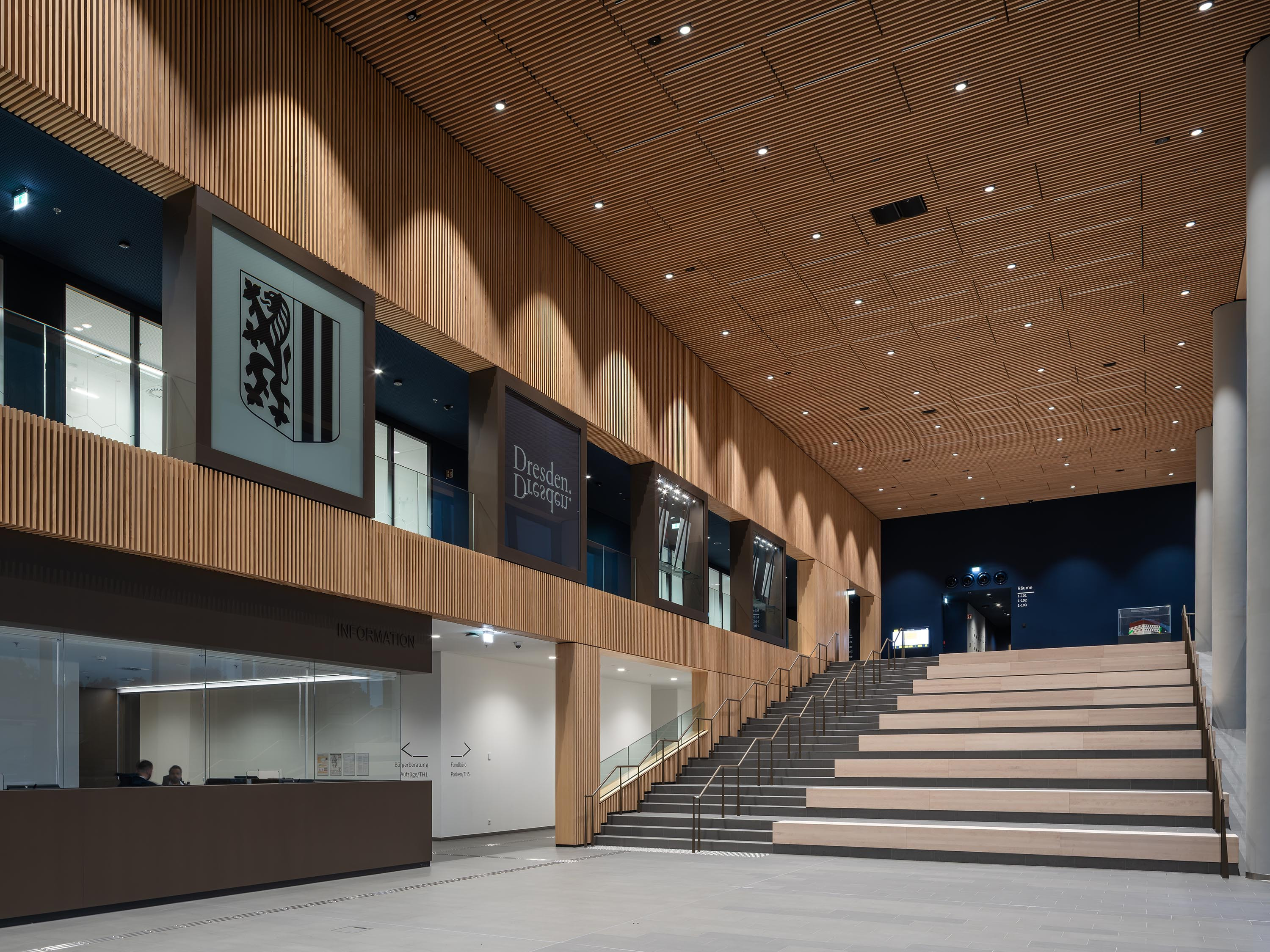 The ground floor contains publicly accessible areas including a foyer with an information desk, a restaurant, the city’s lost-and-found office, and rooms where citizens can receive advice. The foyer areas with their individual bronze-coloured elements and homogeneous grey flooring pick up on the materiality of the façade and outside amenities. This space takes its character from the silver-fur slats covering the walls.
