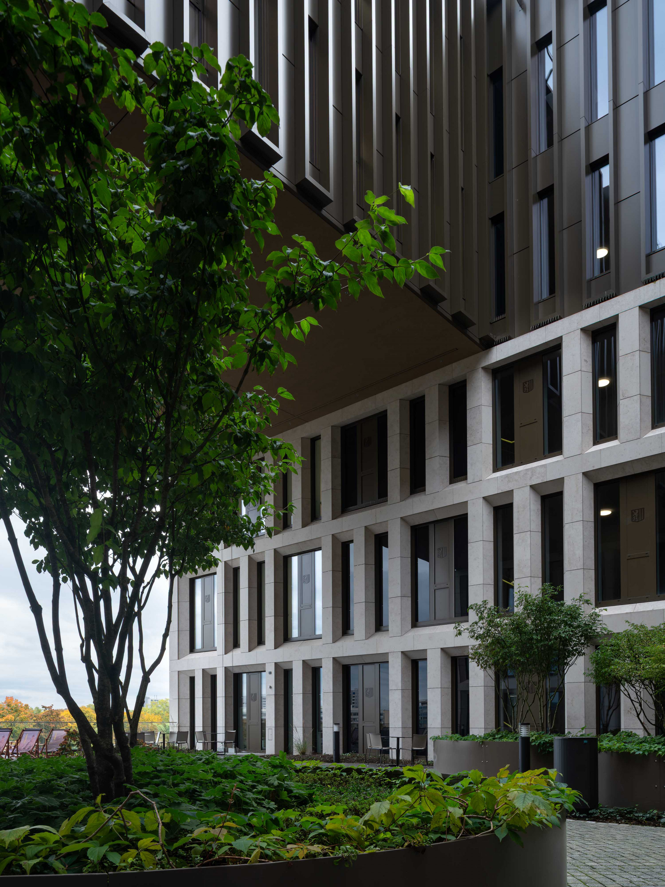 The entire facade is impressive for its plasticity: the resulting play of shadow on the light-beige Dietfurt limestone is especially effective on the building’s base and middle parts. The graphically homogeneous coloration of the material was chosen in reference to the sandstone facades of the surrounding principal buildings. Above the area of natural stone with its diagonally arranged reveal panels, the fifth and sixth floors are distinguished by an orthogonally oriented metallic façade in which alternating glazed and non-glazed panels are framed by bronze-brown coated aluminium pilaster strips.