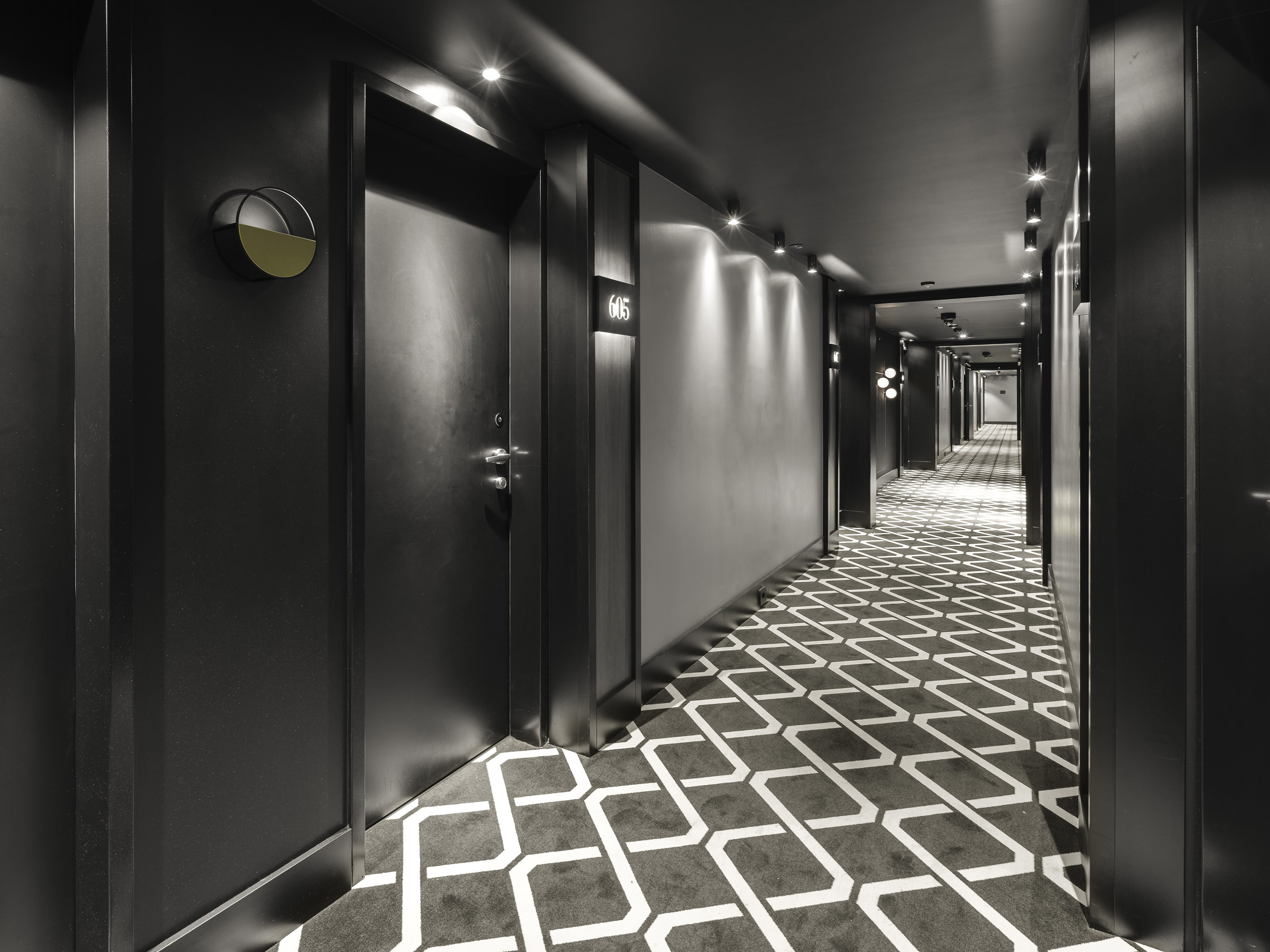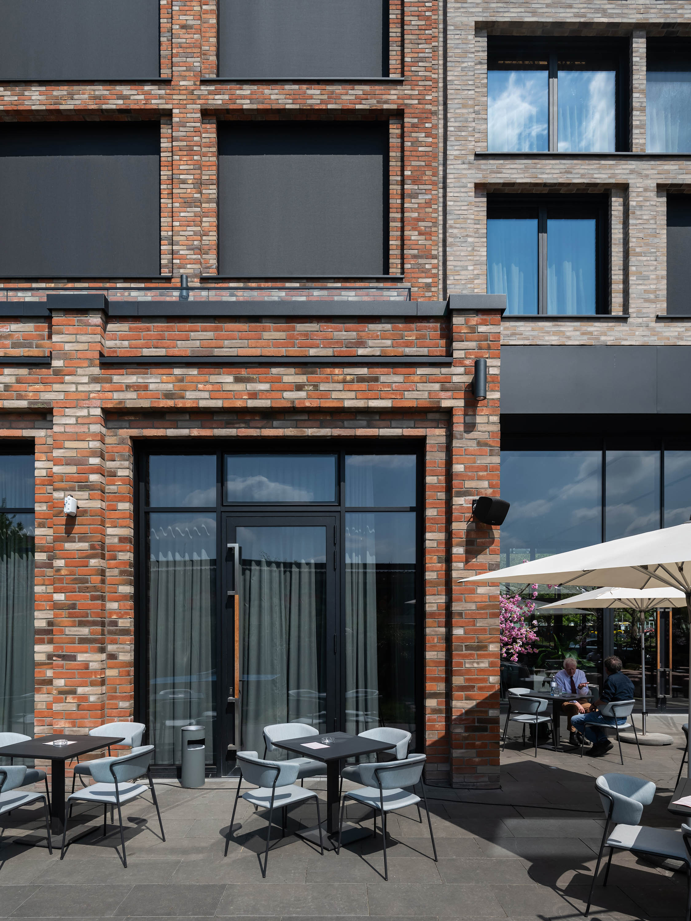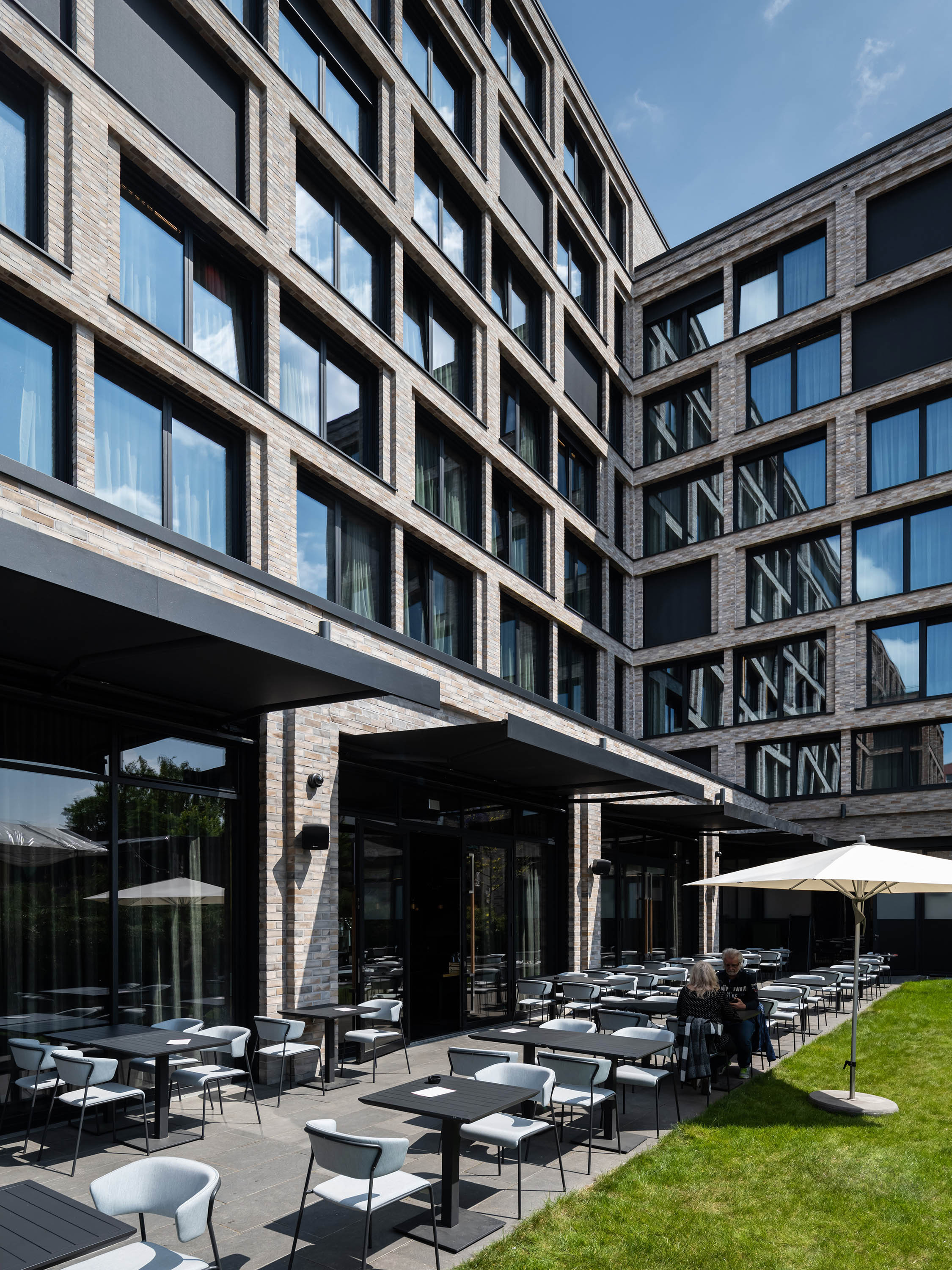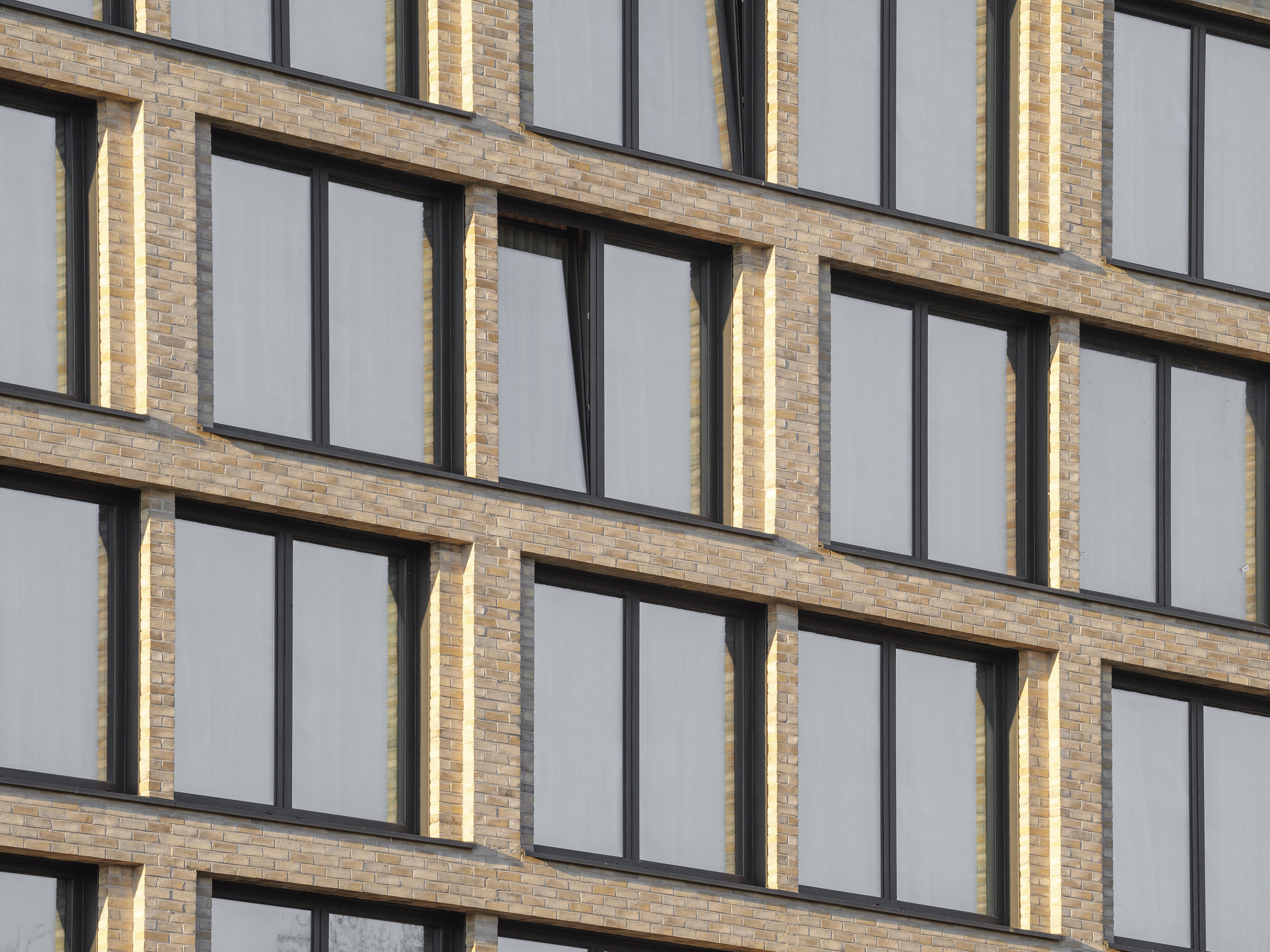 The façade of the hotel is divided into alternating window fields, each with two windows separated by clinker bricks with matt pastel and iridescent colour patterns.