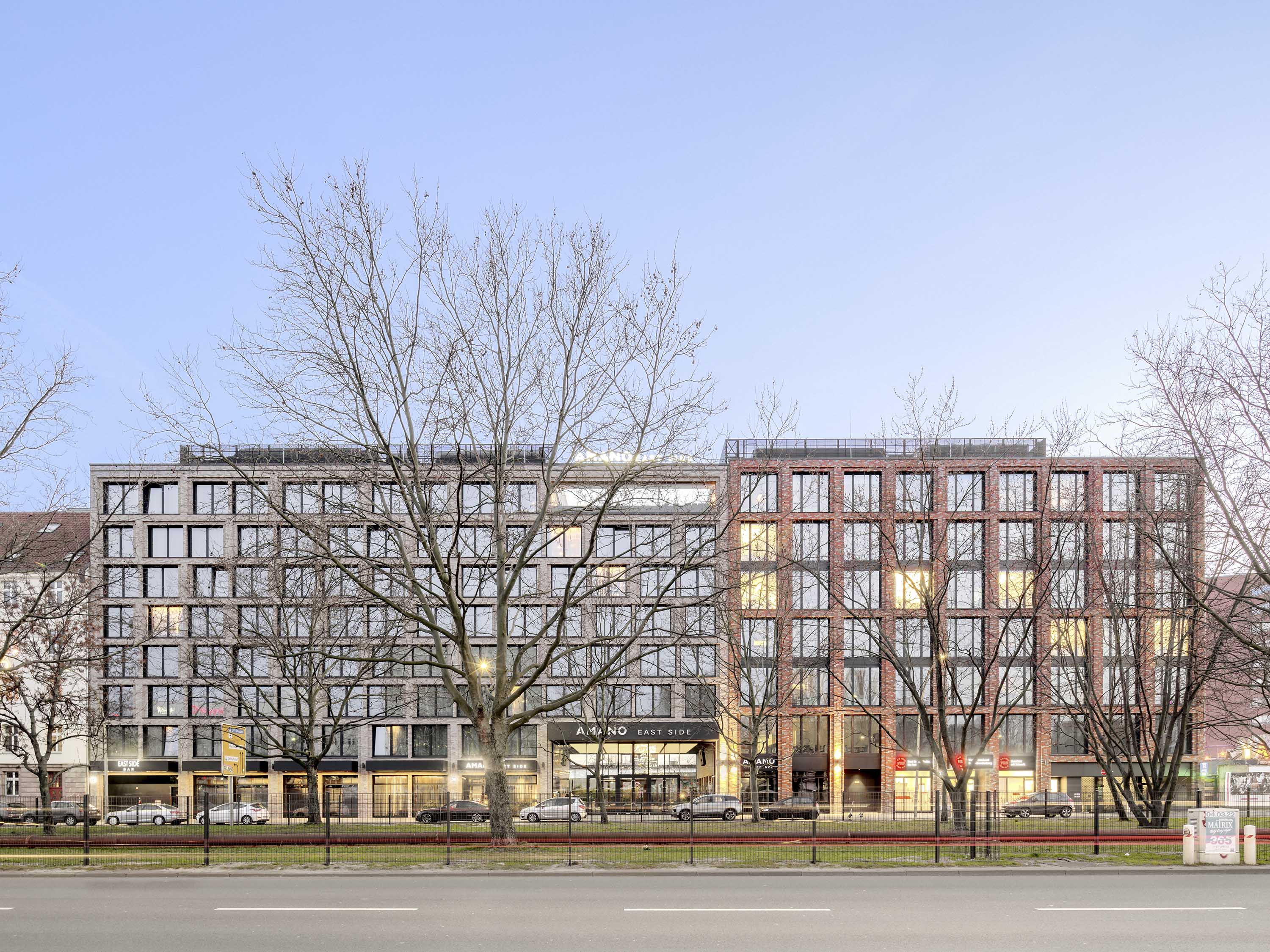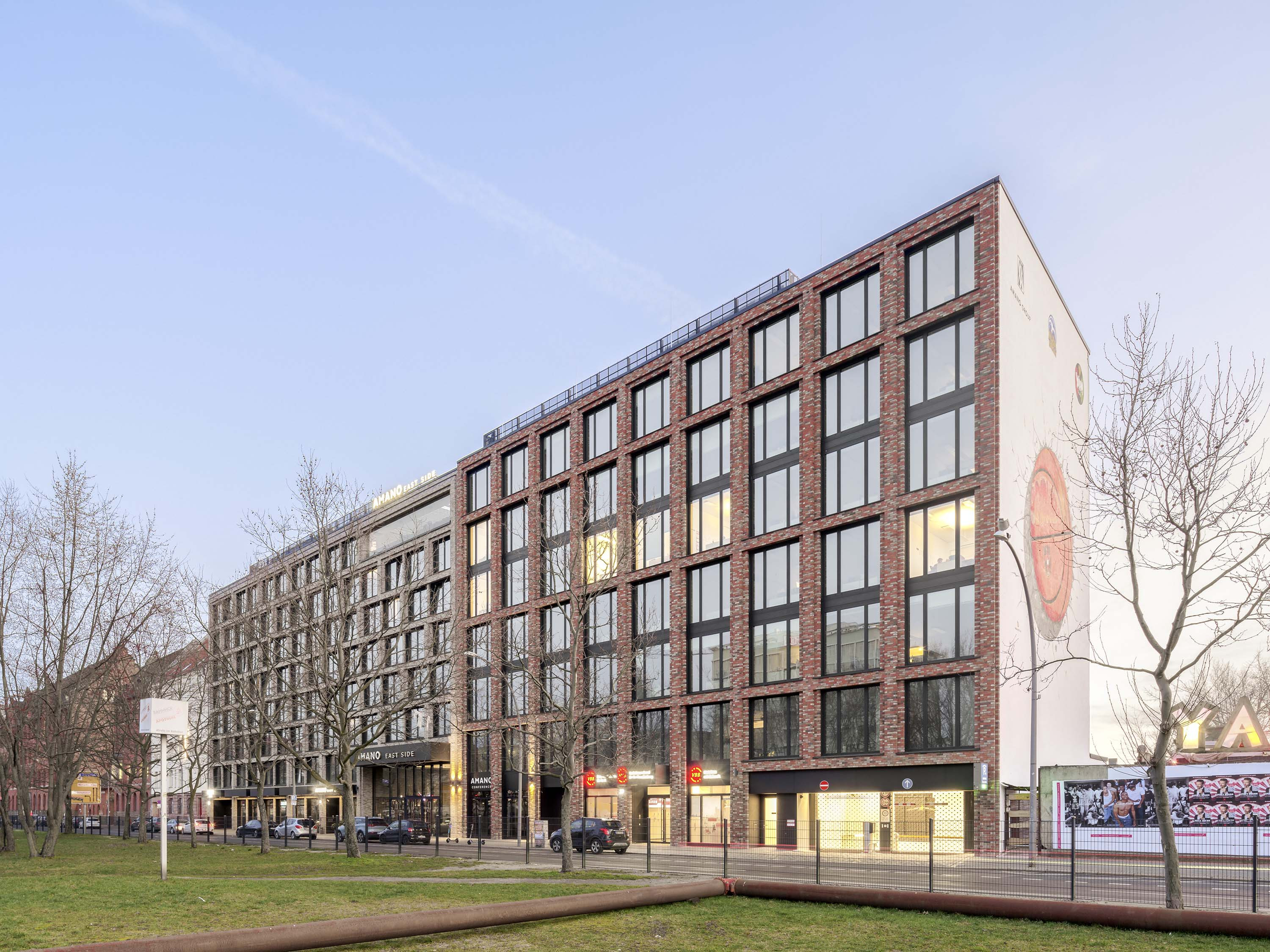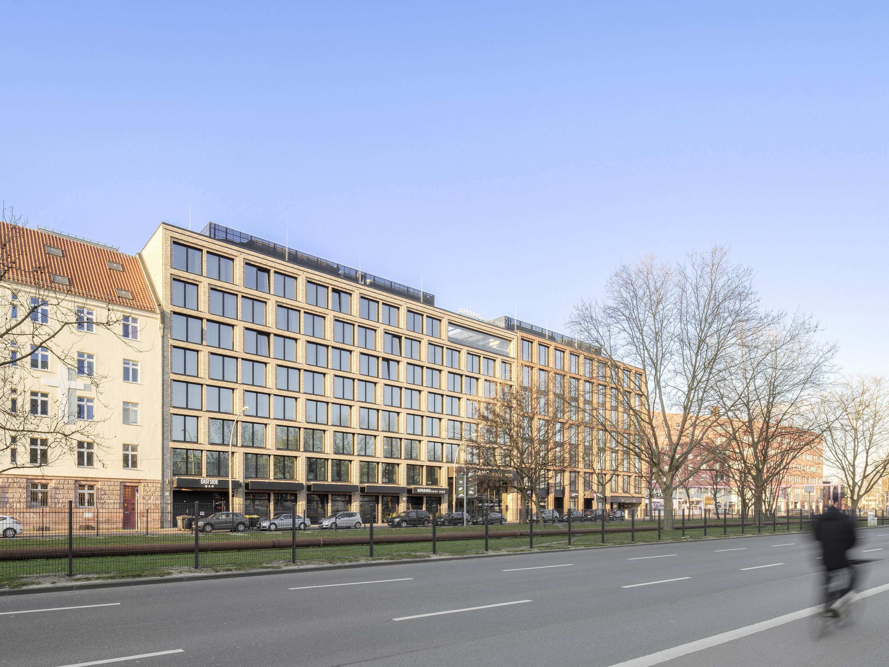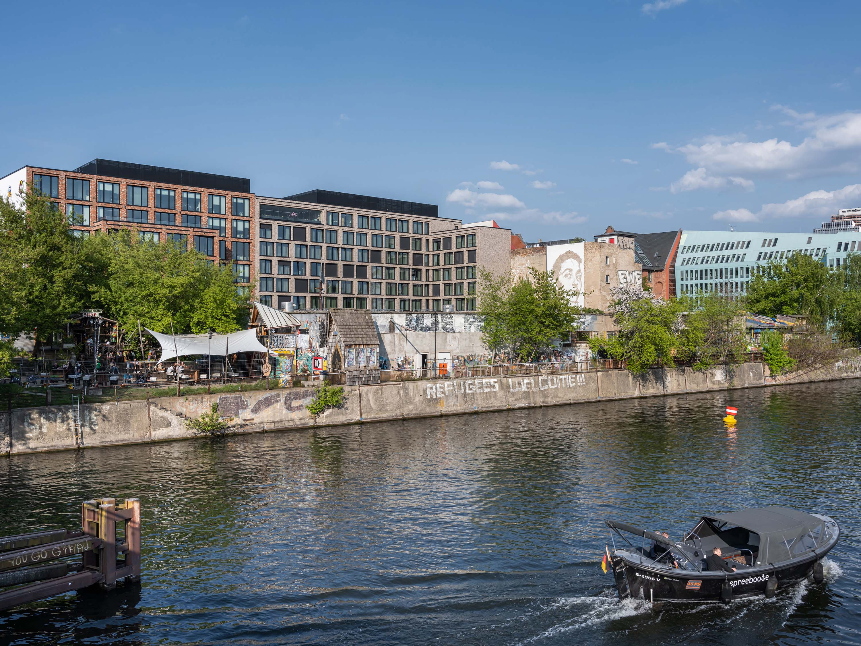 A two-part building complex was planned as the new development, consisting of an eight-storey hotel in the eastern section and a seven-storey office building in the western section with a shared two-storey underground car park. In the area of the hotel, at the boundary to the office building, the complex is interrupted by a two-storey, 12-metre-wide "Spree window", which serves as a visual axis.