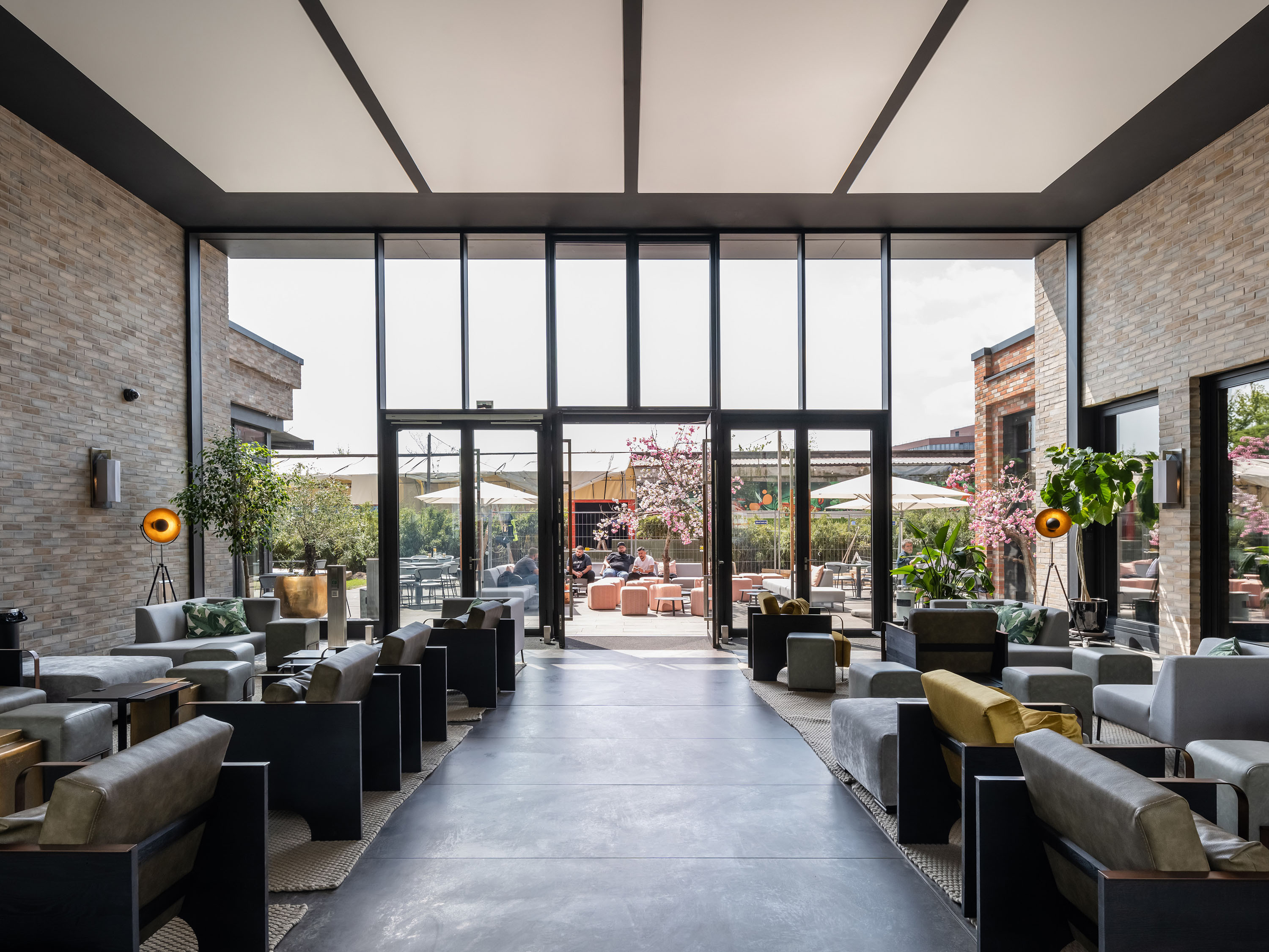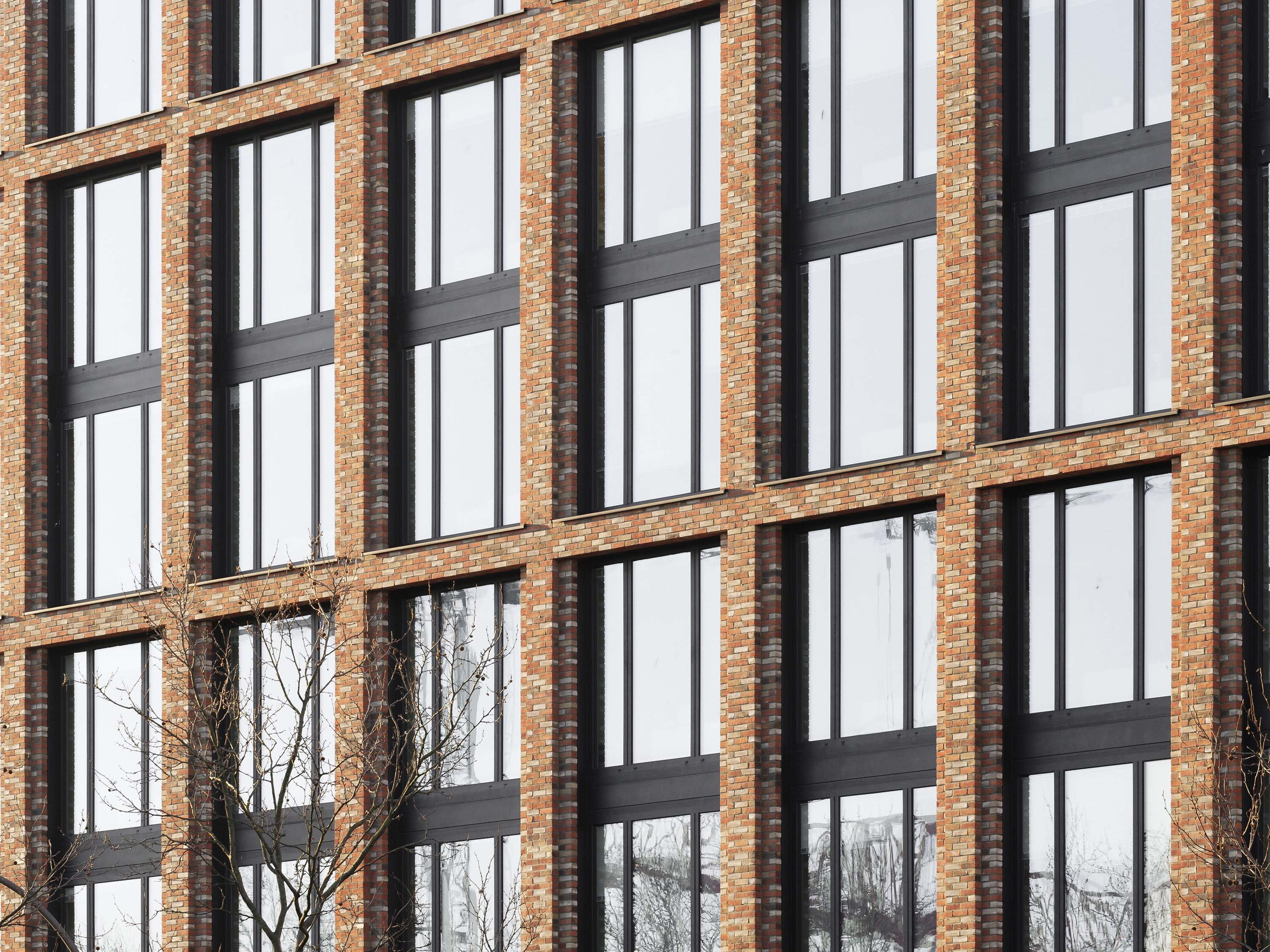 The façade of the office section in the opposite direction is vertically structured by continuous bands of clinker brick in a red-brown colour pattern. Horizontal clinker brick strips in every second storey suggest that the office floors are two storeys high. The regular arrangement of the almost square window fields gives the façade a calm, spacious character and echoes the design of industrial lofts.