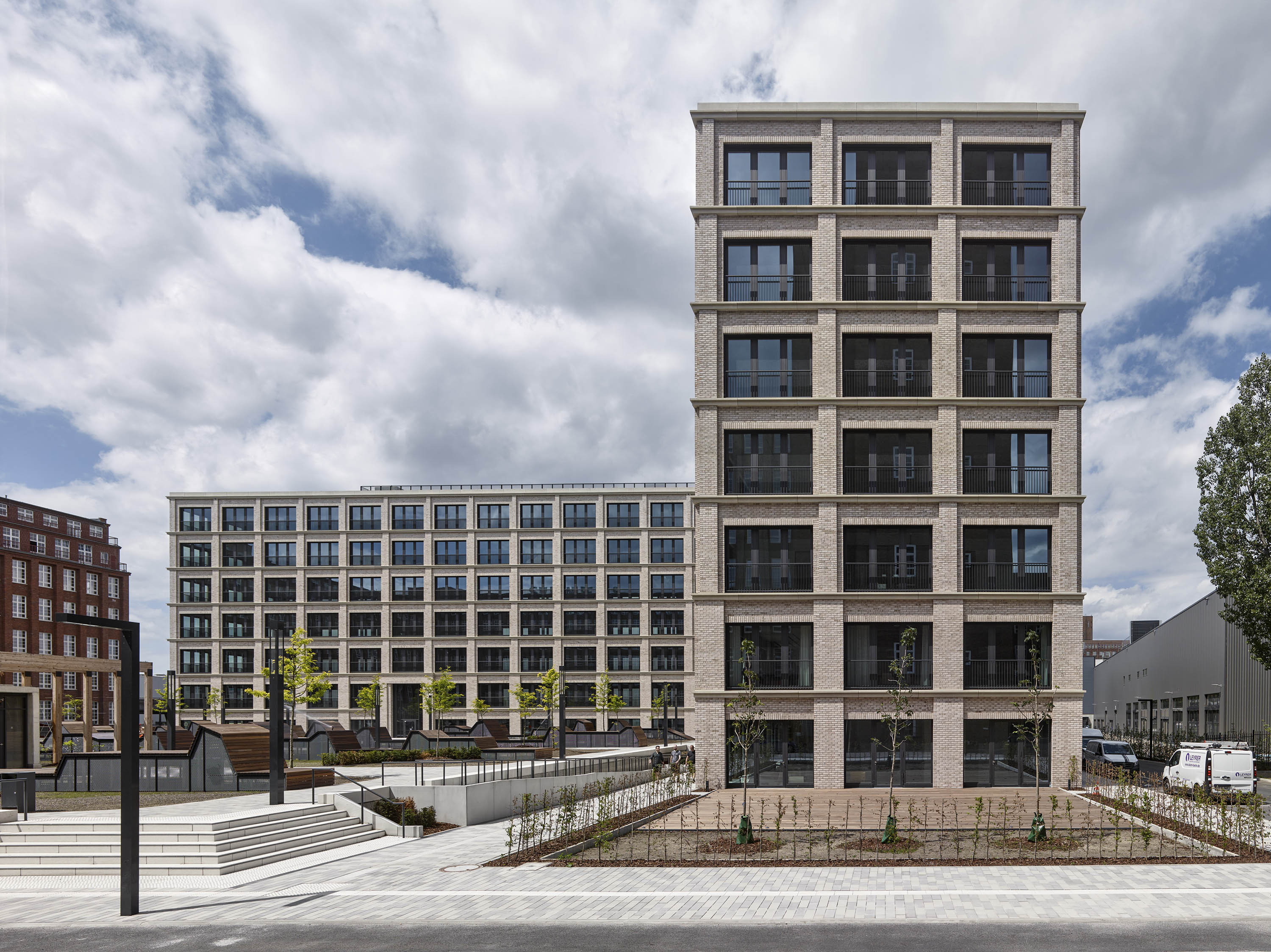 As a reference to the structure and materiality of the façades of the historic existing buildings, the new office buildings are executed in a matt, pastel-coloured clinker brickwork with an iridescent colour pattern.