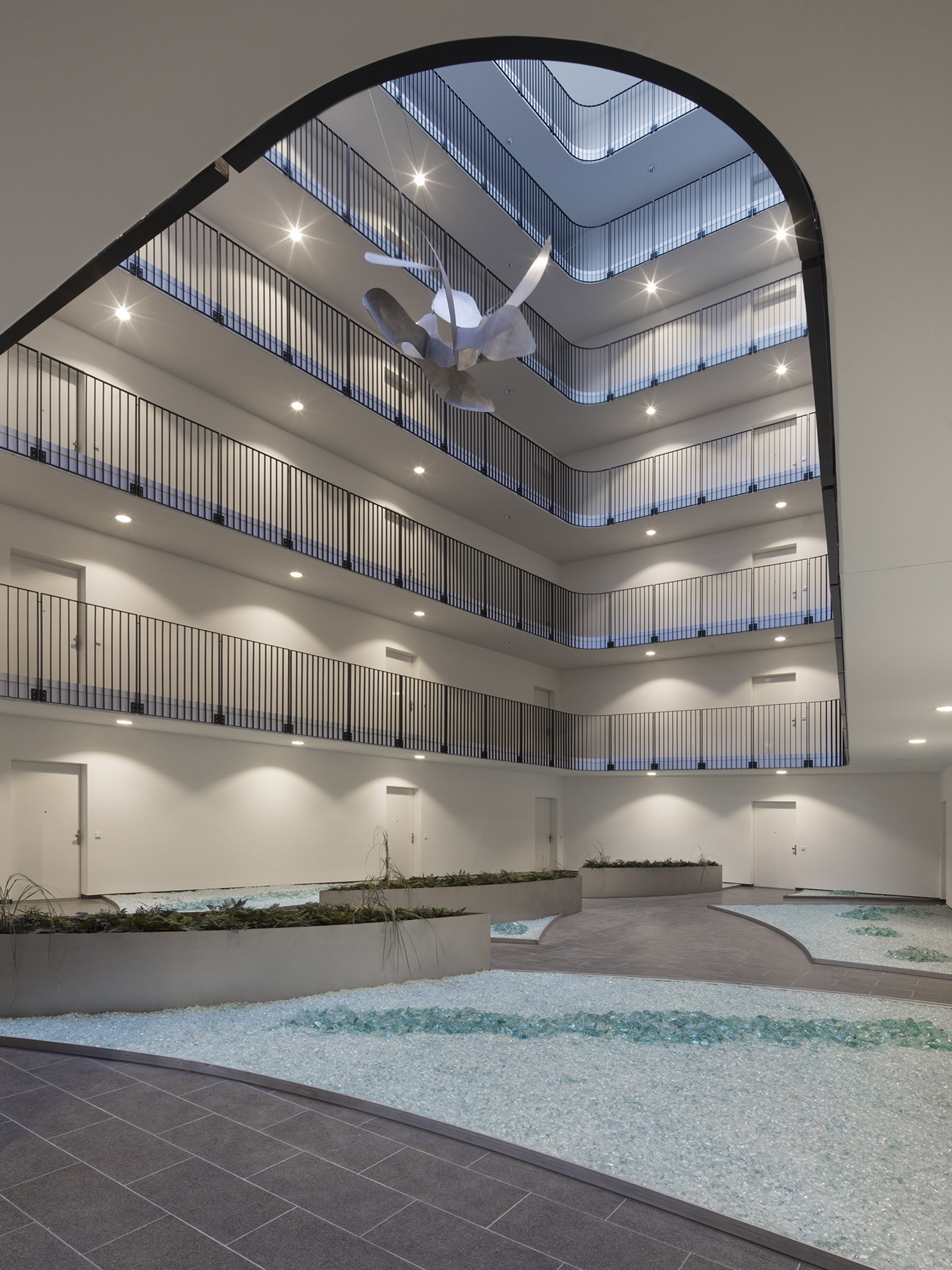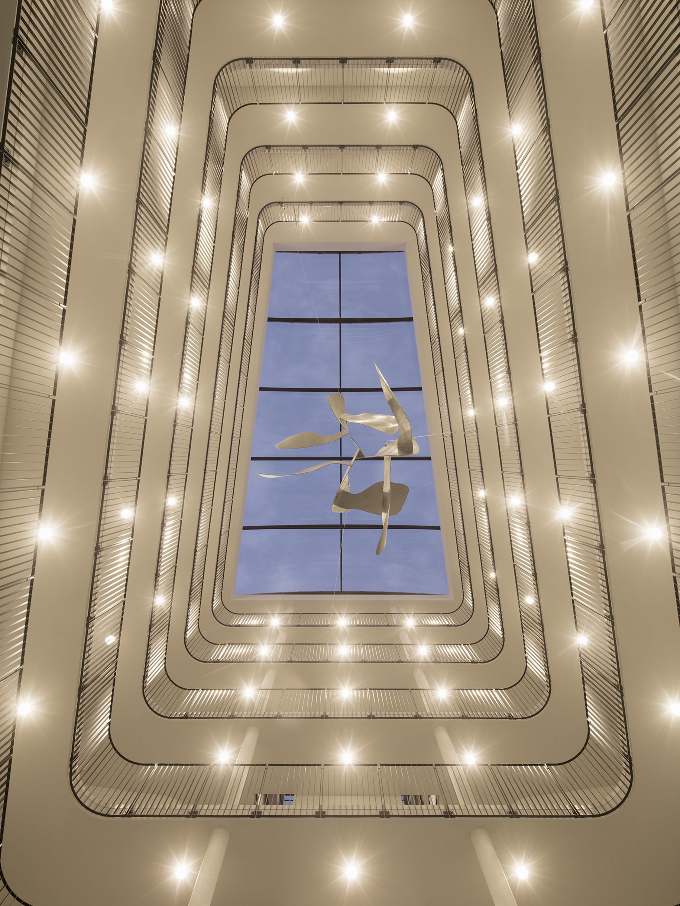 The multi-layered foil roof with integrated sun protection bathes the atrium in a soft light. A ship's propeller floats in the centre of the room, suspended on cables. It is a flock of oversized maple wings made of aluminium - "Samara", as artist Jovana Rusov called her work in reference to the botanical term for winged mable nut.
