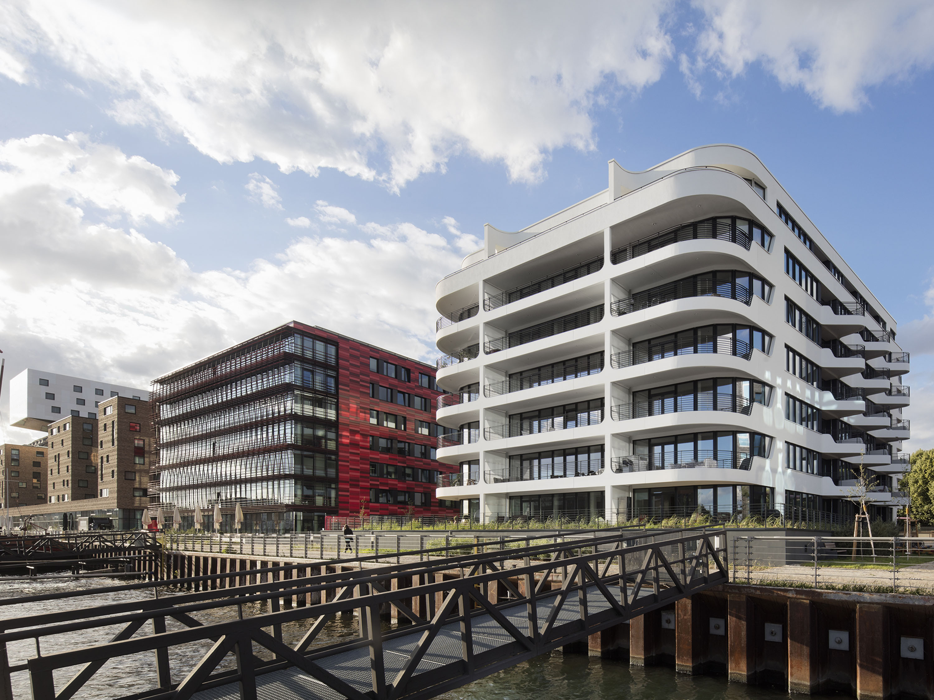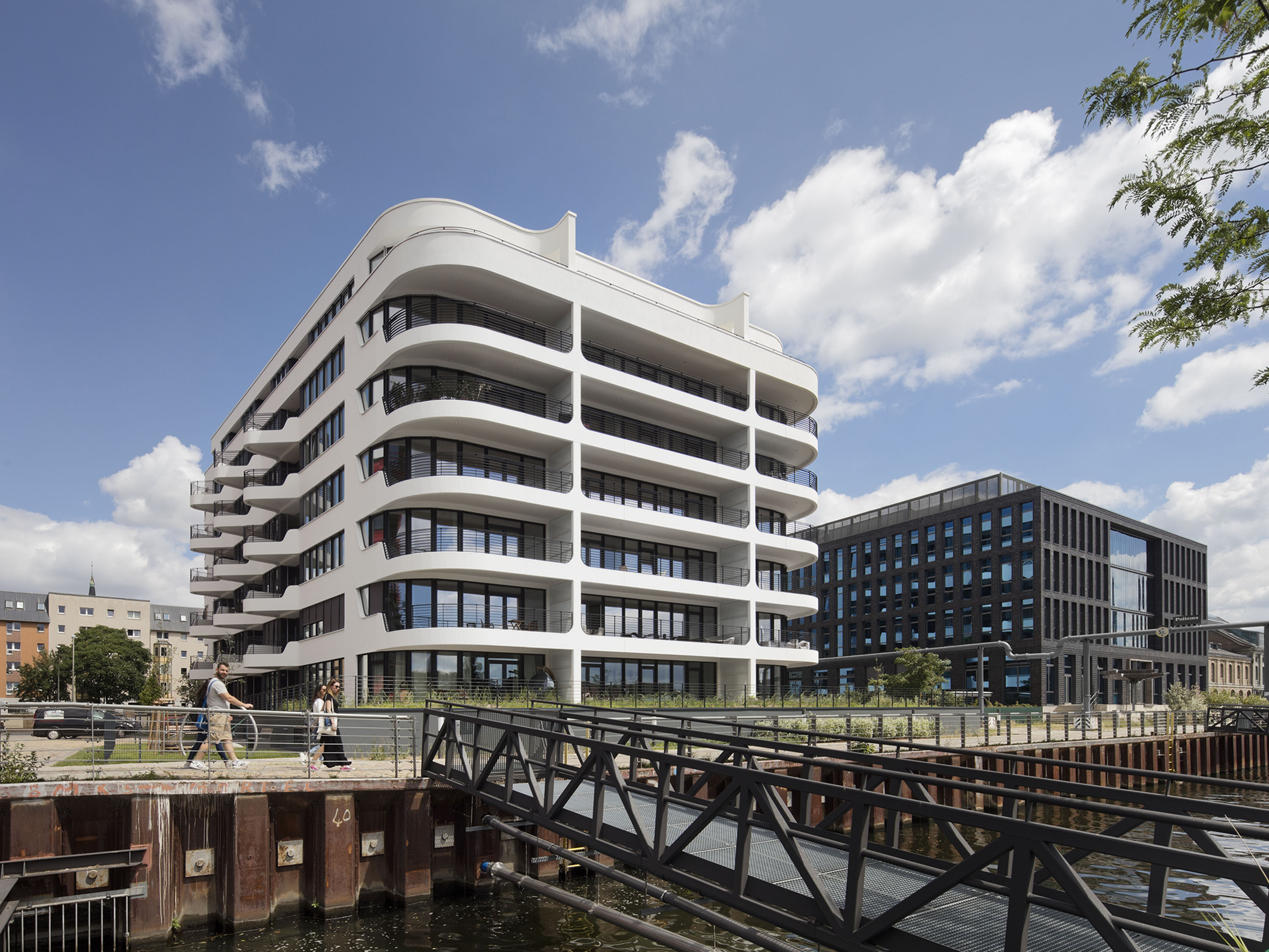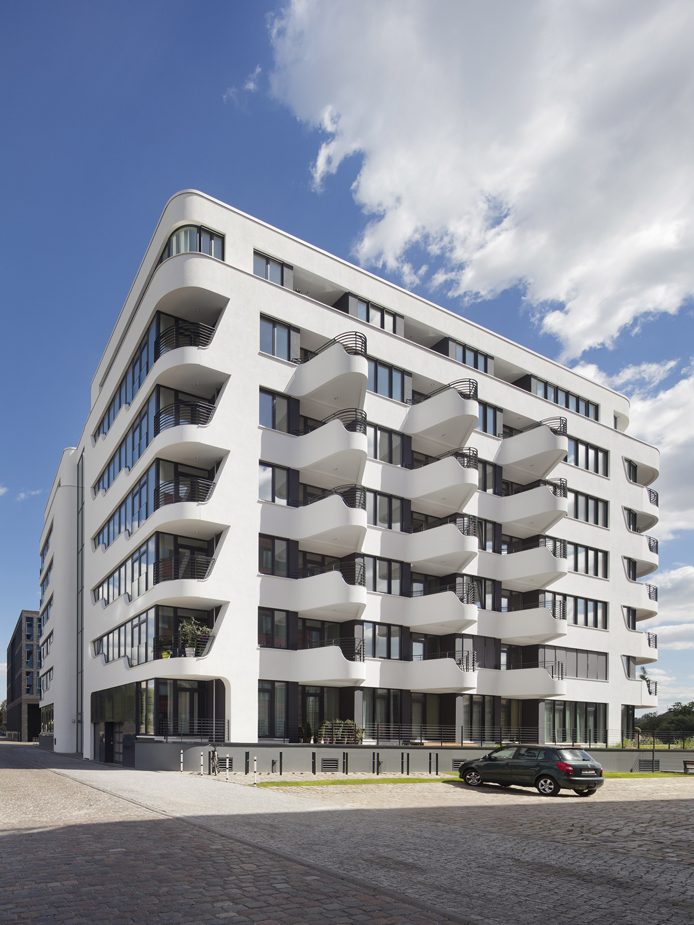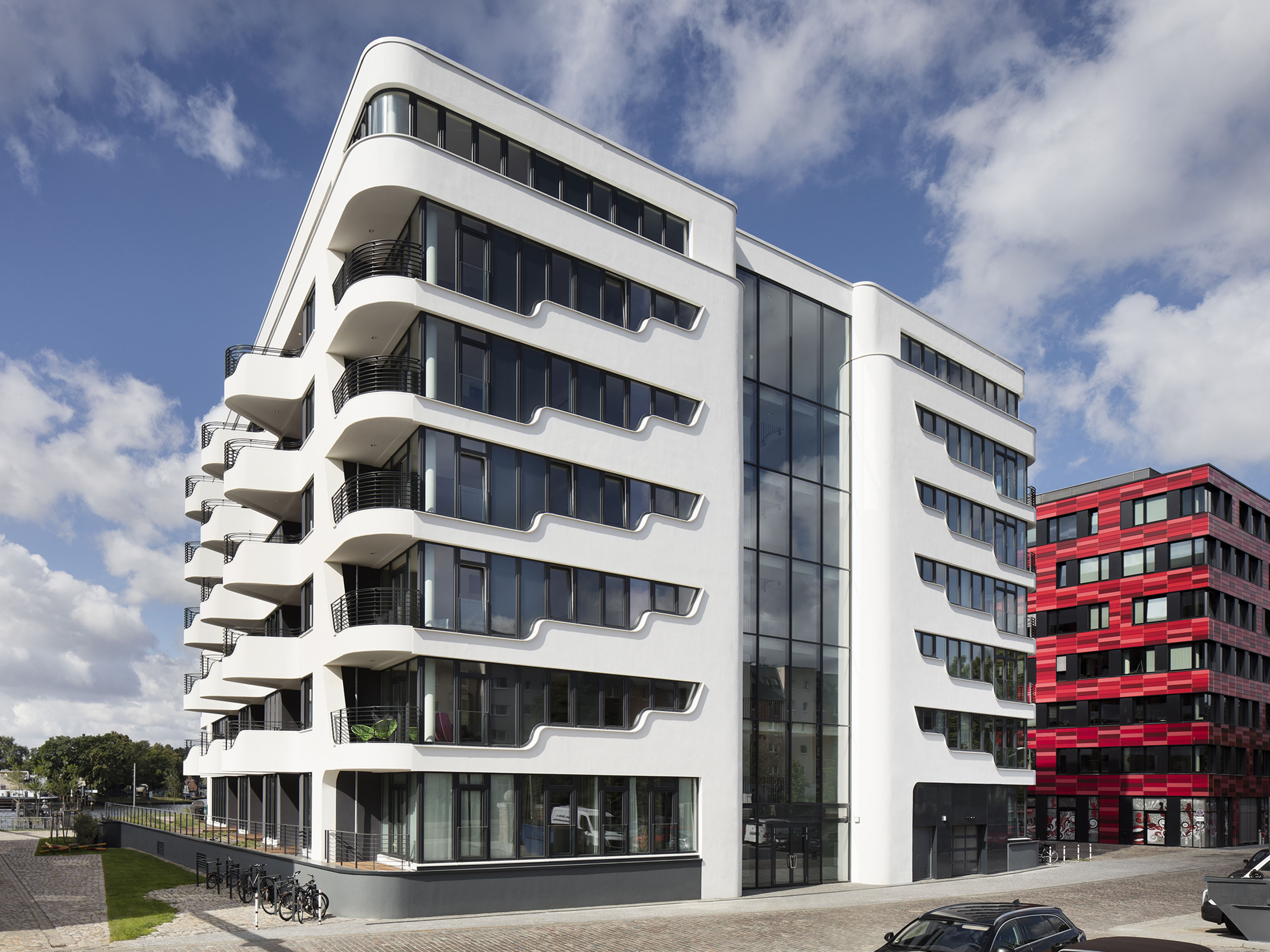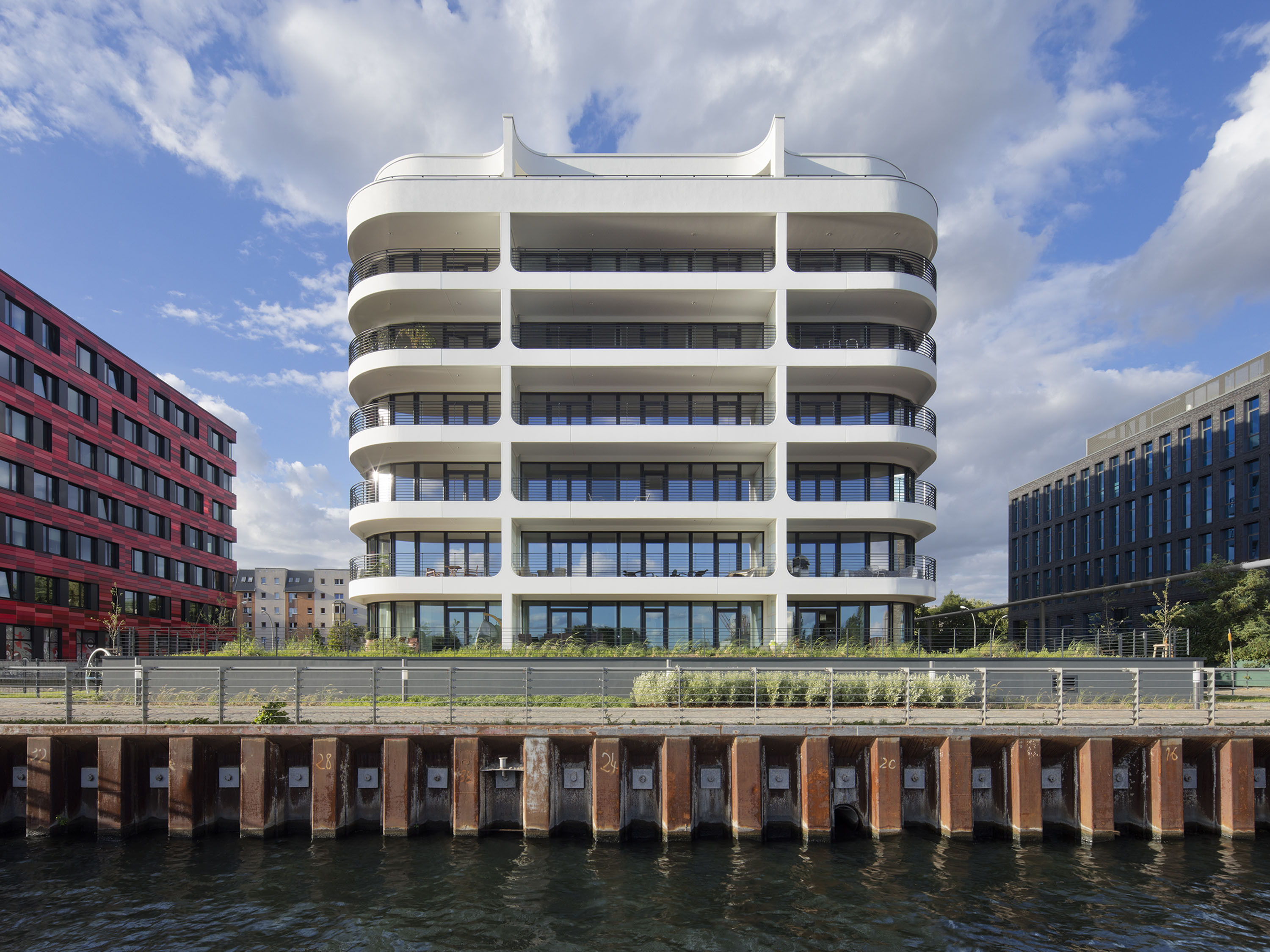 Down-to-earth and dynamic at the same time, the white building resembles a sea yacht at the harbour. The generous glazing offers wide panoramic views, the wrap-around balconies provide plenty of space in the fresh air, and the special location promises long walks along the Spree.
