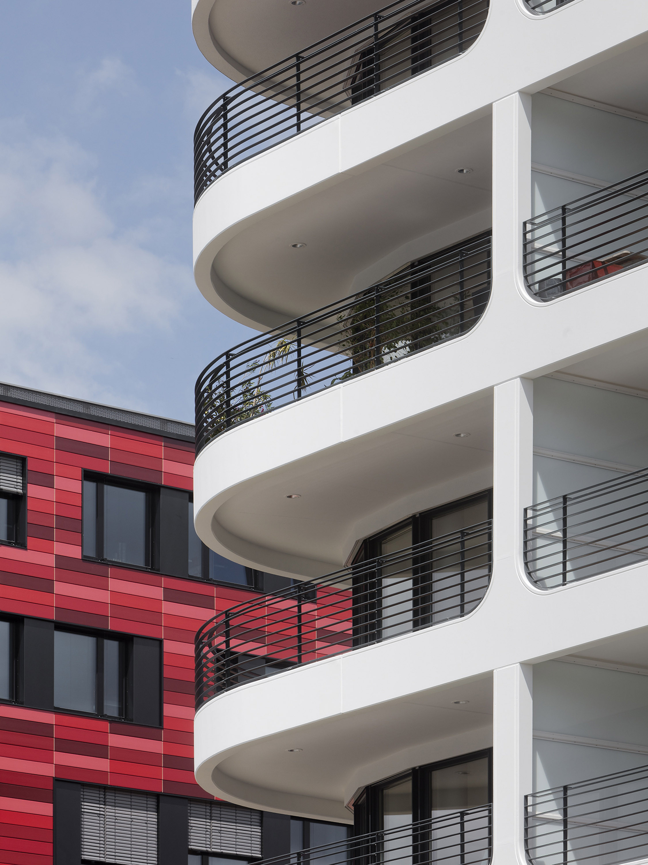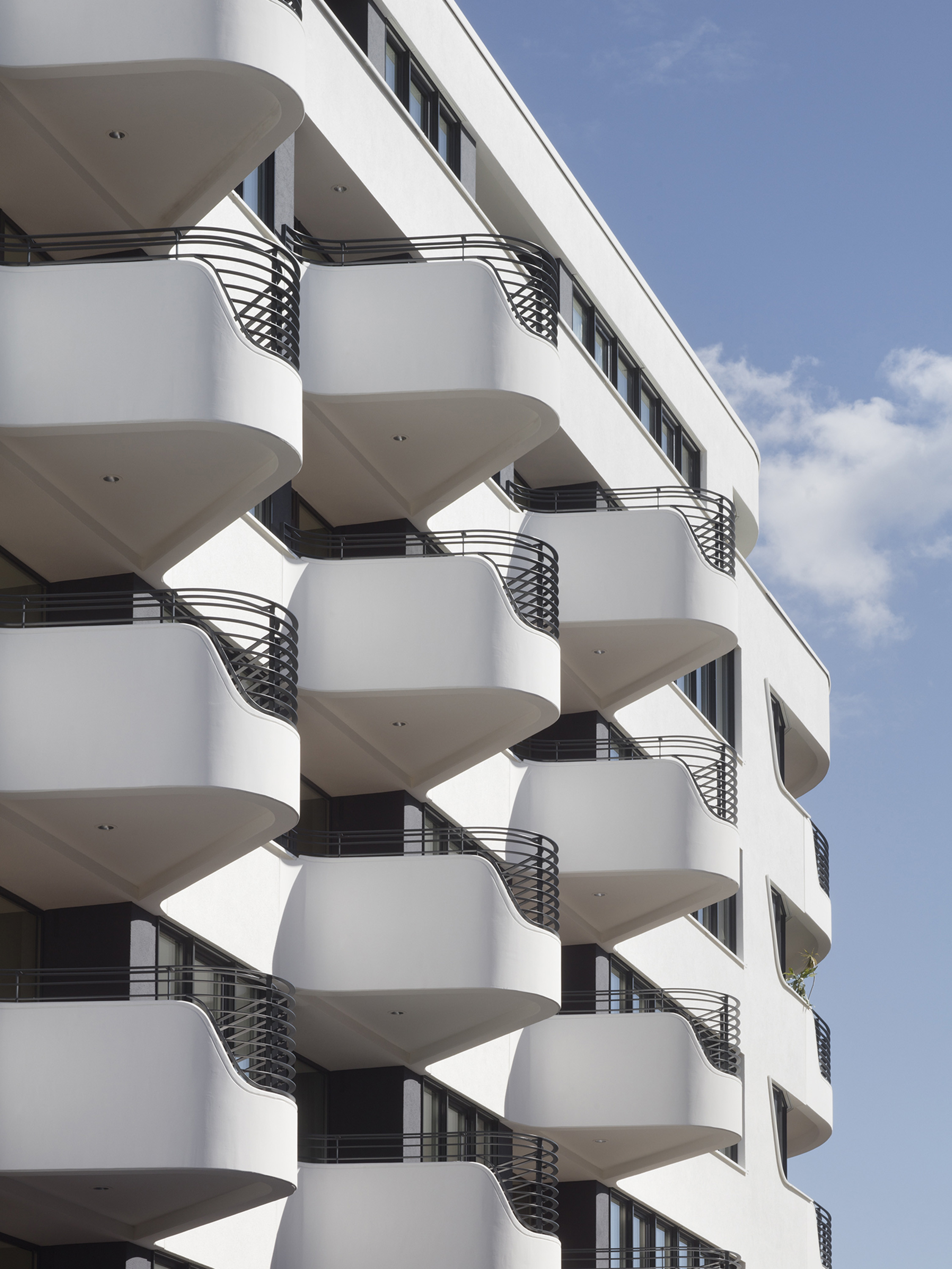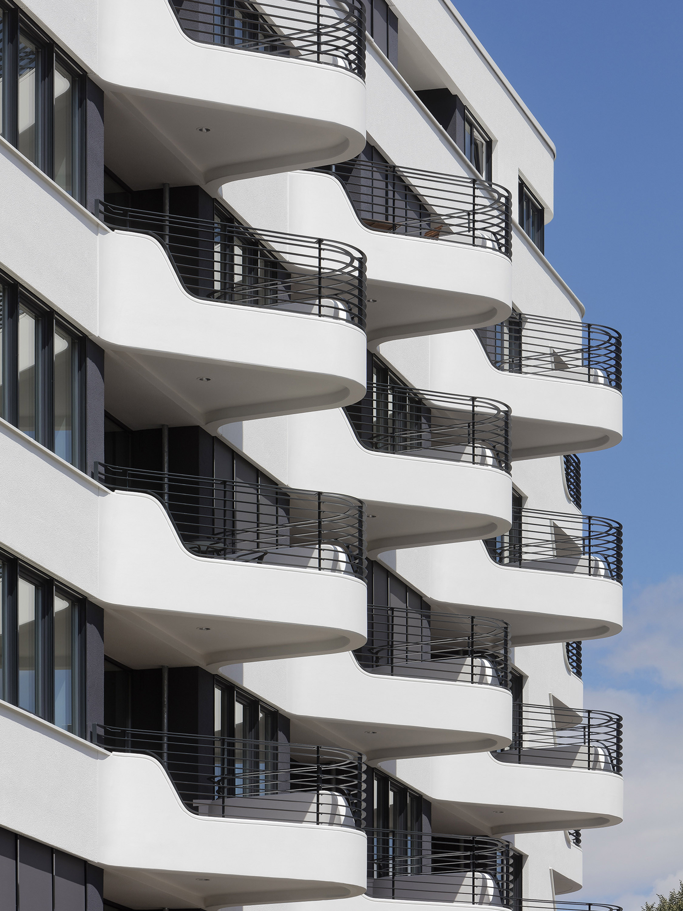 The details follow the leitmotif of the arch. It can be found in the rounded, partly ornamental outer and inner edges or, for example, in the undulating course of the balconies. In addition to the rounded corners, the high plasticity of the volume is achieved through the interplay of recessed and long arched cantilevered balconies made of elaborate precast concrete elements.