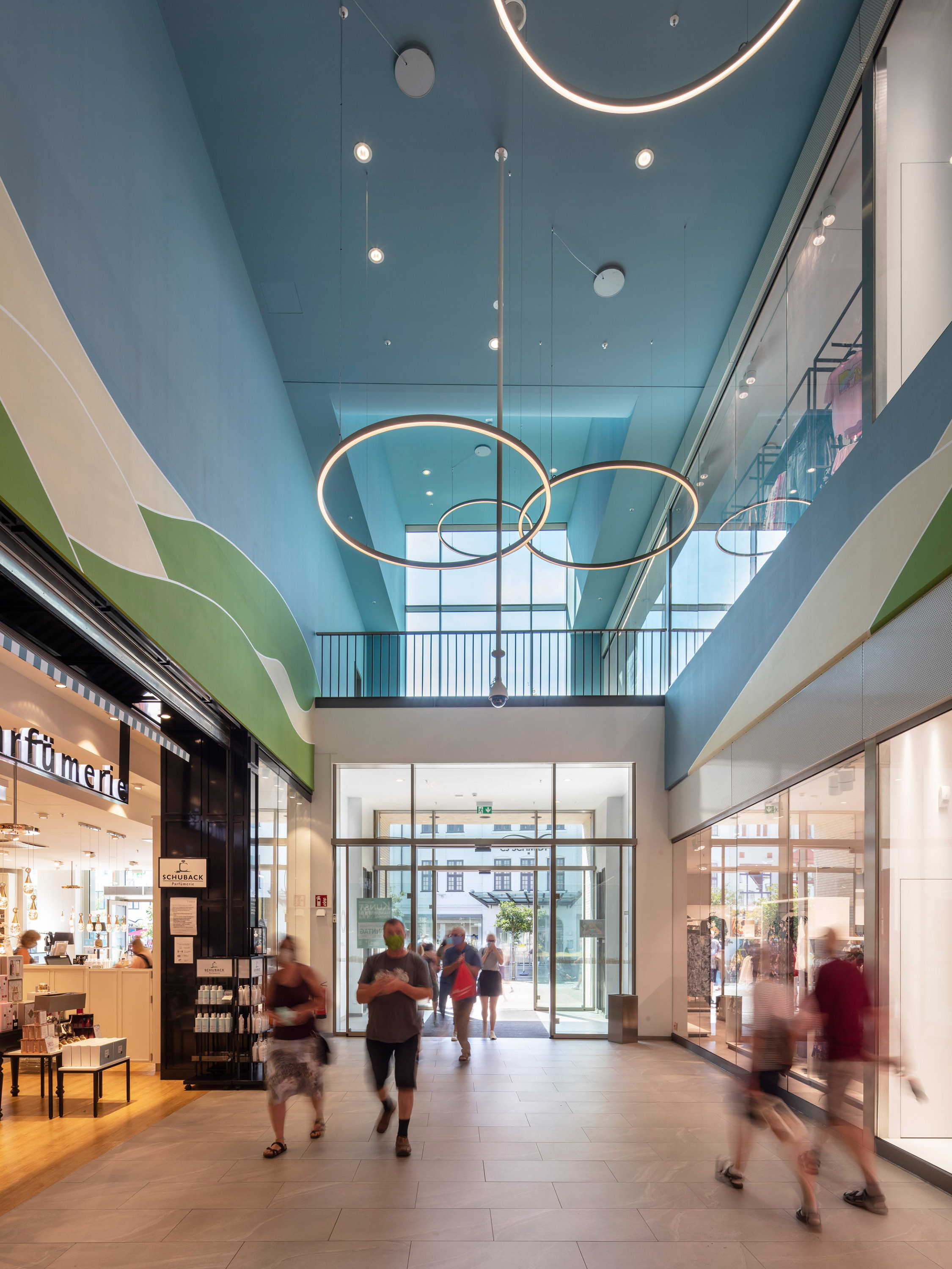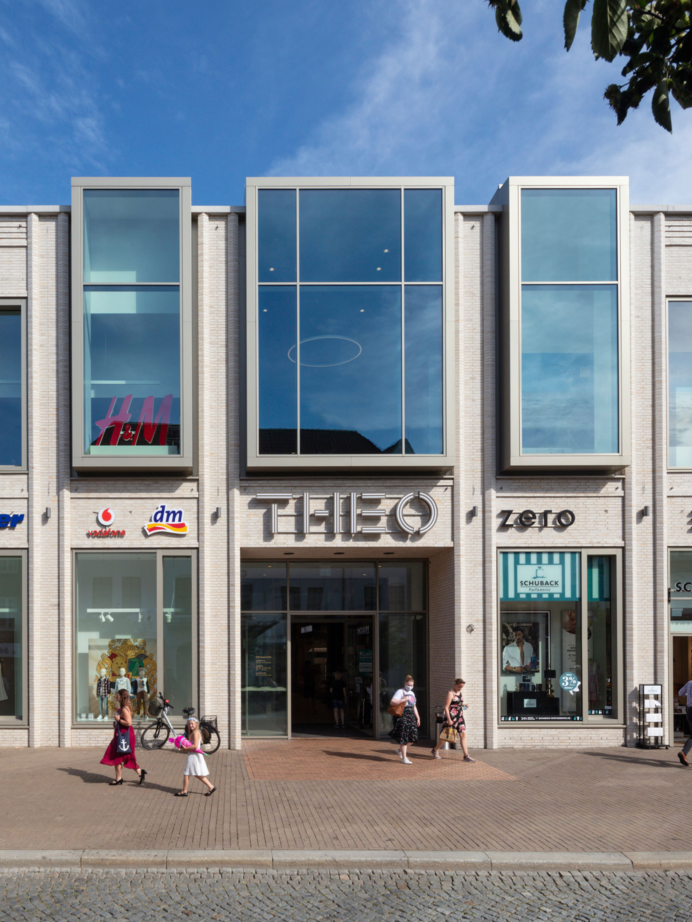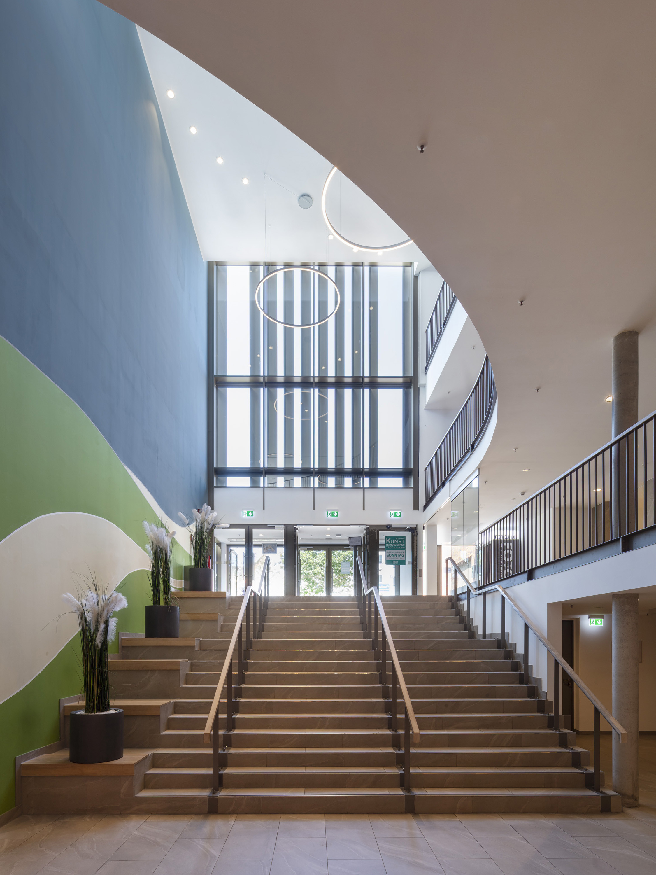 The façade facing Grossstrasse takes up the proportions of the local façades with generous shop windows and vertical masonry pillars. The clear structure and careful choice of materials allow the new building to stand out discreetly. The generously glazed entrance to the centre opens up on two floors to the public space – the slightly projecting light gables with bronze-coloured edges accentuate the entrance situation and additionally emphasise the vertical alignment of the entire volume. Sand-coloured brick in long format has a familiar look and the discreet ornamentation of coloured glazed, interspersed clinker bricks quotes the handcrafted element.