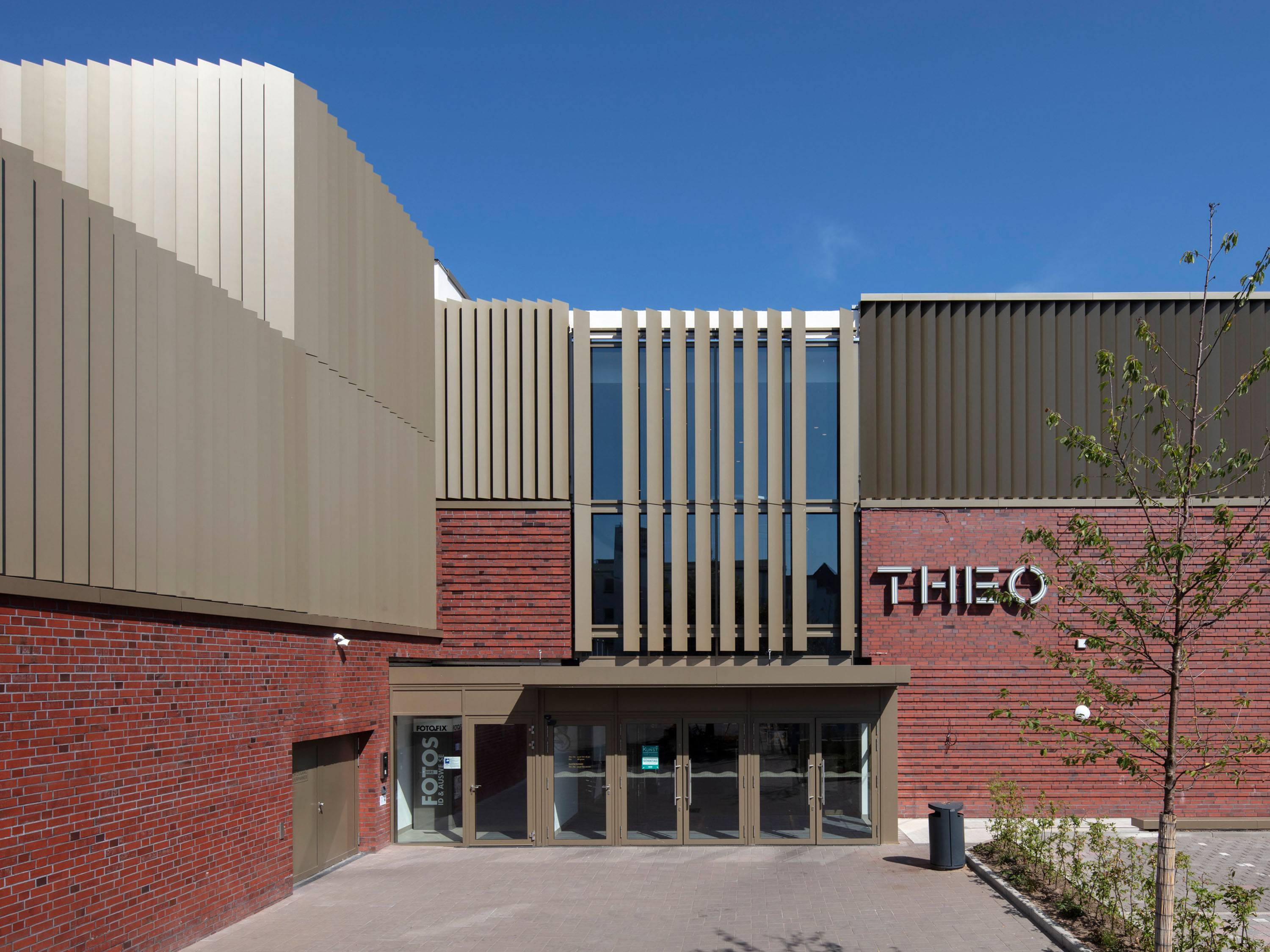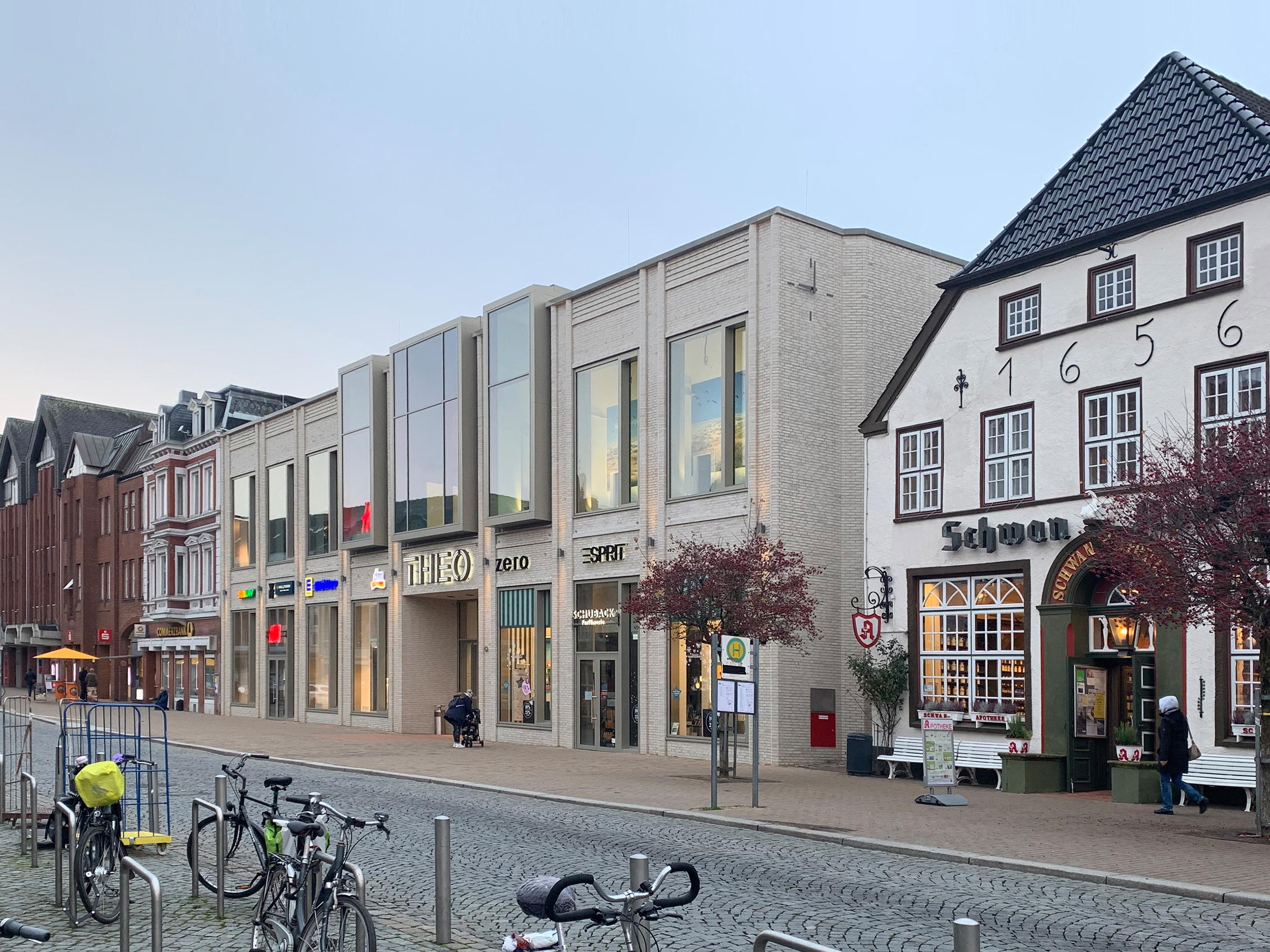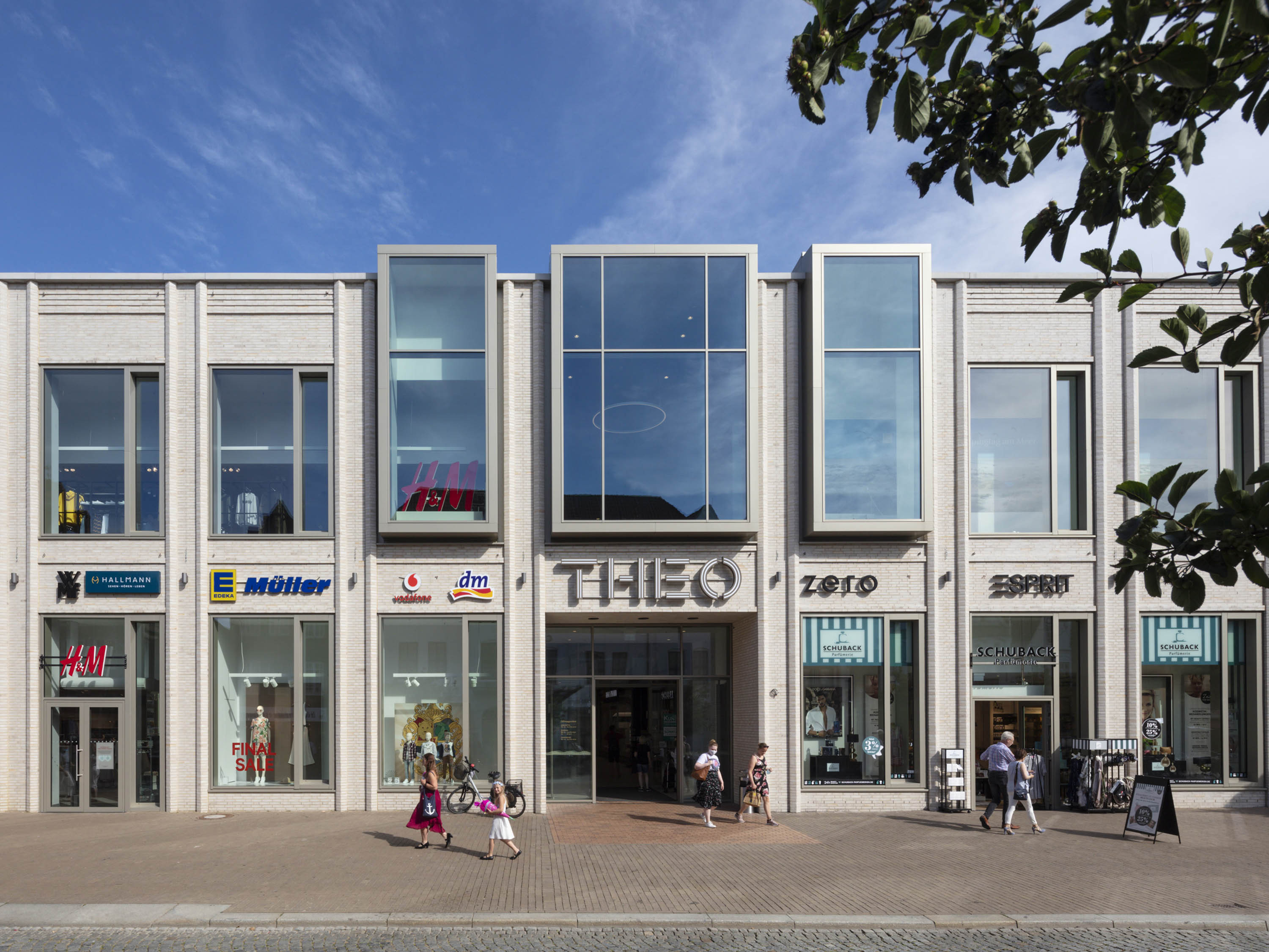 The façade facing Grossstrasse takes up the proportions of the local façades with generous shop windows and vertical masonry pillars. The clear structure and careful choice of materials allow the new building to stand out discreetly. The generously glazed entrance to the centre opens up on two floors to the public space – the slightly projecting light gables with bronze-coloured edges accentuate the entrance situation and additionally emphasise the vertical alignment of the entire volume. Sand-coloured brick in long format has a familiar look and the discreet ornamentation of coloured glazed, interspersed clinker bricks quotes the handcrafted element.
