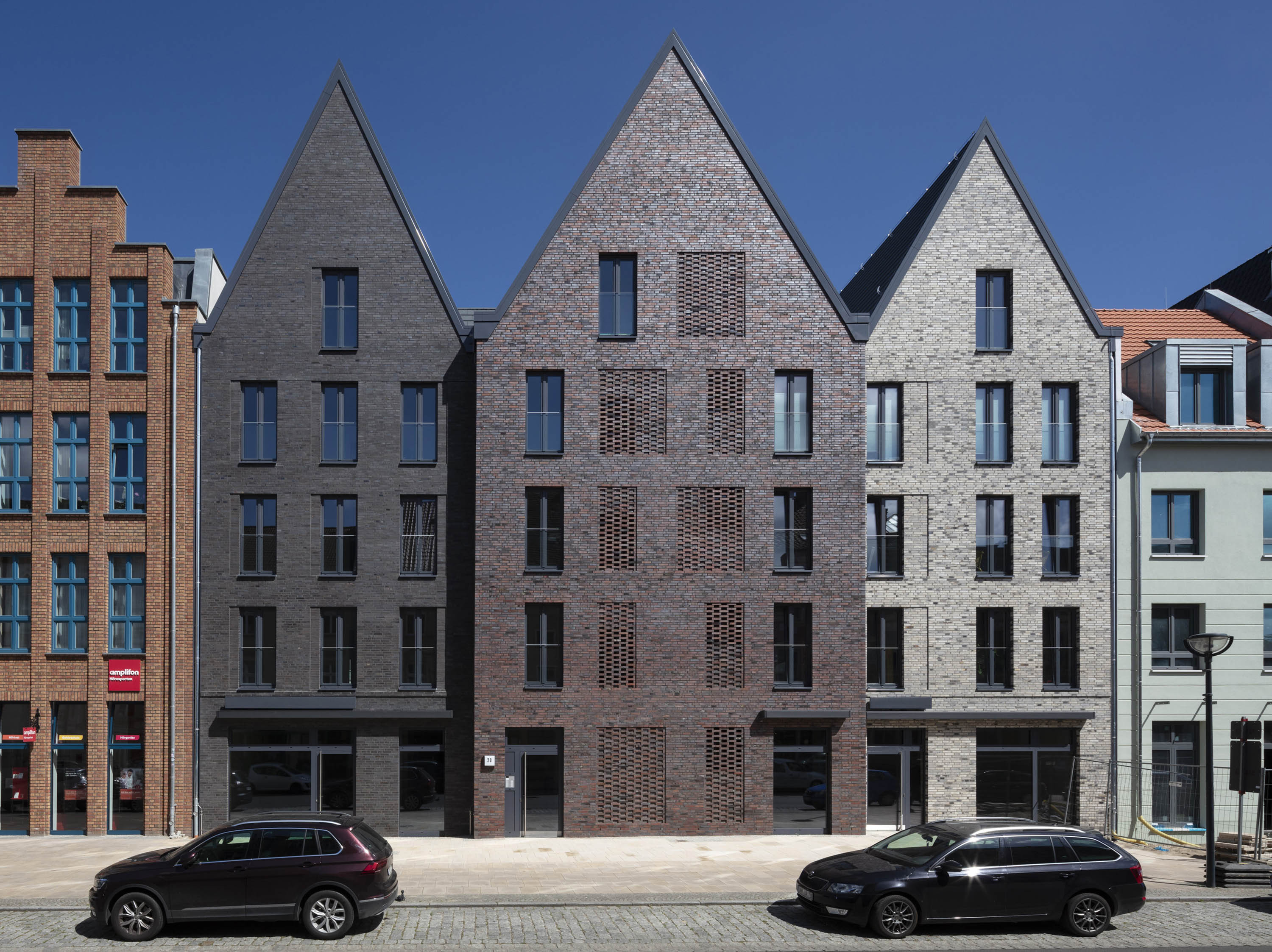 In reference to traditional plot sizes, the street façade is divided vertically into three parts. The rhythmic but uneven division of the front is emphasized by the slight protrusion of the middle facade gable and the differing ridge heights.
