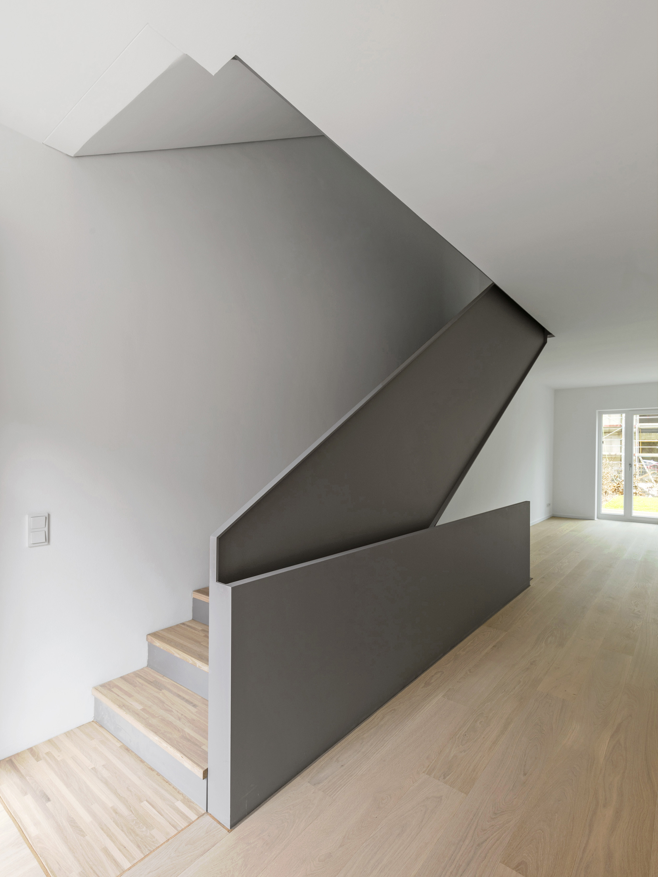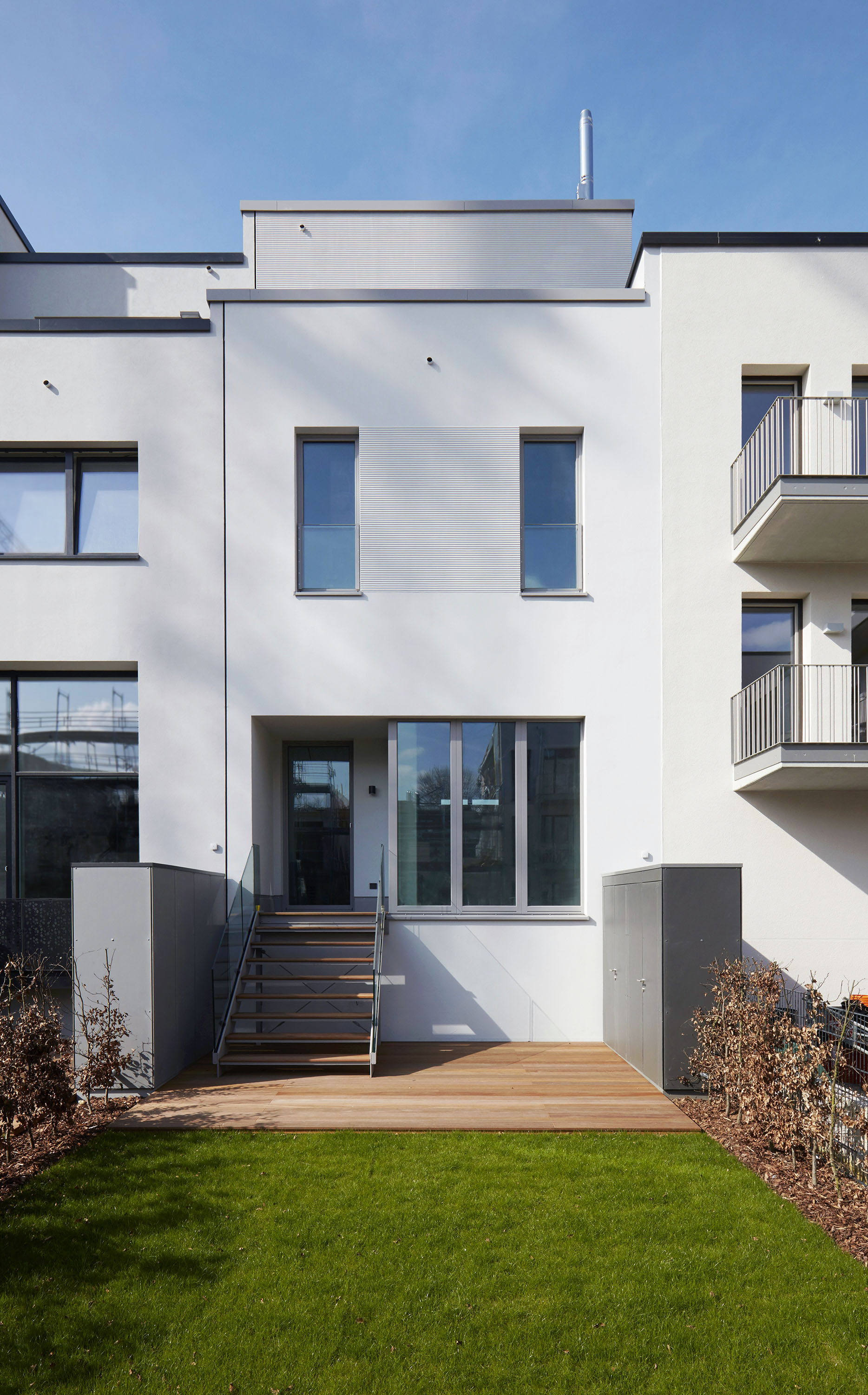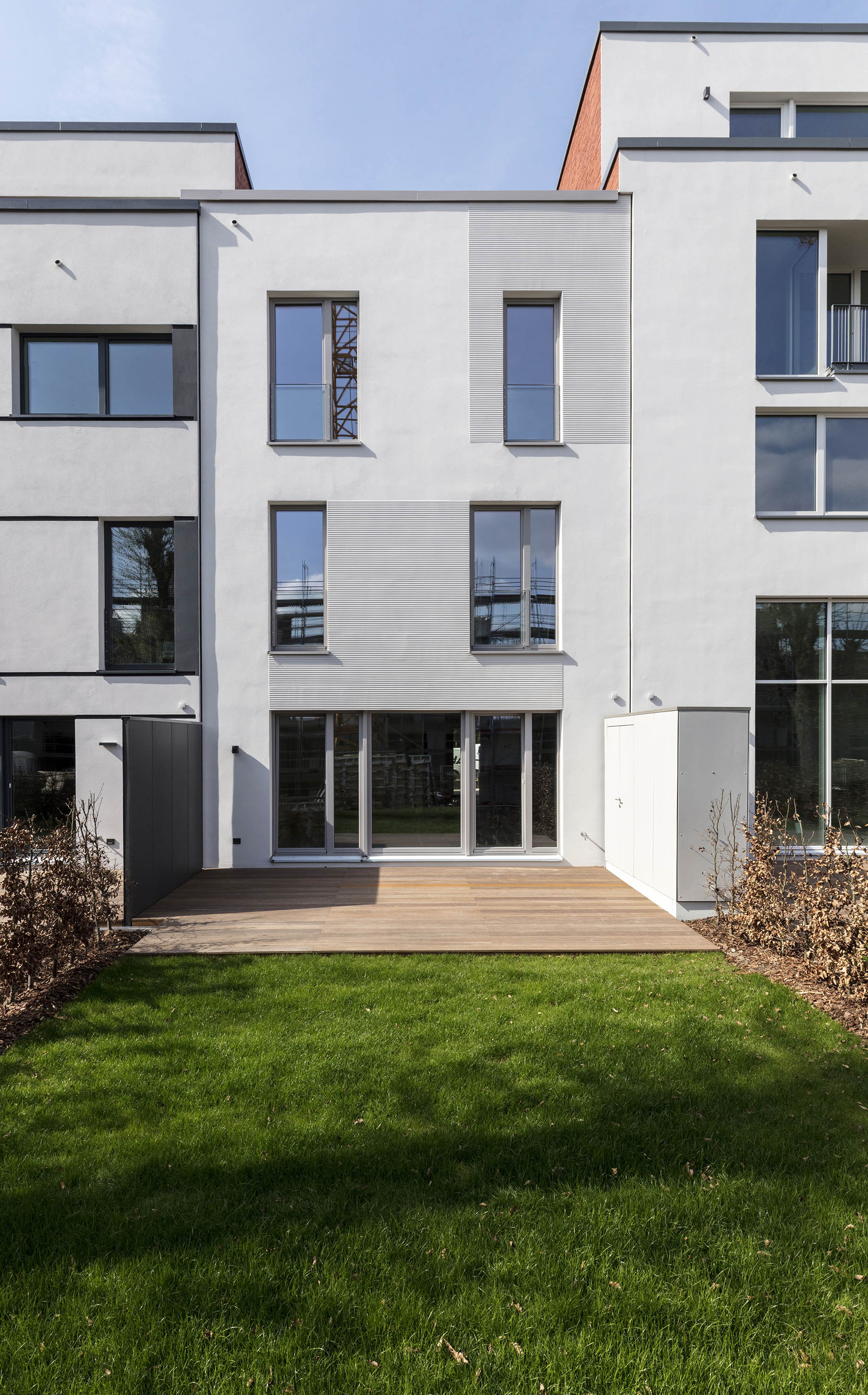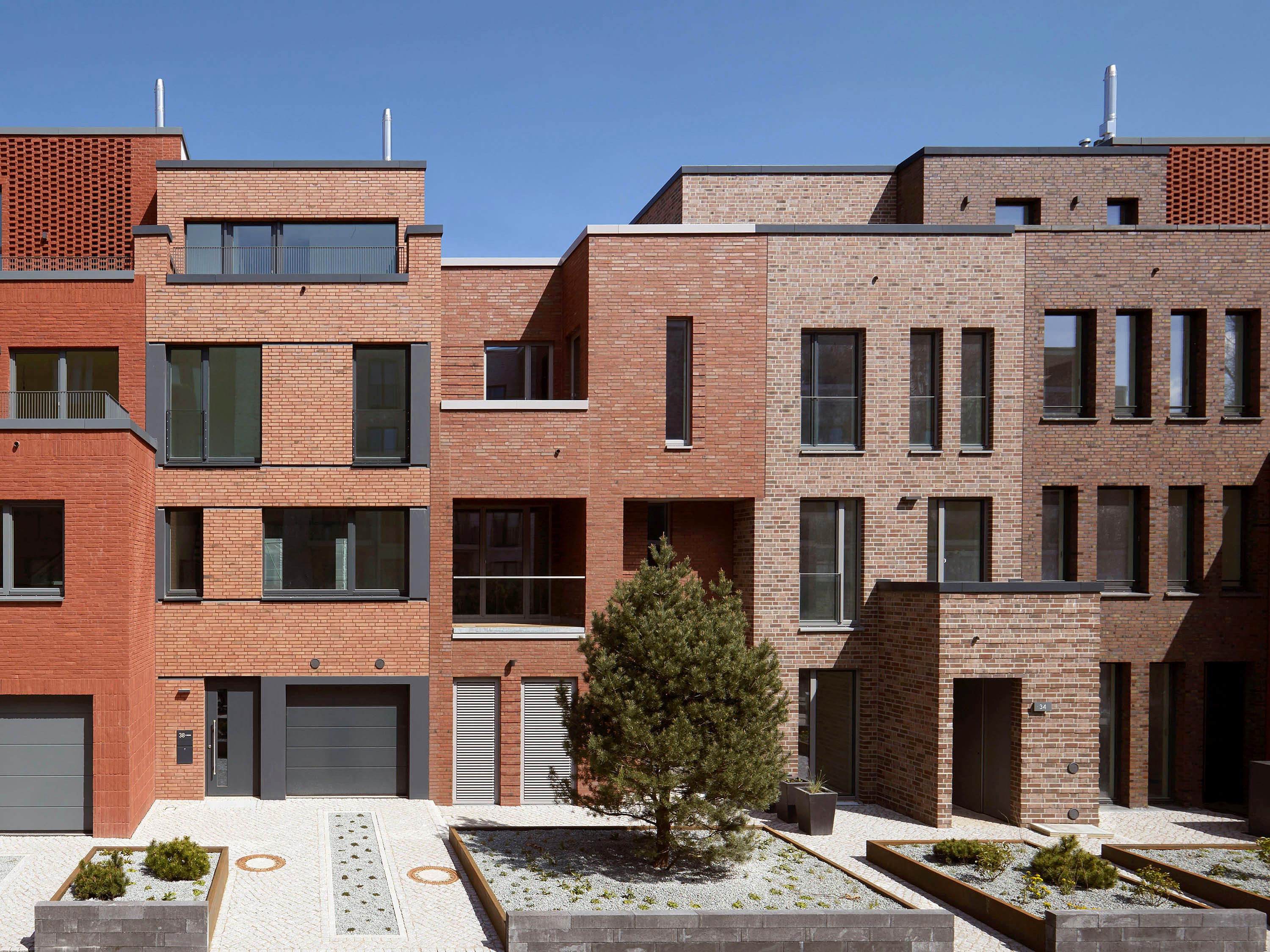 Two building types form the four houses completed at different positions in this row, one each in a basic and mirrored arrangement. Both designs work with protruding and recessed volumes, with the shifts developing from the floor plans in each case.