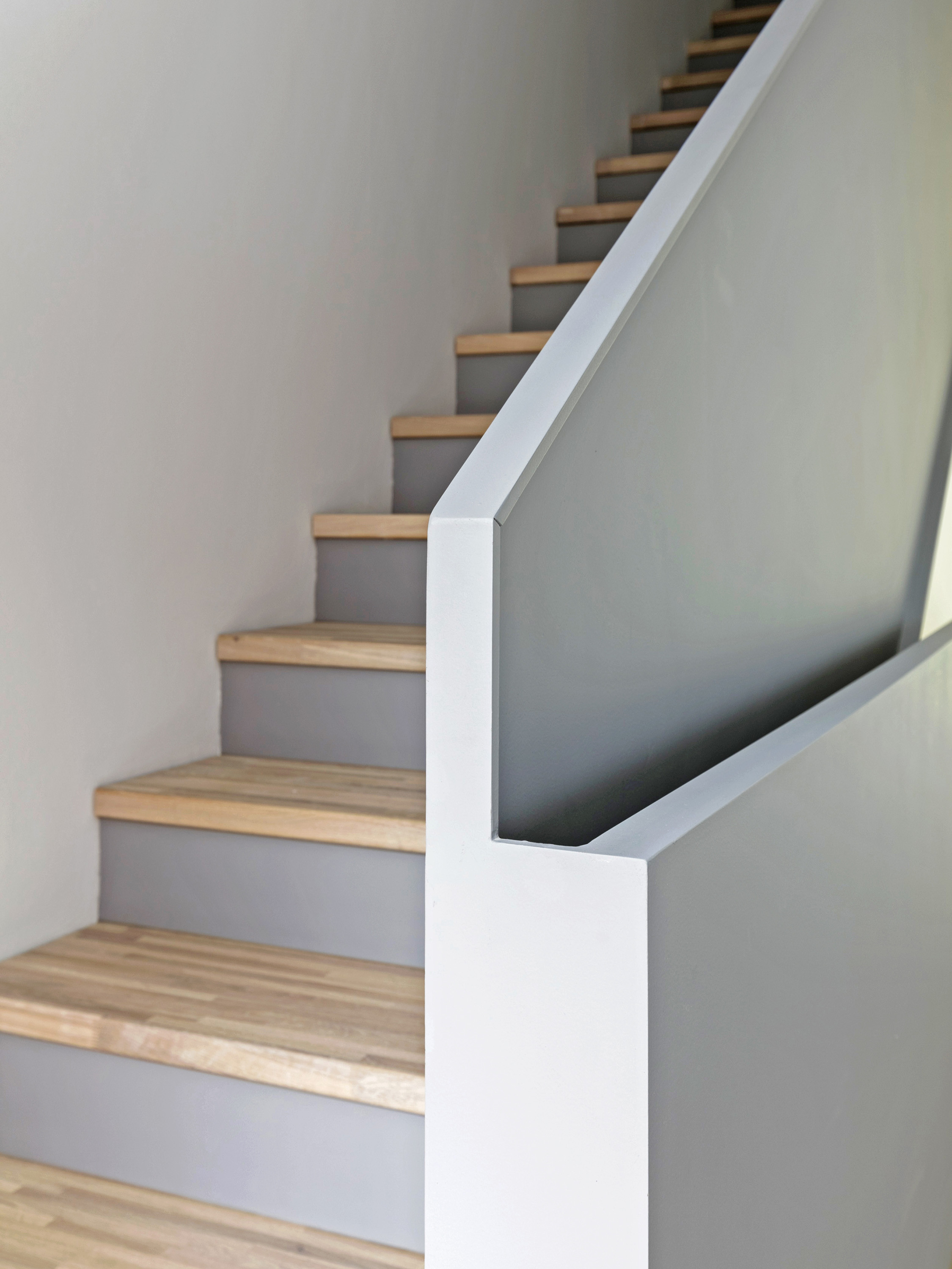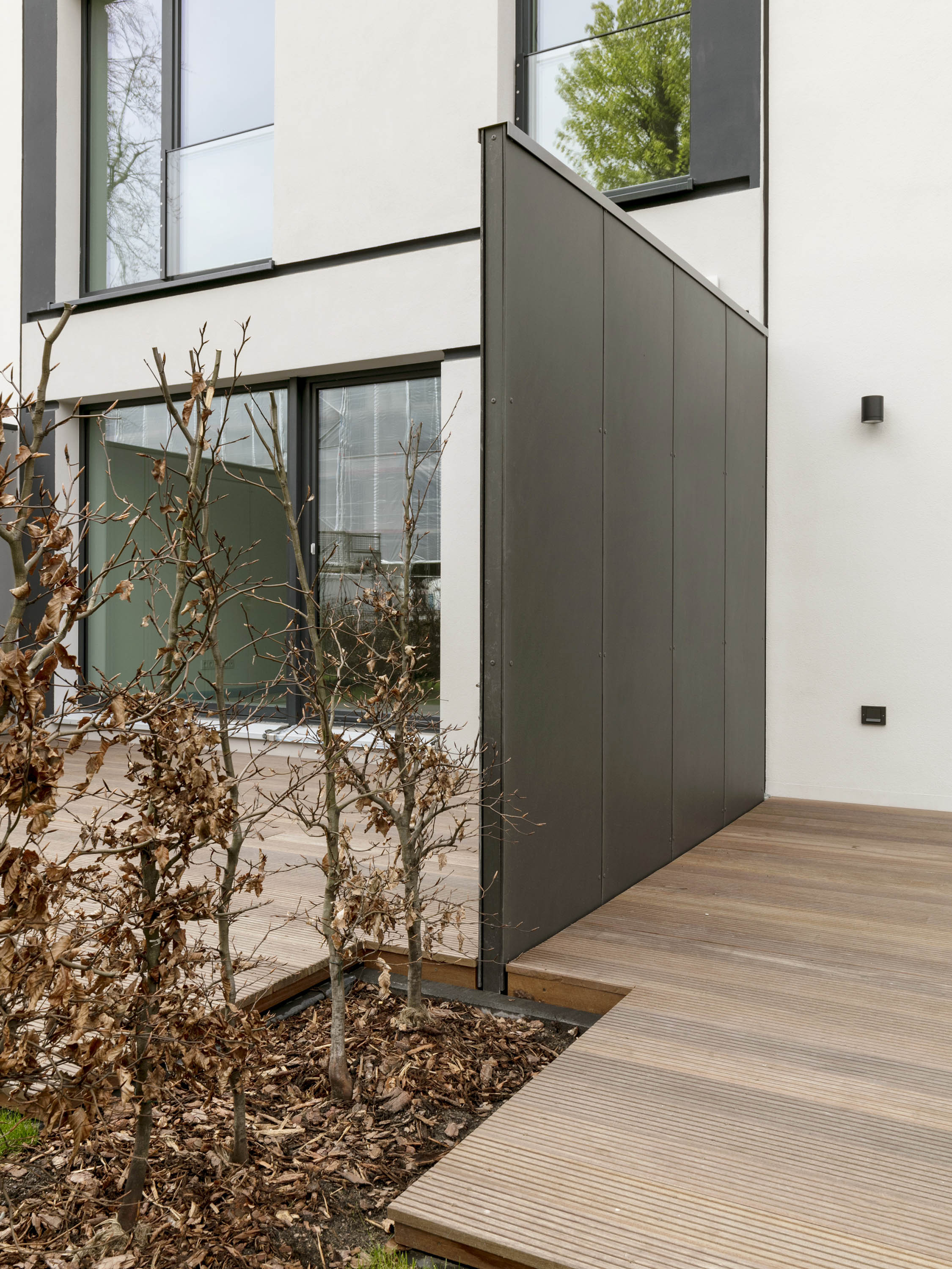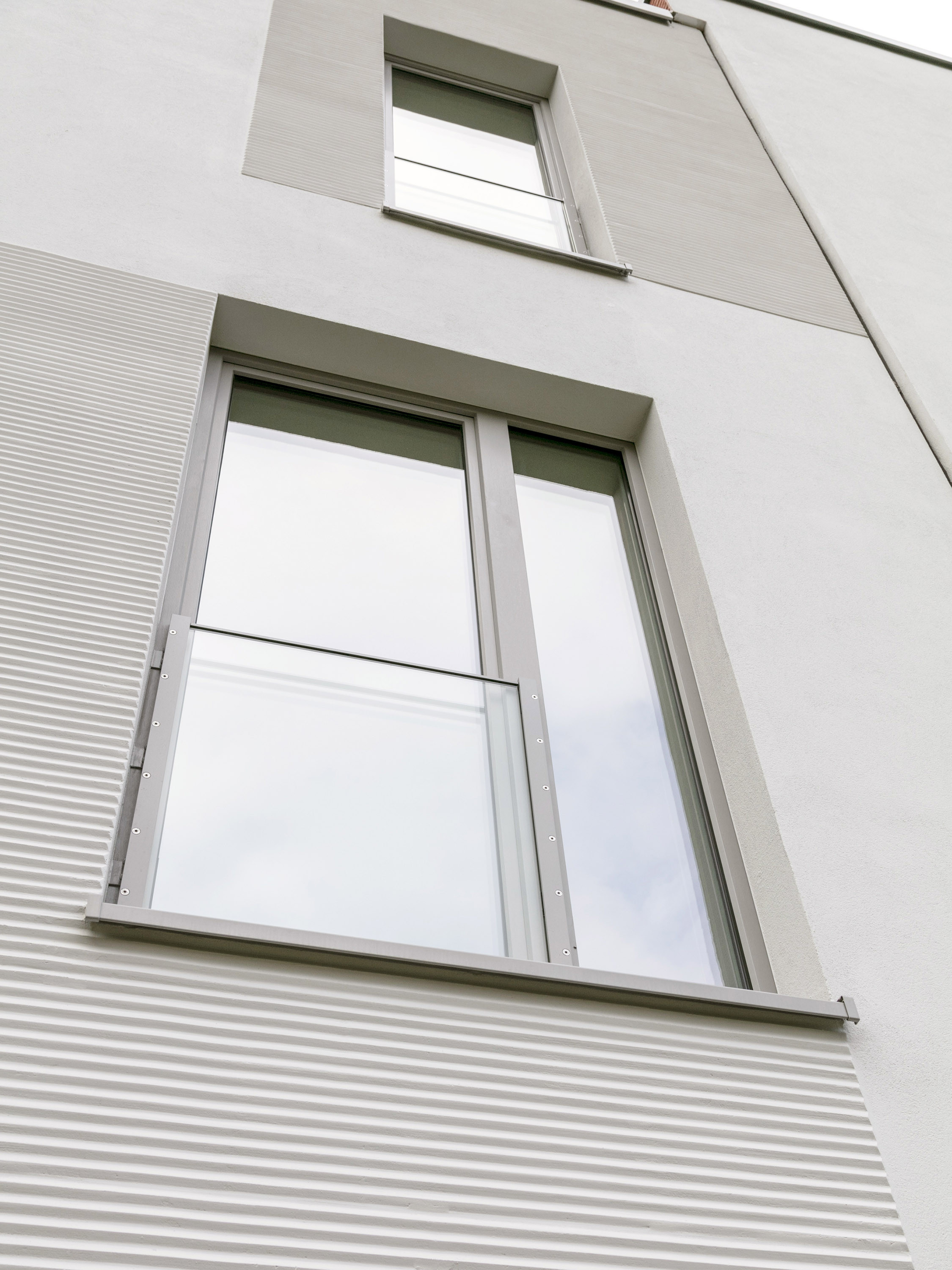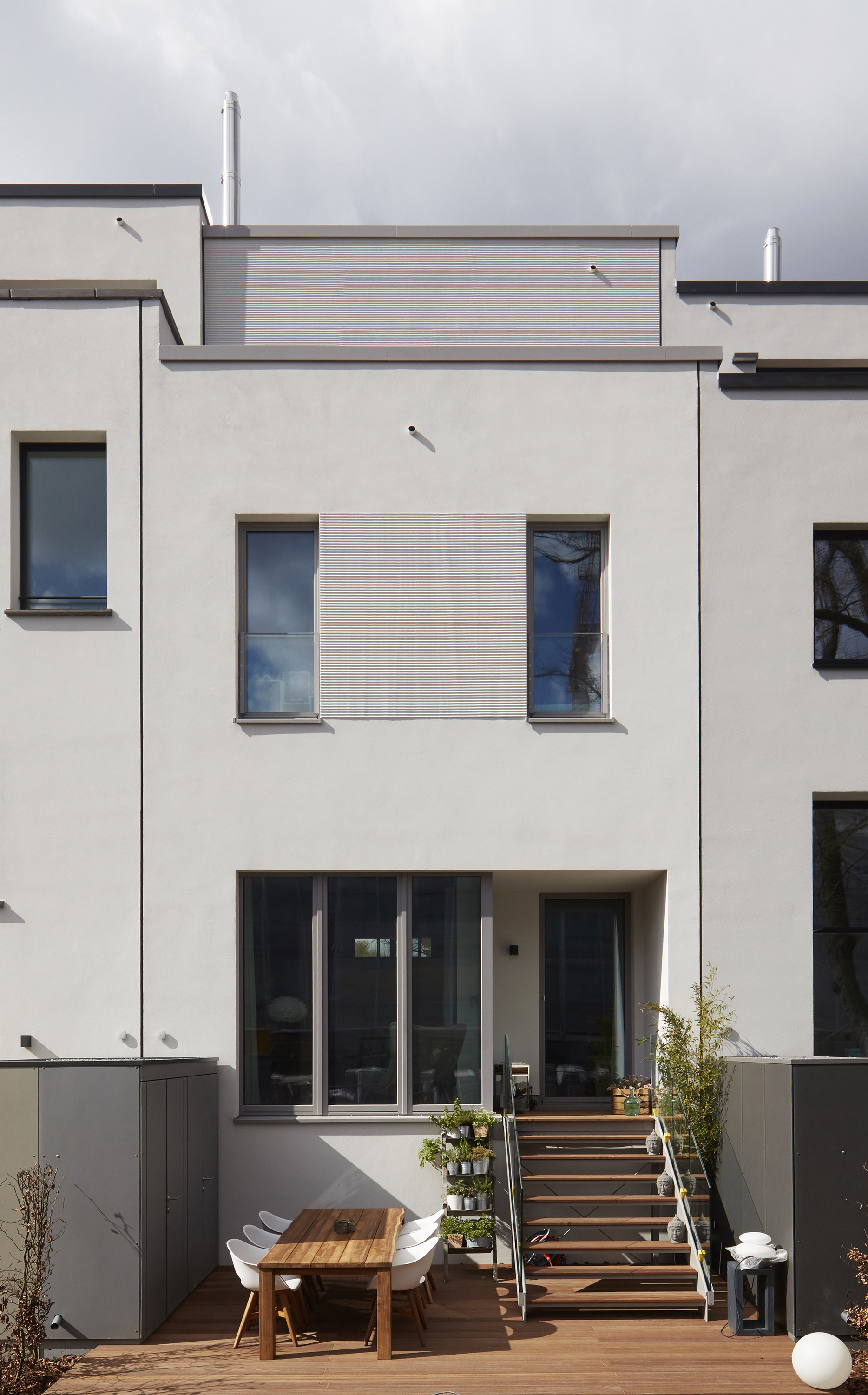 Two building types form the four houses completed at different positions in this row, one each in a basic and mirrored arrangement. Both designs work with protruding and recessed volumes, with the shifts developing from the floor plans in each case.