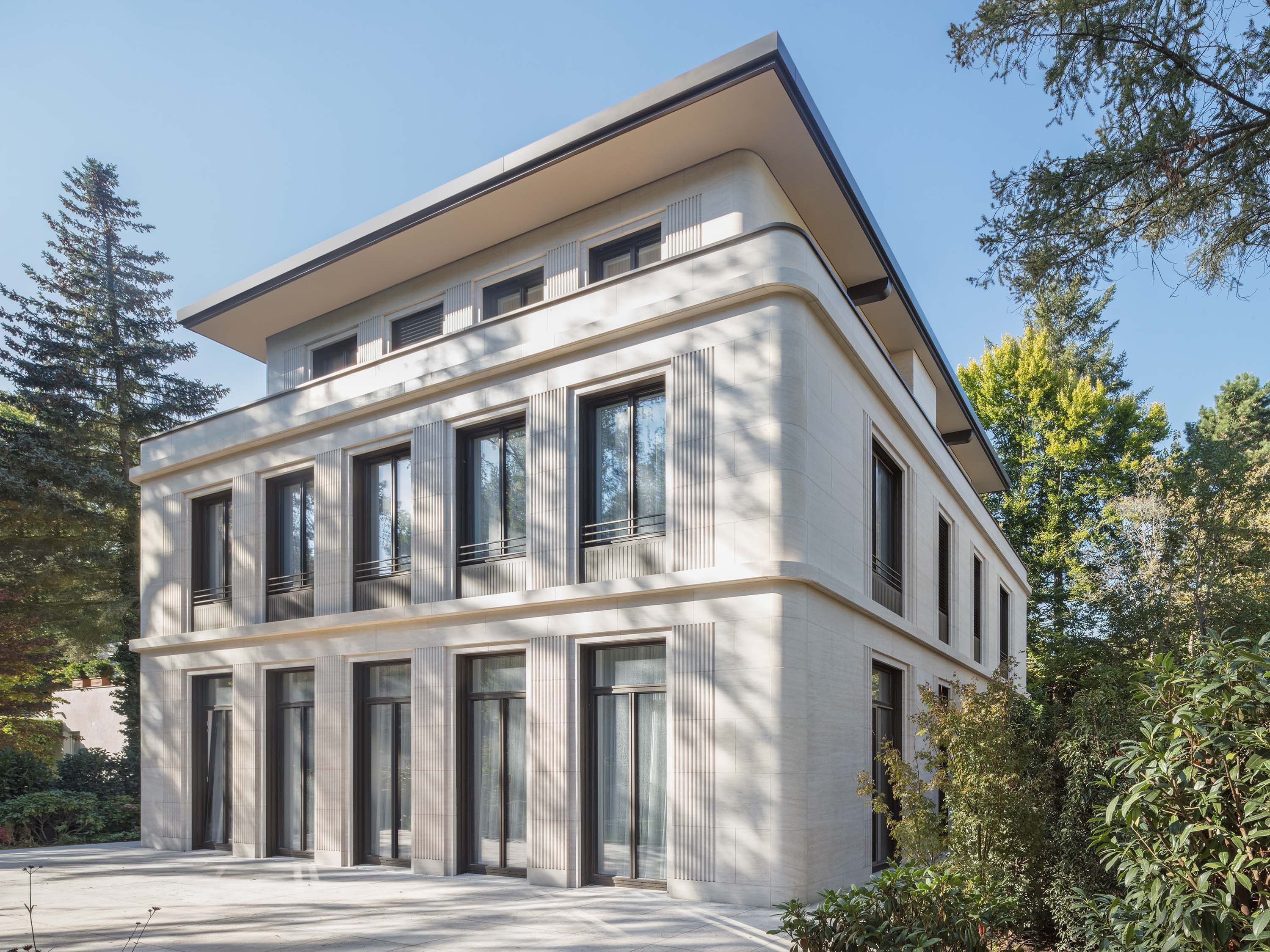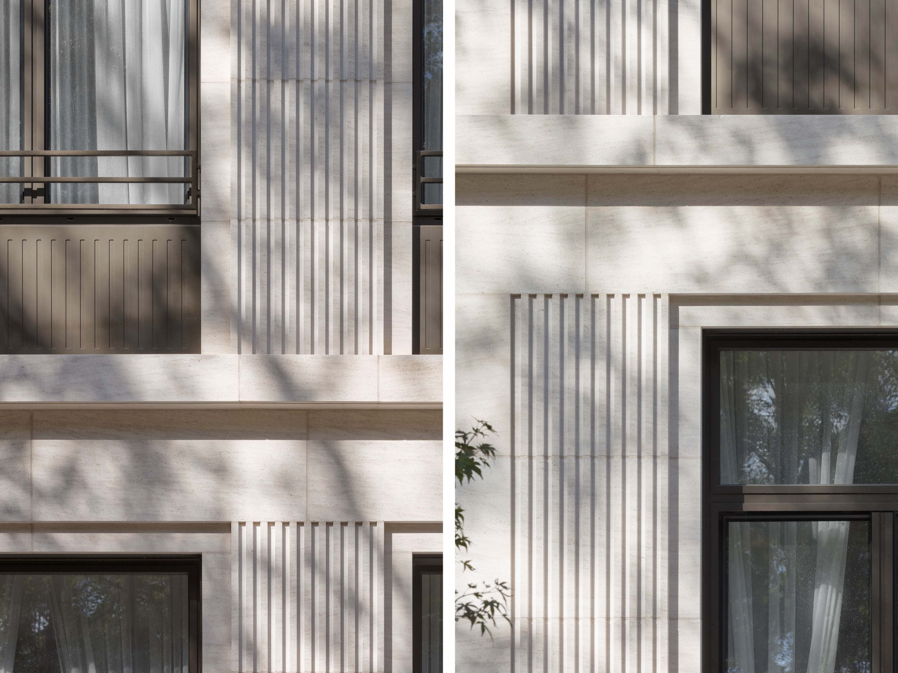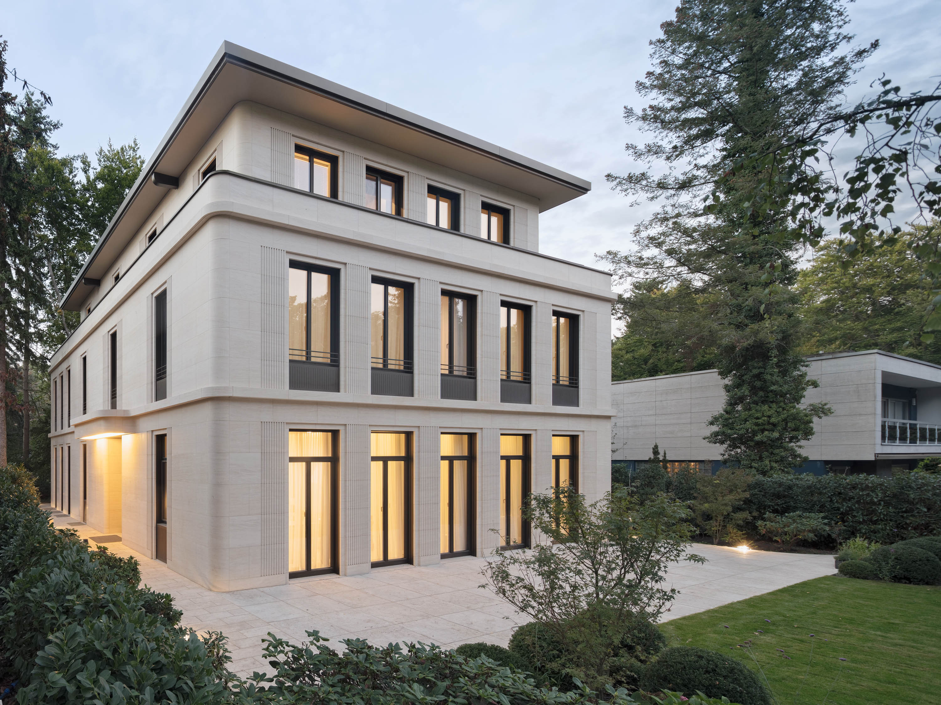 The façades are clad in light beige Portuguese limestone. The vertically aligned windows rhythmise the surfaces - room-high on the ground floor, with a low parapet on the first floor and a parapet on the staggered floor - together with two horizontally continuous cornices.