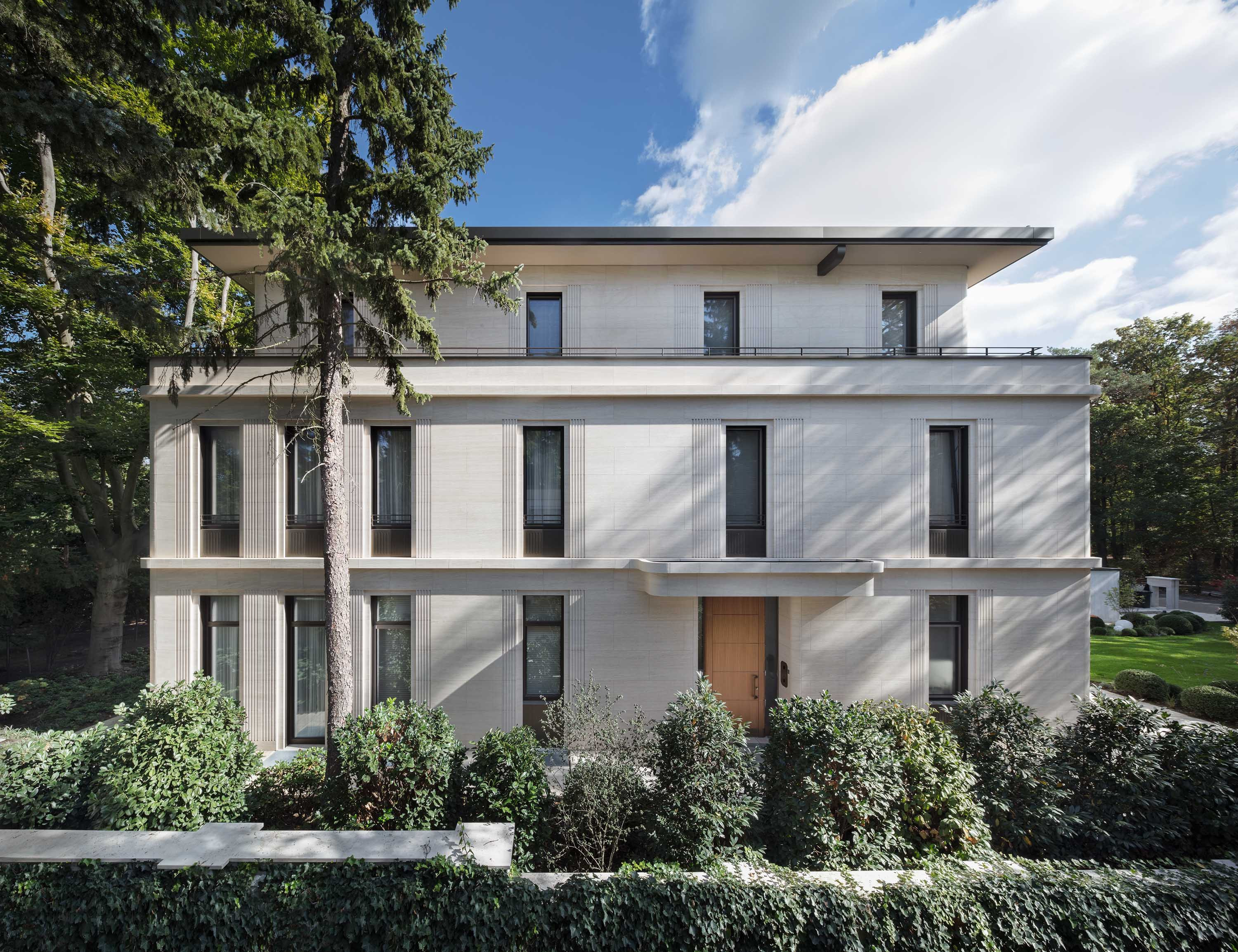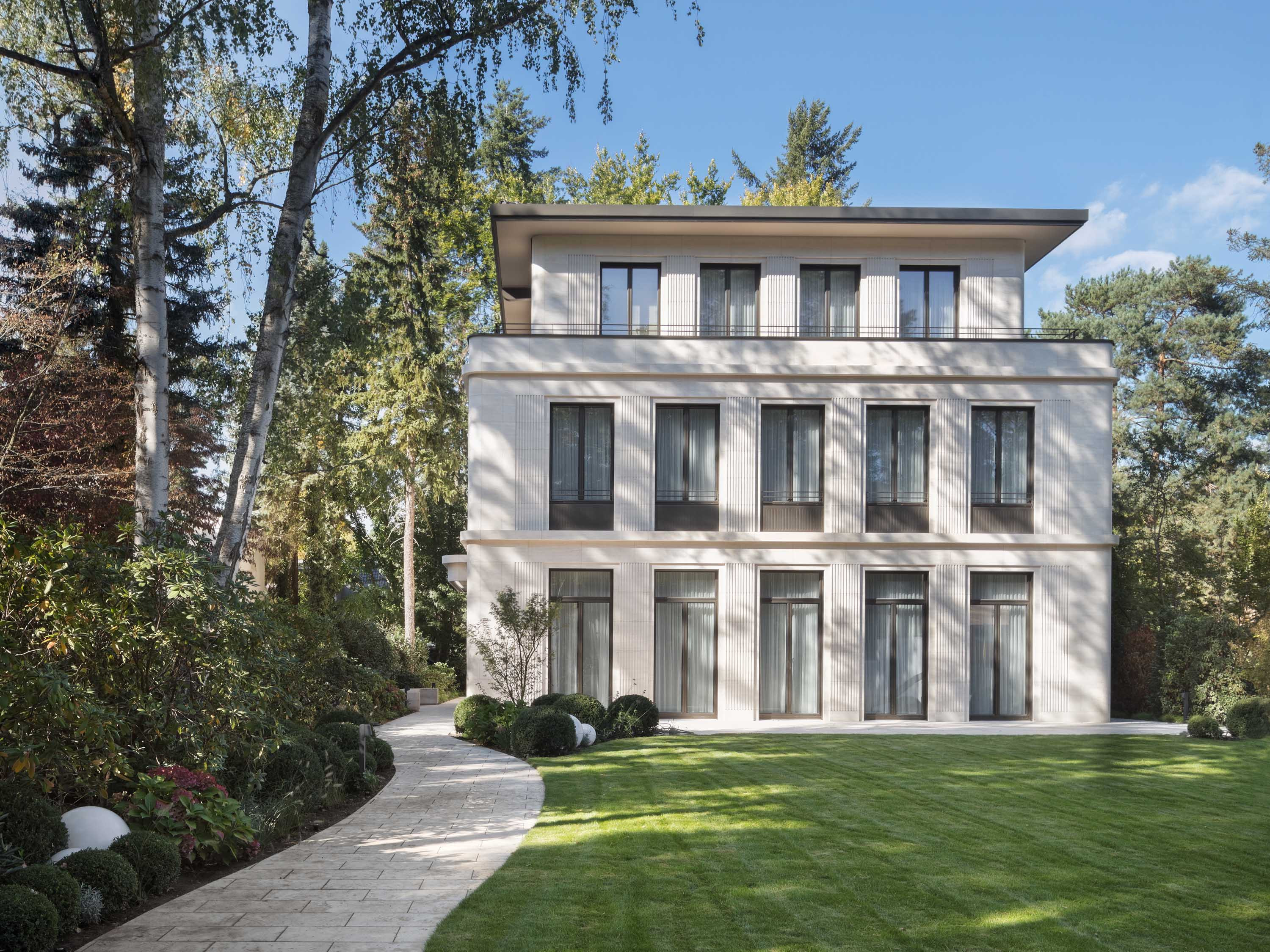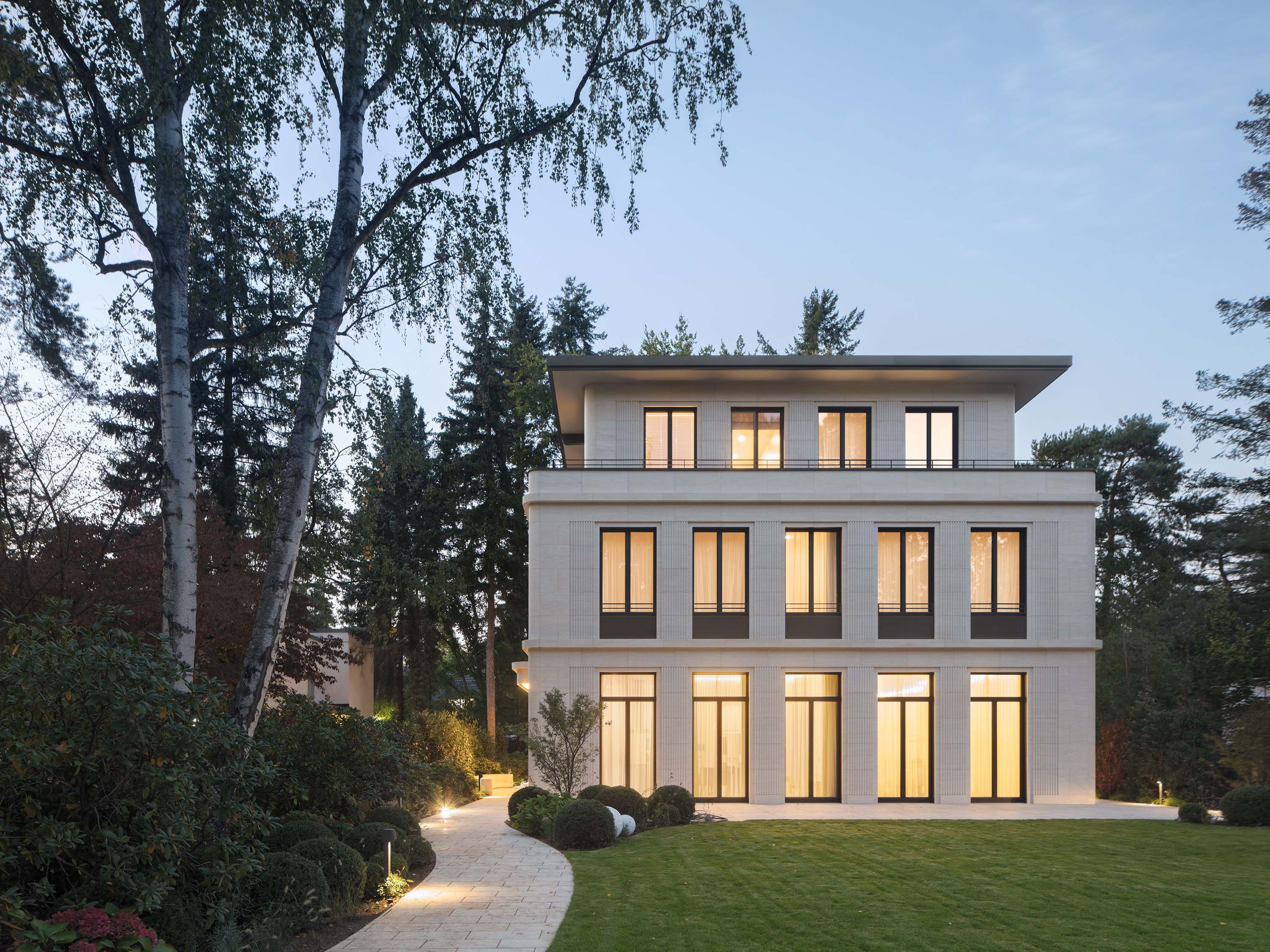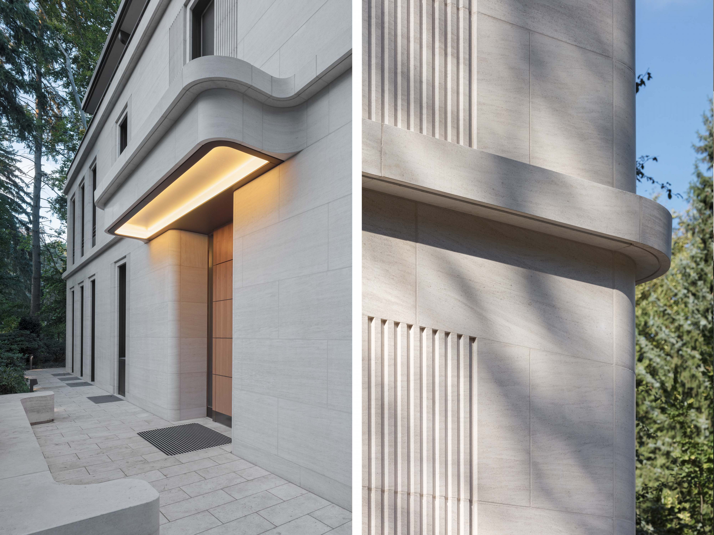 The façades are clad in light beige Portuguese limestone. The vertically aligned windows rhythmise the surfaces - room-high on the ground floor, with a low parapet on the first floor and a parapet on the staggered floor - together with two horizontally continuous cornices.