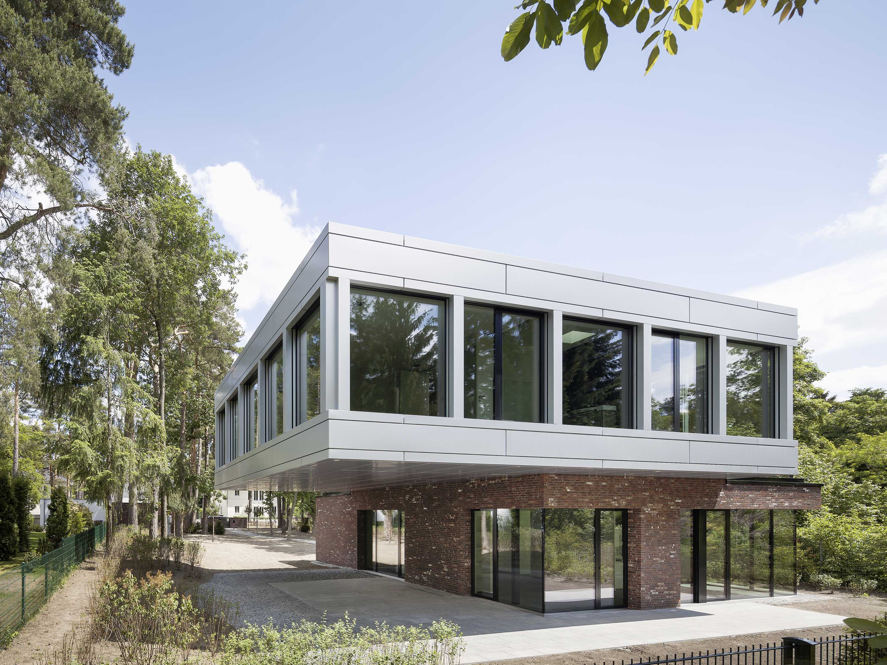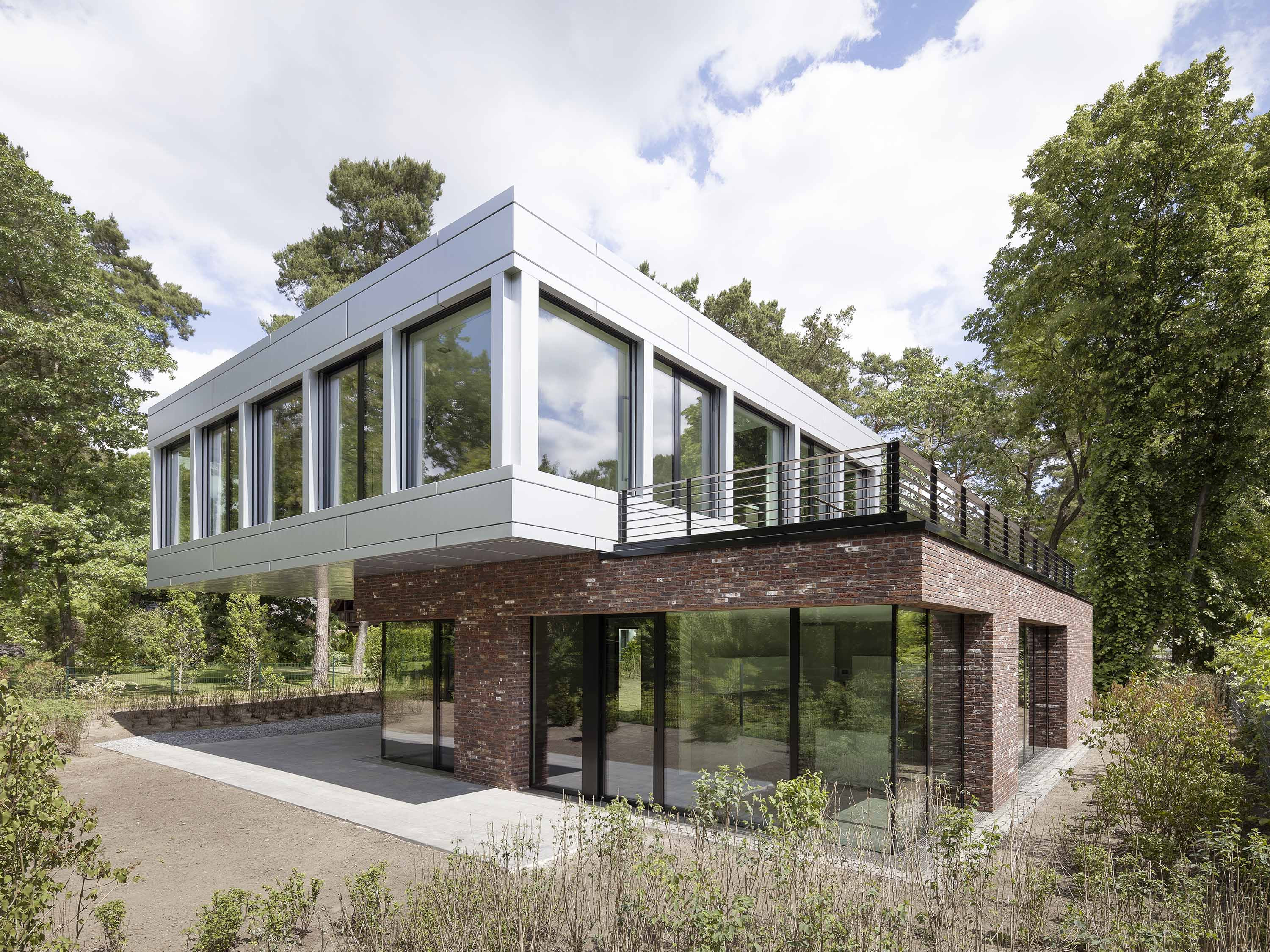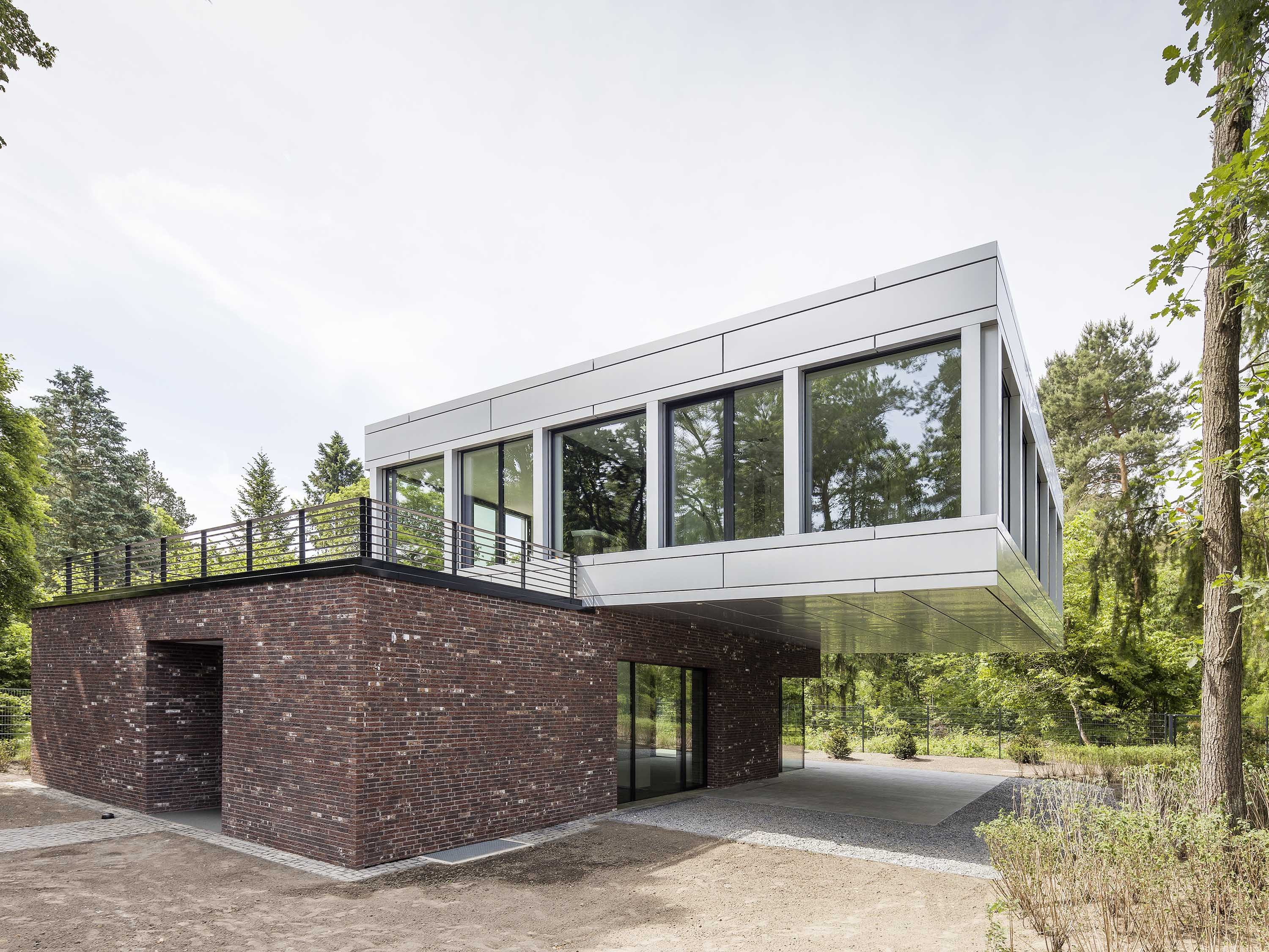 The solid plinth area is set at ground level and finished in brick. Its façades face south with wide window fronts. The upper floor has floor-to-ceiling glazing on all sides and thus offers the residents an unrestricted view of the forest and garden.