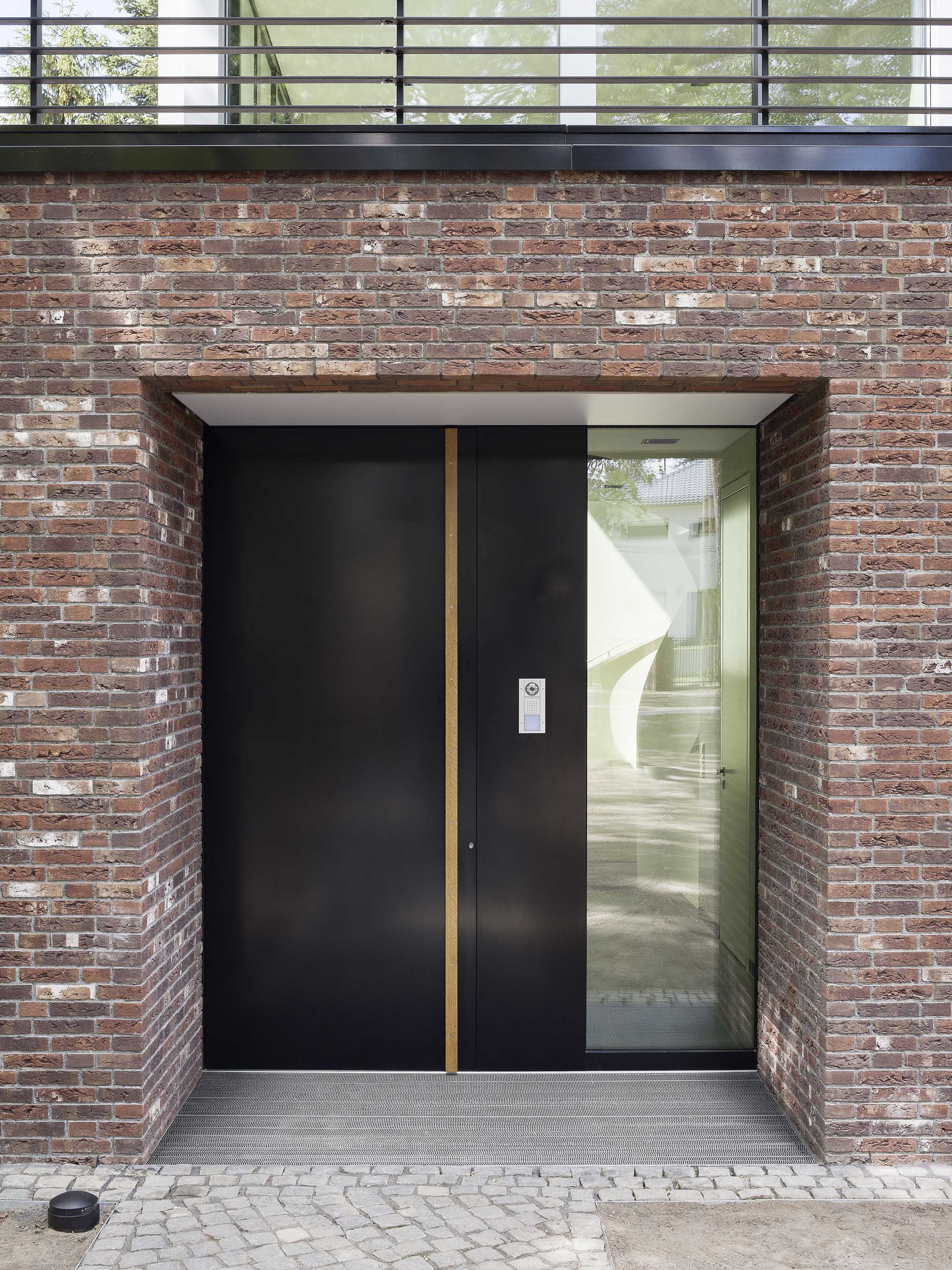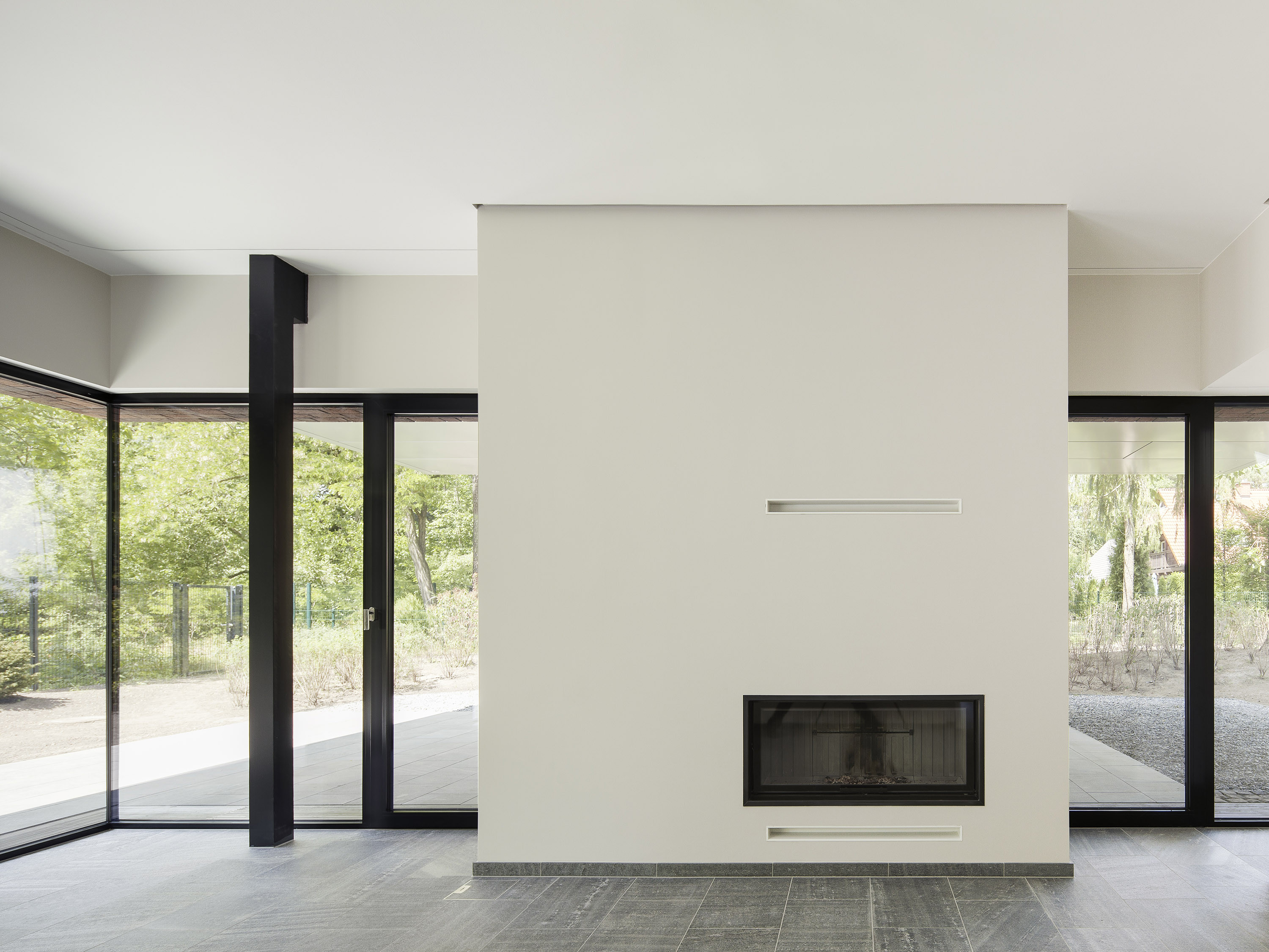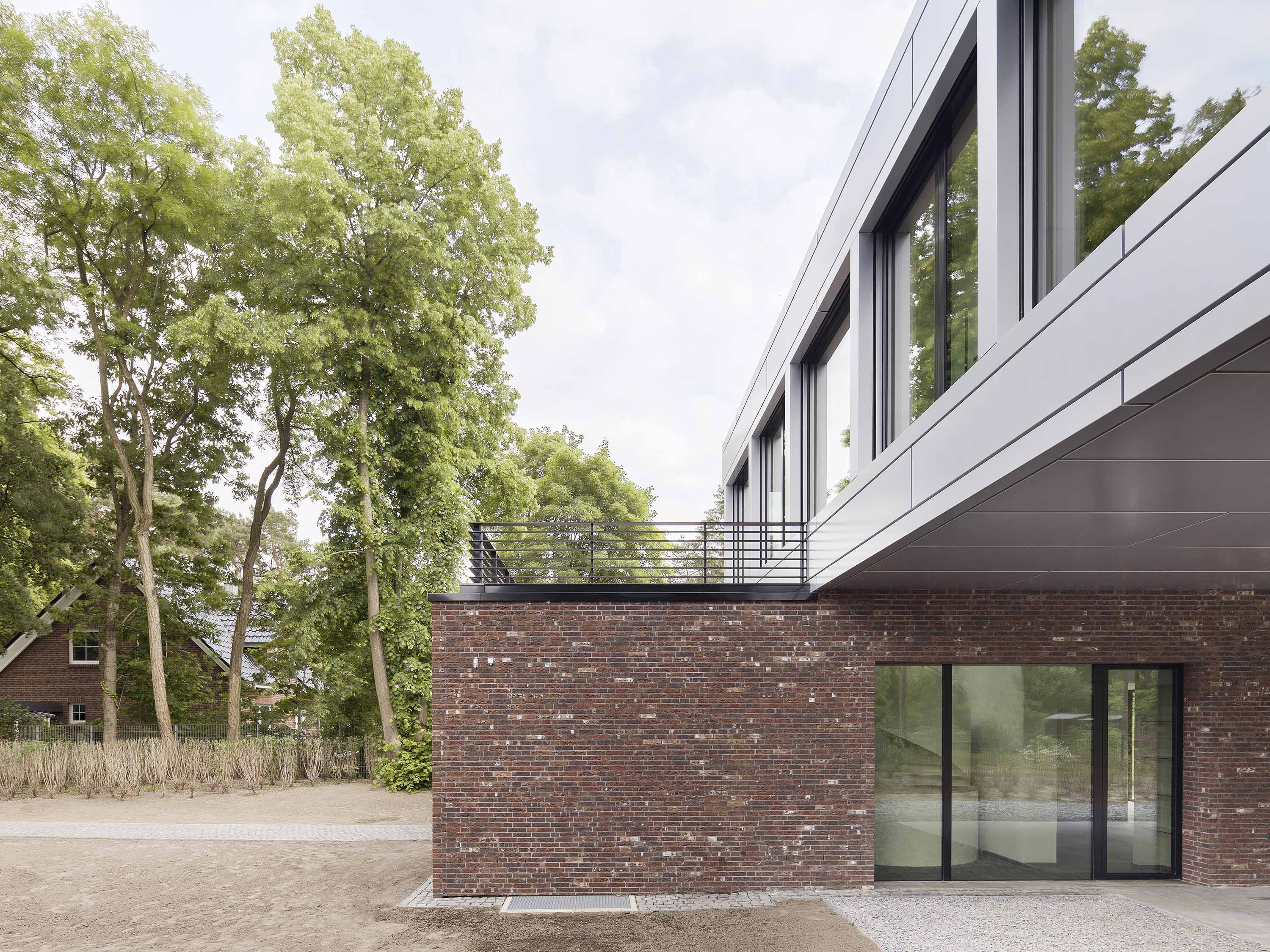 The solid plinth area is set at ground level and finished in brick. Its façades face south with wide window fronts. The upper floor has floor-to-ceiling glazing on all sides and thus offers the residents an unrestricted view of the forest and garden.