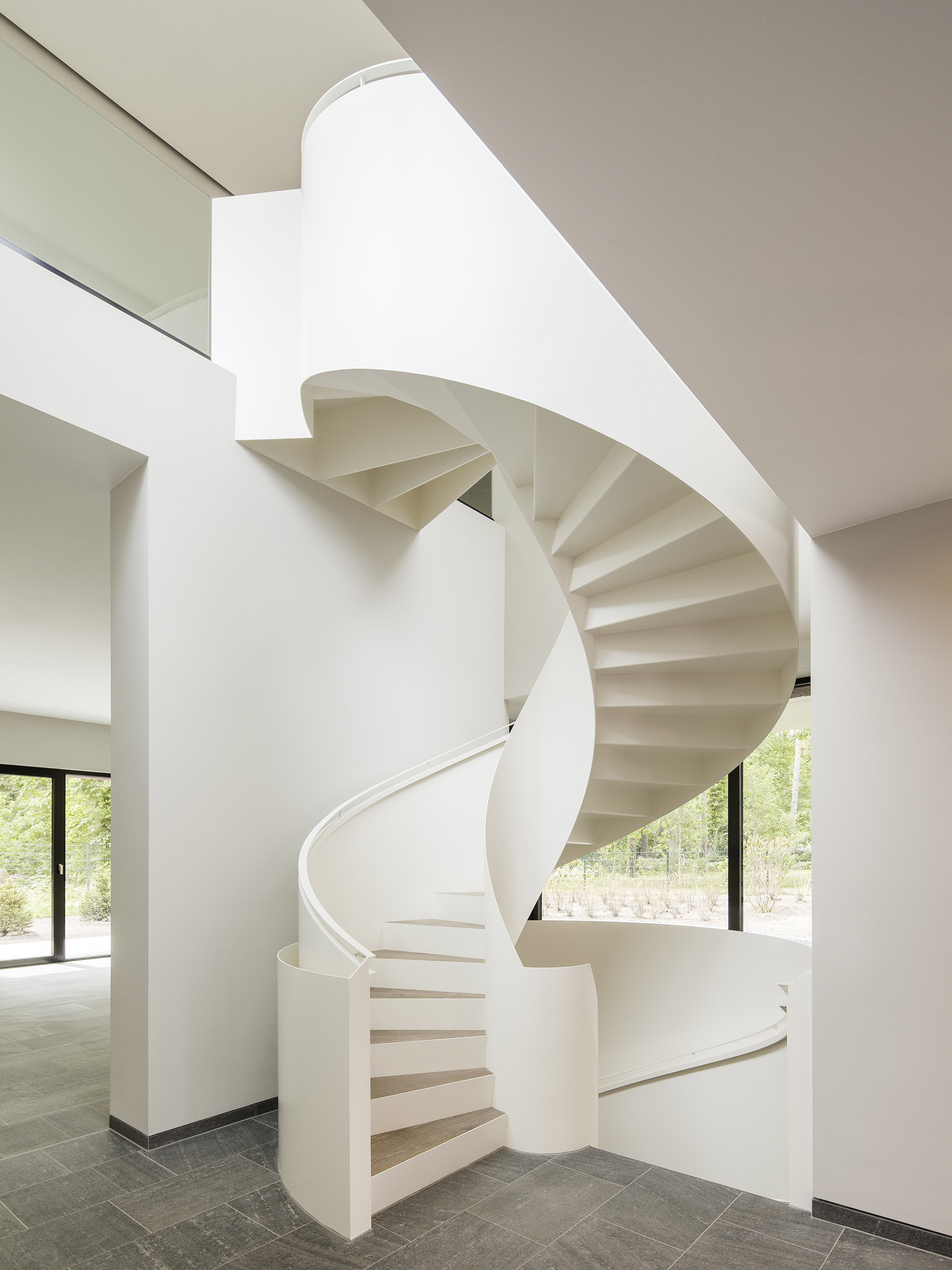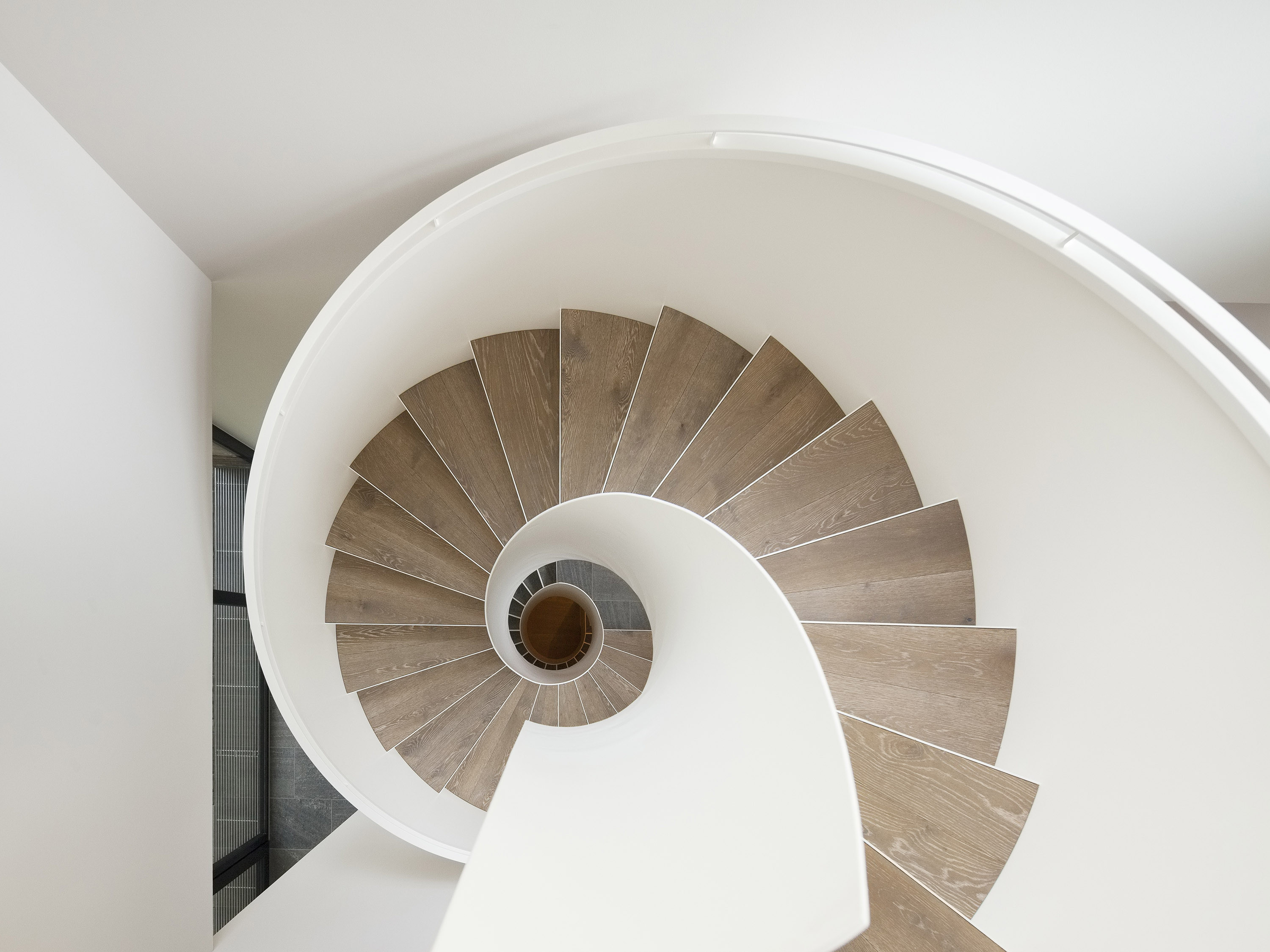 The ground floor comprises living and dining areas, kitchen, study, cloakroom, guest WC and a utility room. A fireplace completes the cosy atmosphere. There are three bedrooms on the upper floor. The sculptural spiral staircase acts as a functional and formal connecting element throughout all floors.