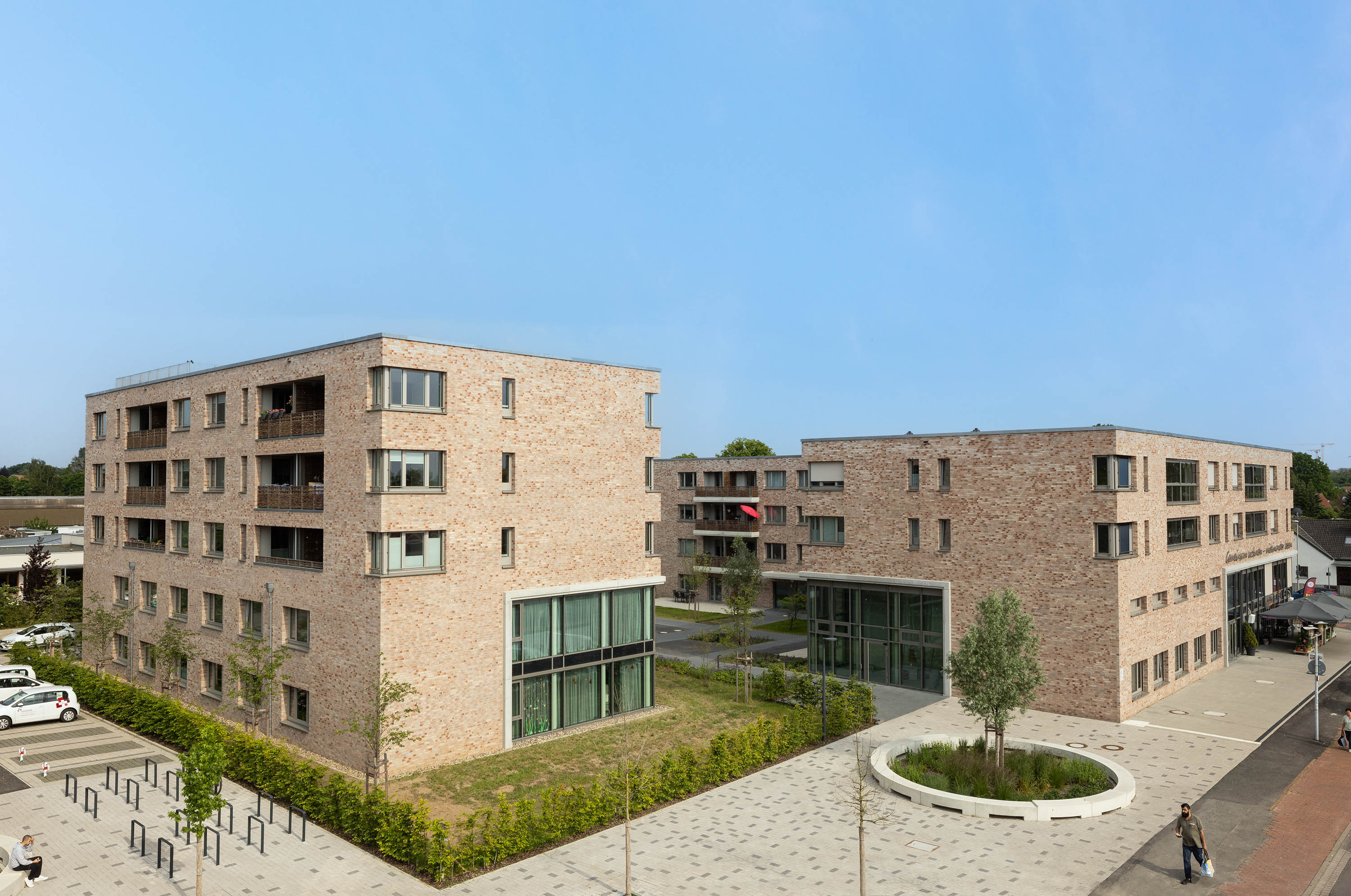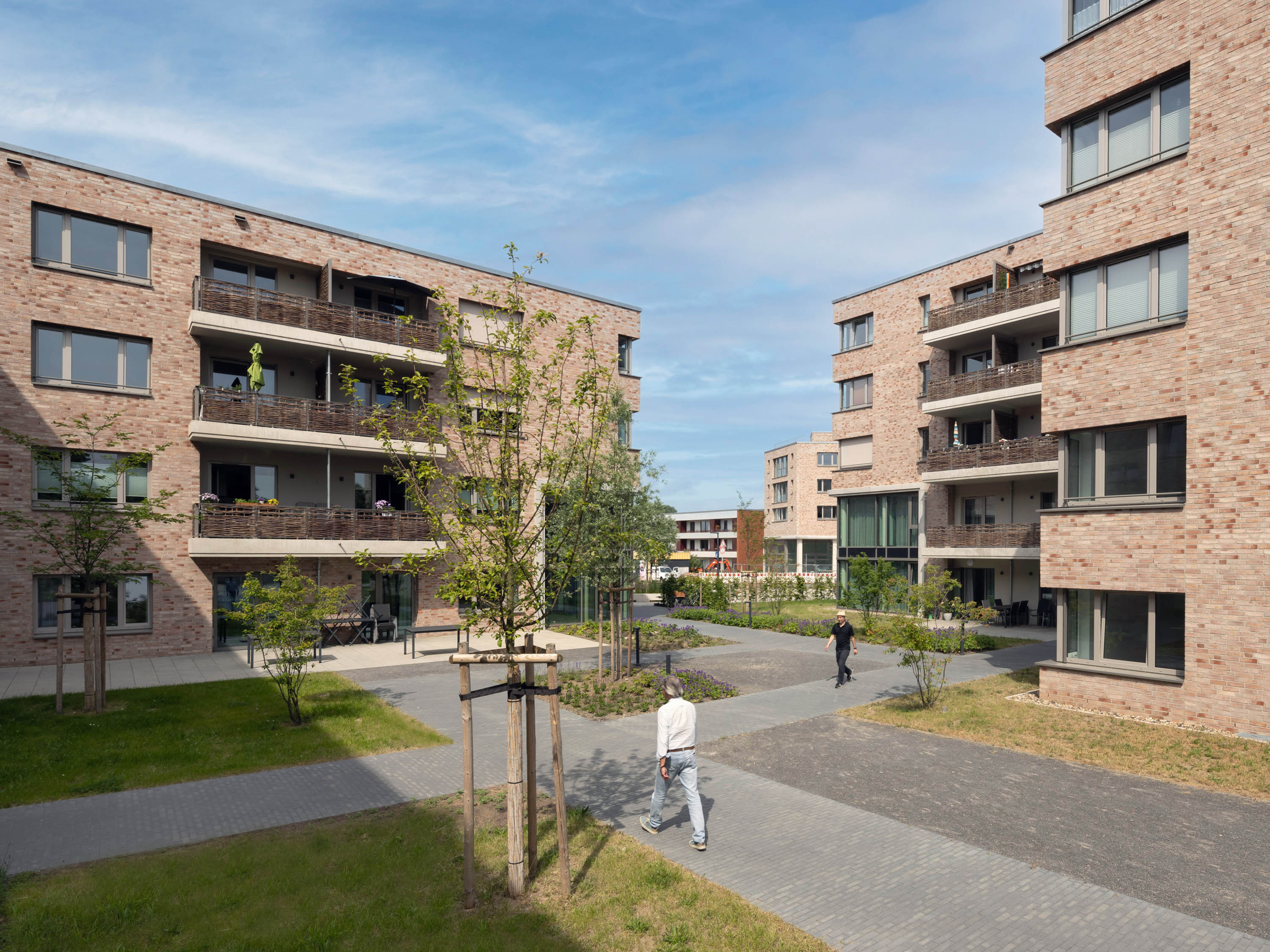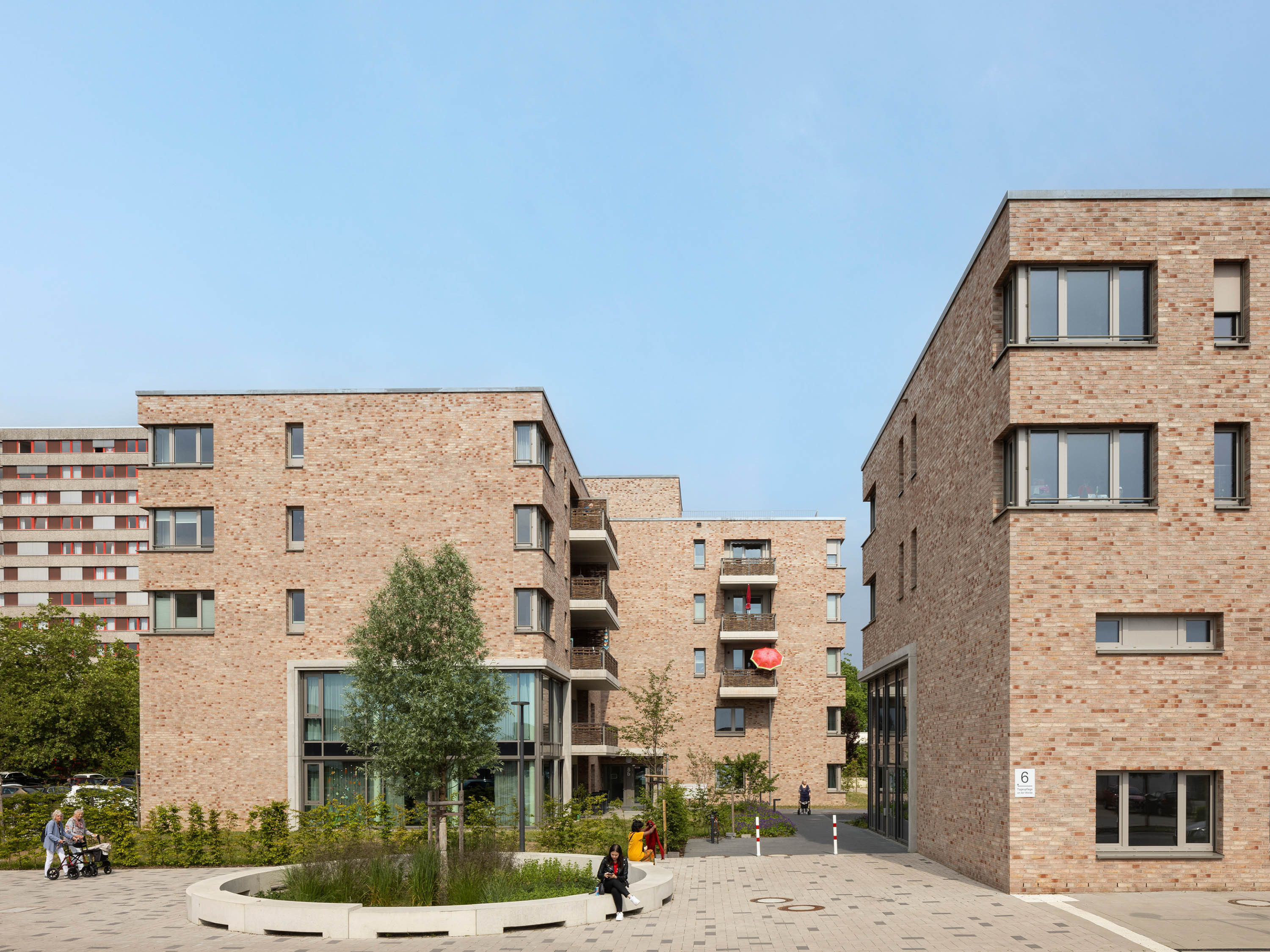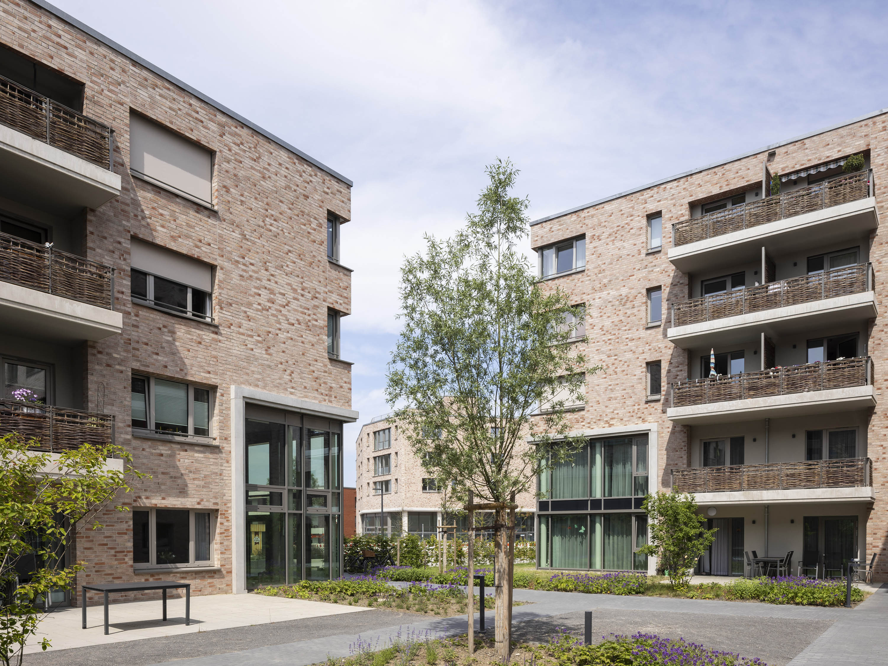 The ensemble consists of three four- to five-storey volumes and a solitary building and is characterised by a coherent, clear geometry and uniform surface materials. The perforated façades are clad in warm-coloured clinker brickwork. Inclusion was at the forefront of the planning and design: all buildings have a multifunctional utilisation concept and all flats are barrier-free.