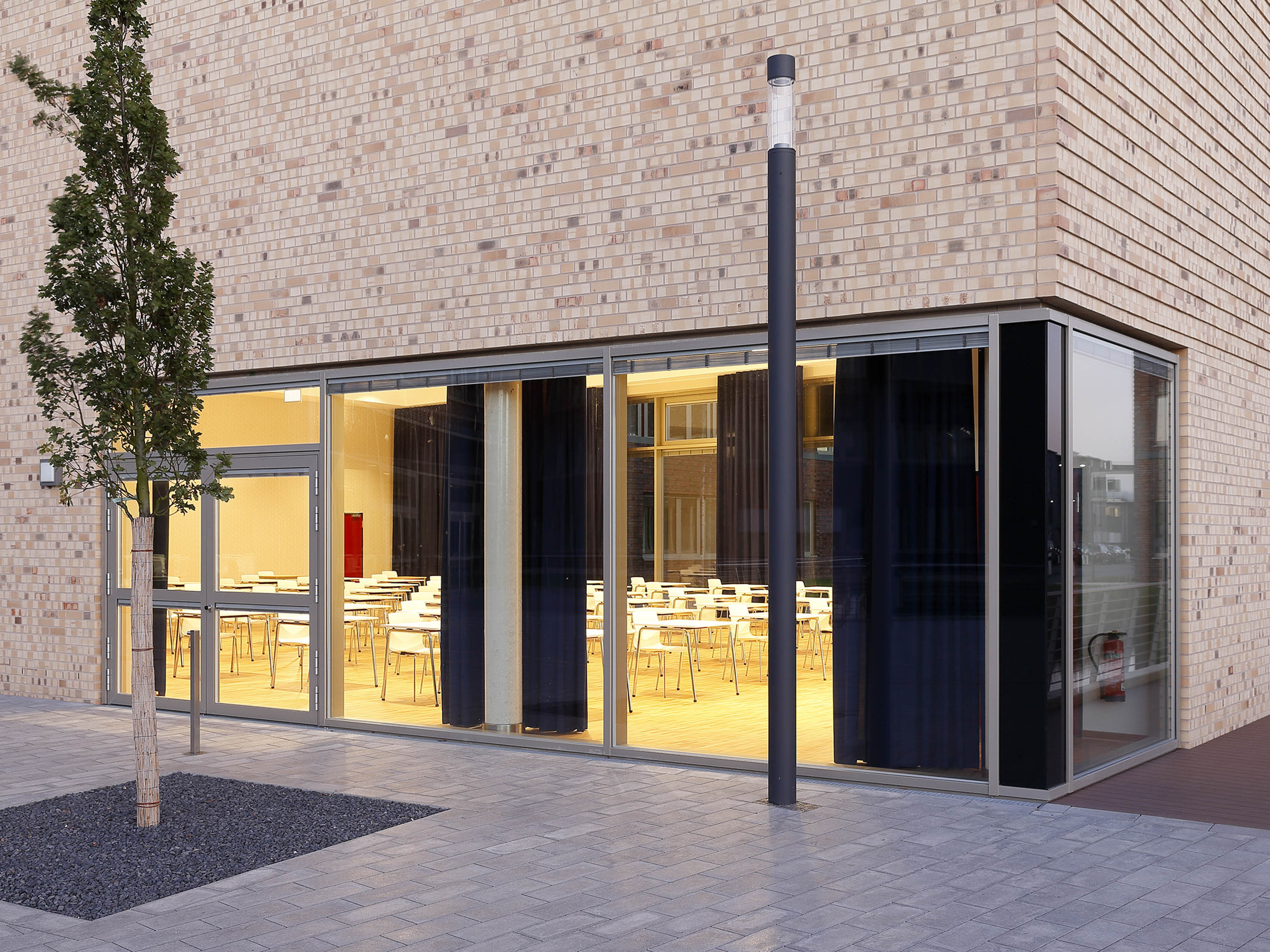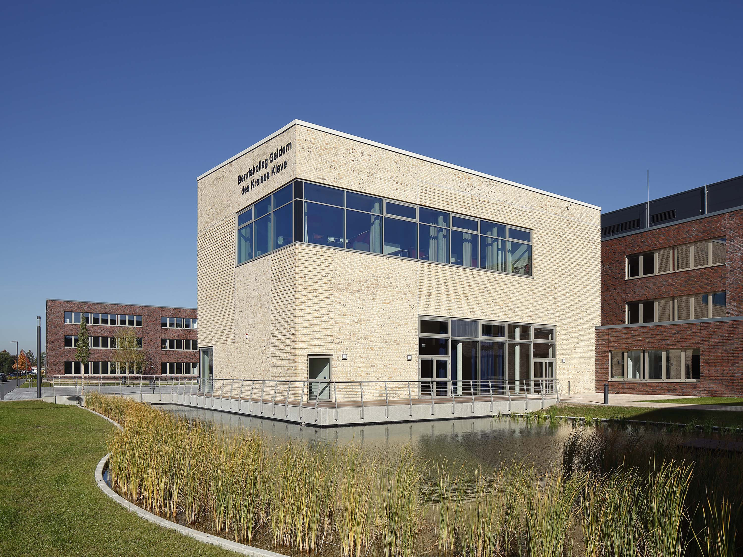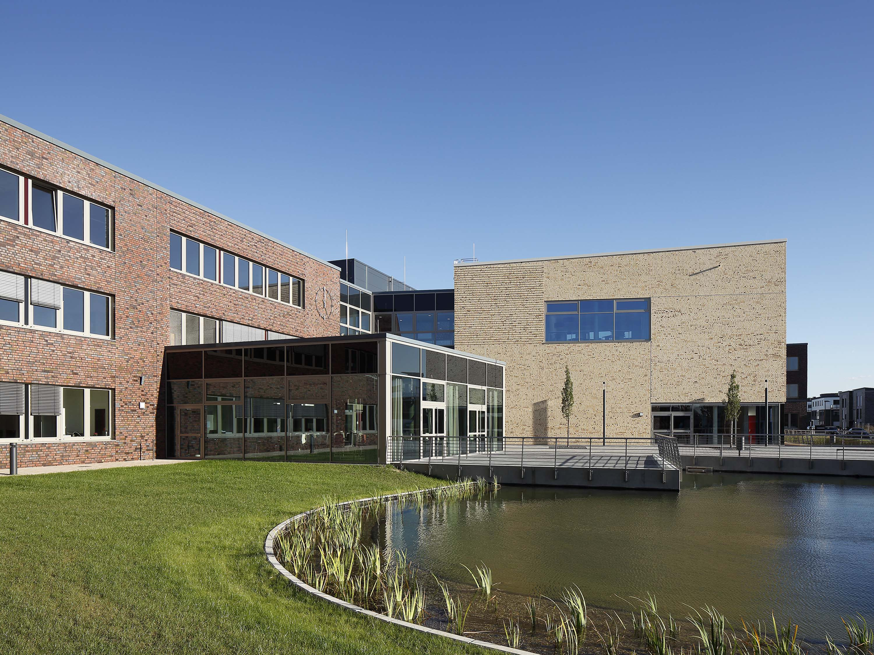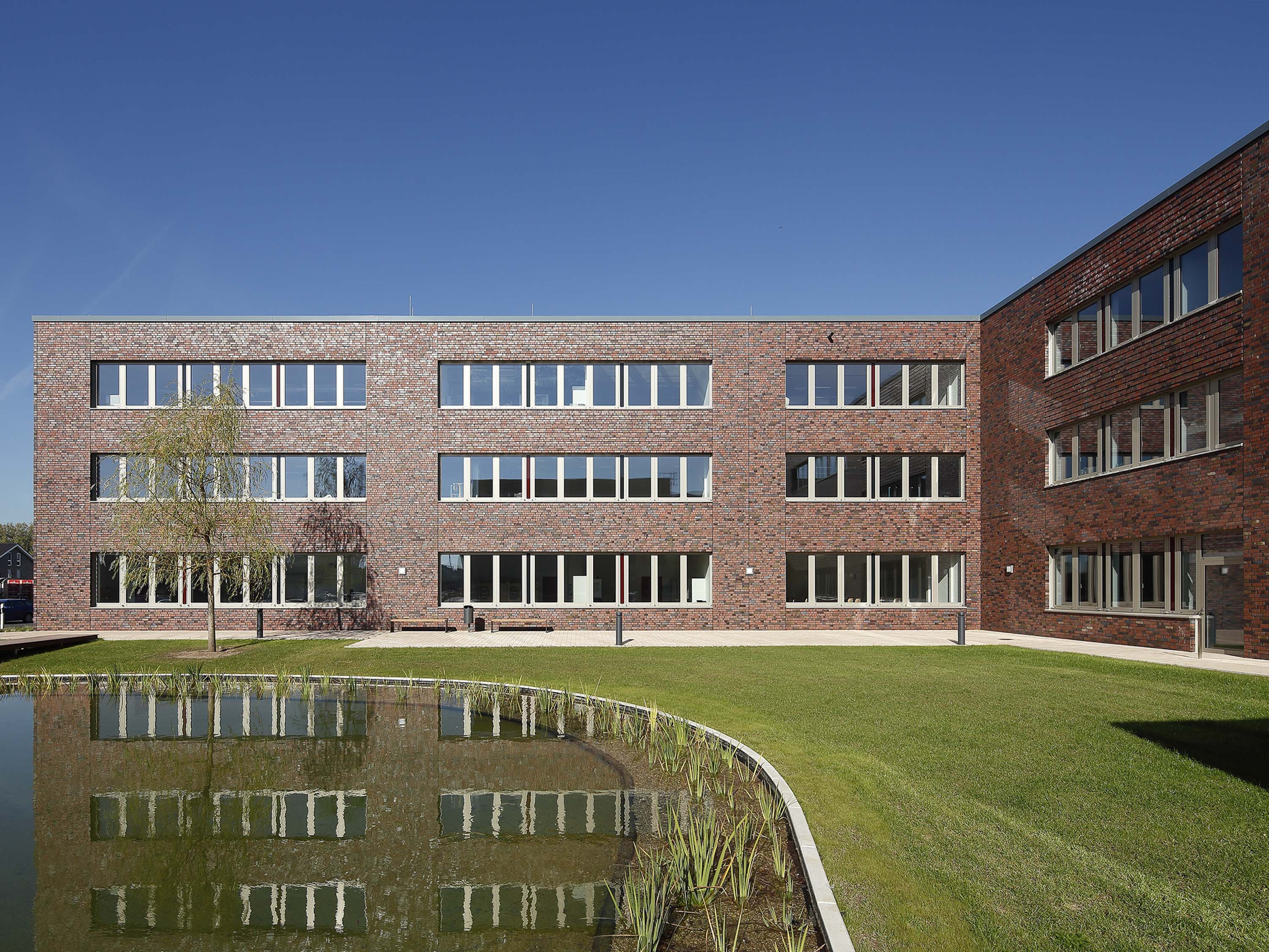 Starting from the access core, the complex is divided into two wings, each with different uses. The floor plans are designed to be flexible in order to accommodate future changes of use as far as possible. Certain functions were conceived as structural accents: the detached volume with assembly hall and library, a self-study centre and the educational centre, the glass building of the canteen or the monolithic building of the district archive.