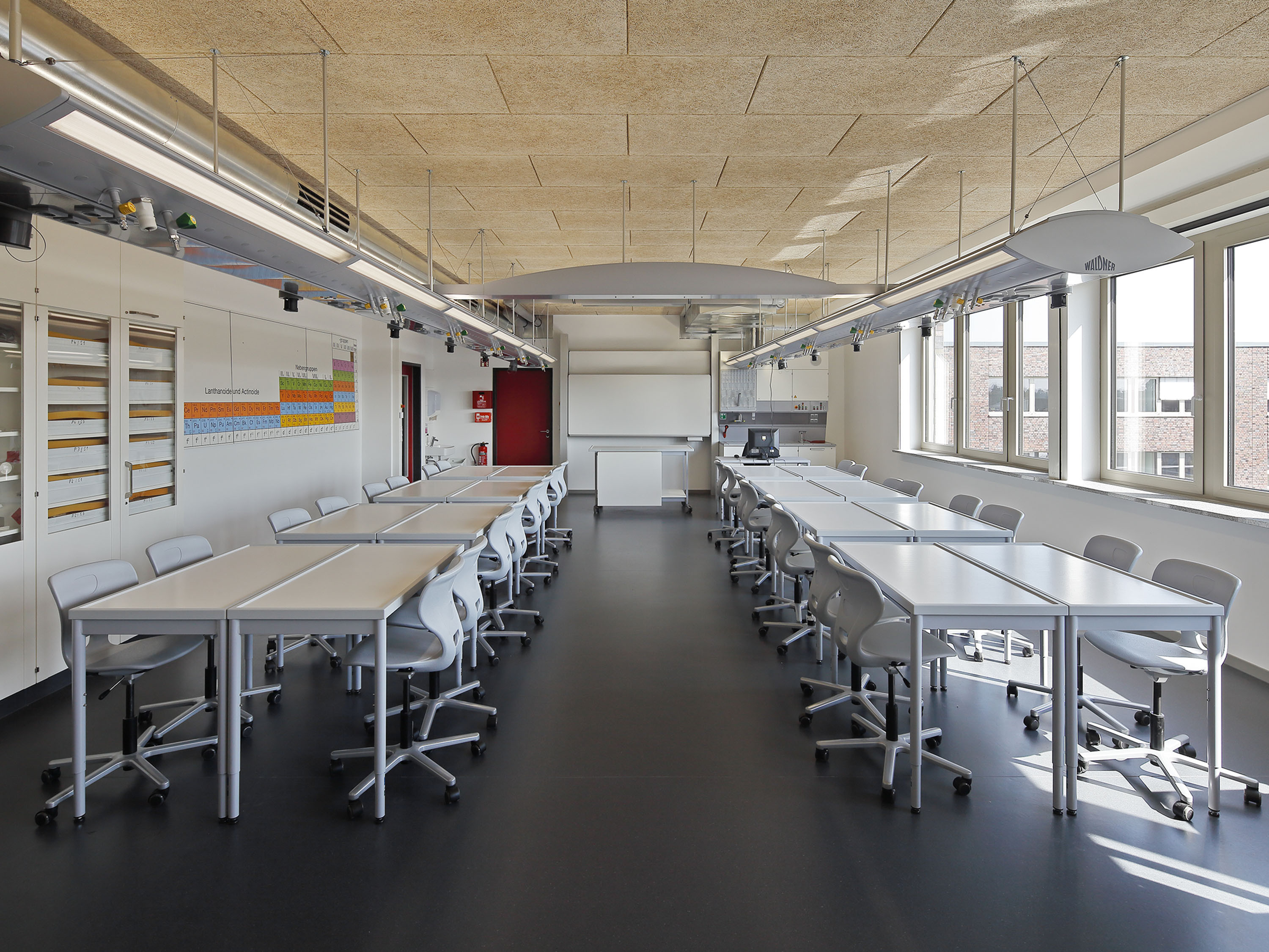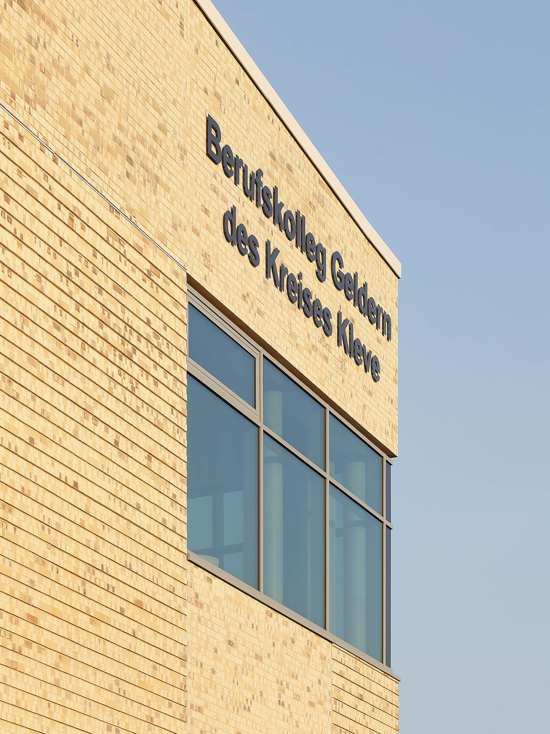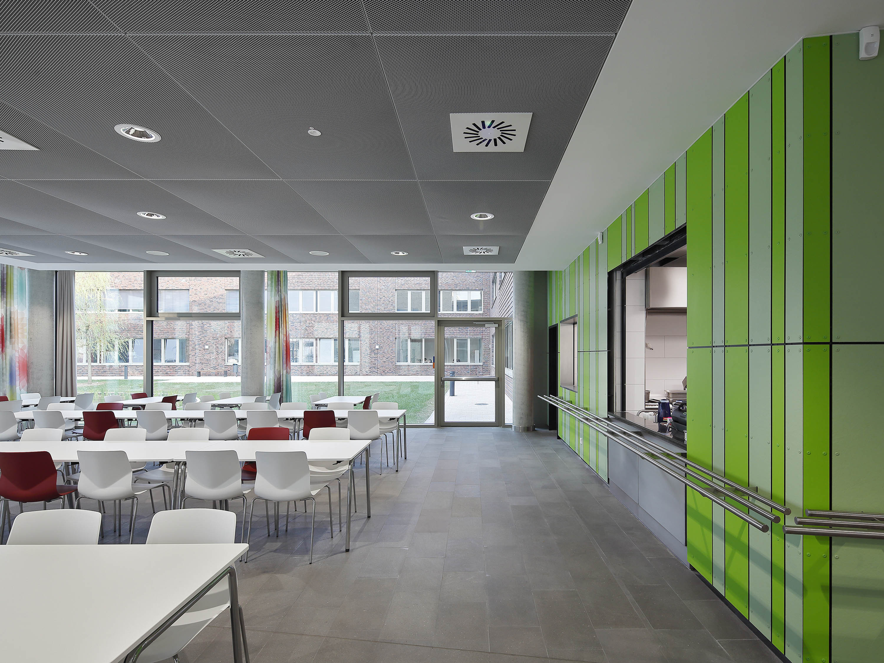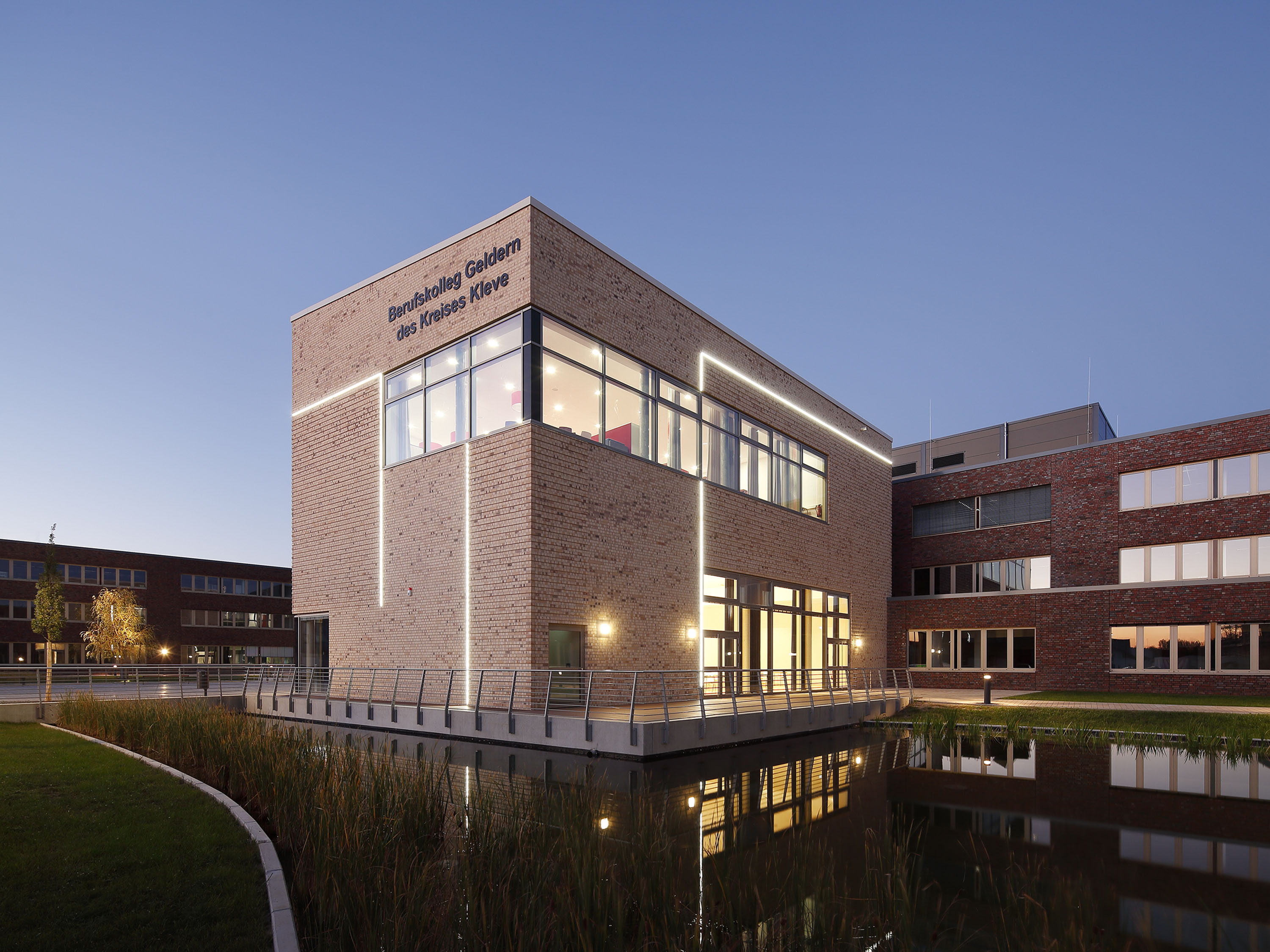 Starting from the access core, the complex is divided into two wings, each with different uses. The floor plans are designed to be flexible in order to accommodate future changes of use as far as possible. Certain functions were conceived as structural accents: the detached volume with assembly hall and library, a self-study centre and the educational centre, the glass building of the canteen or the monolithic building of the district archive.