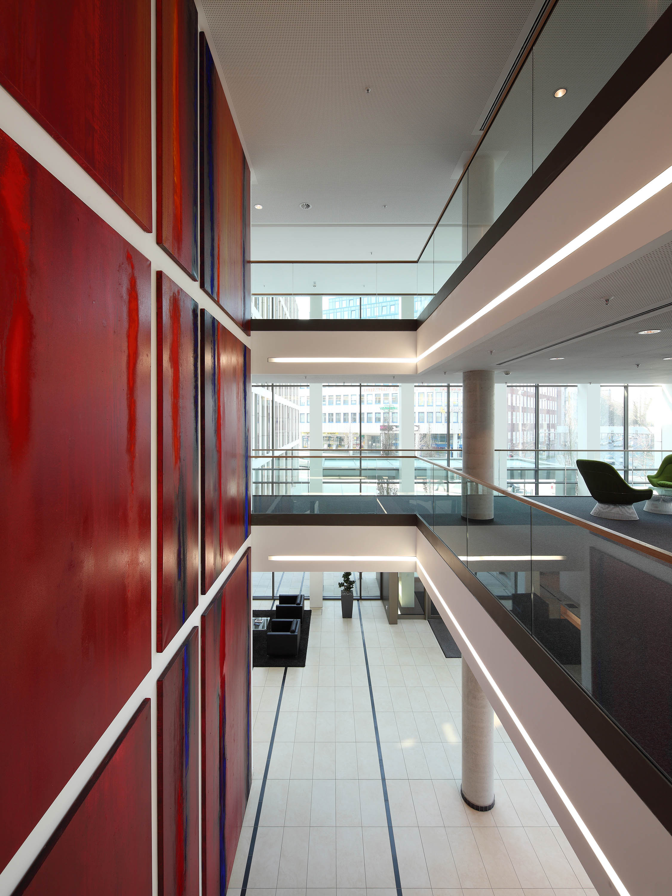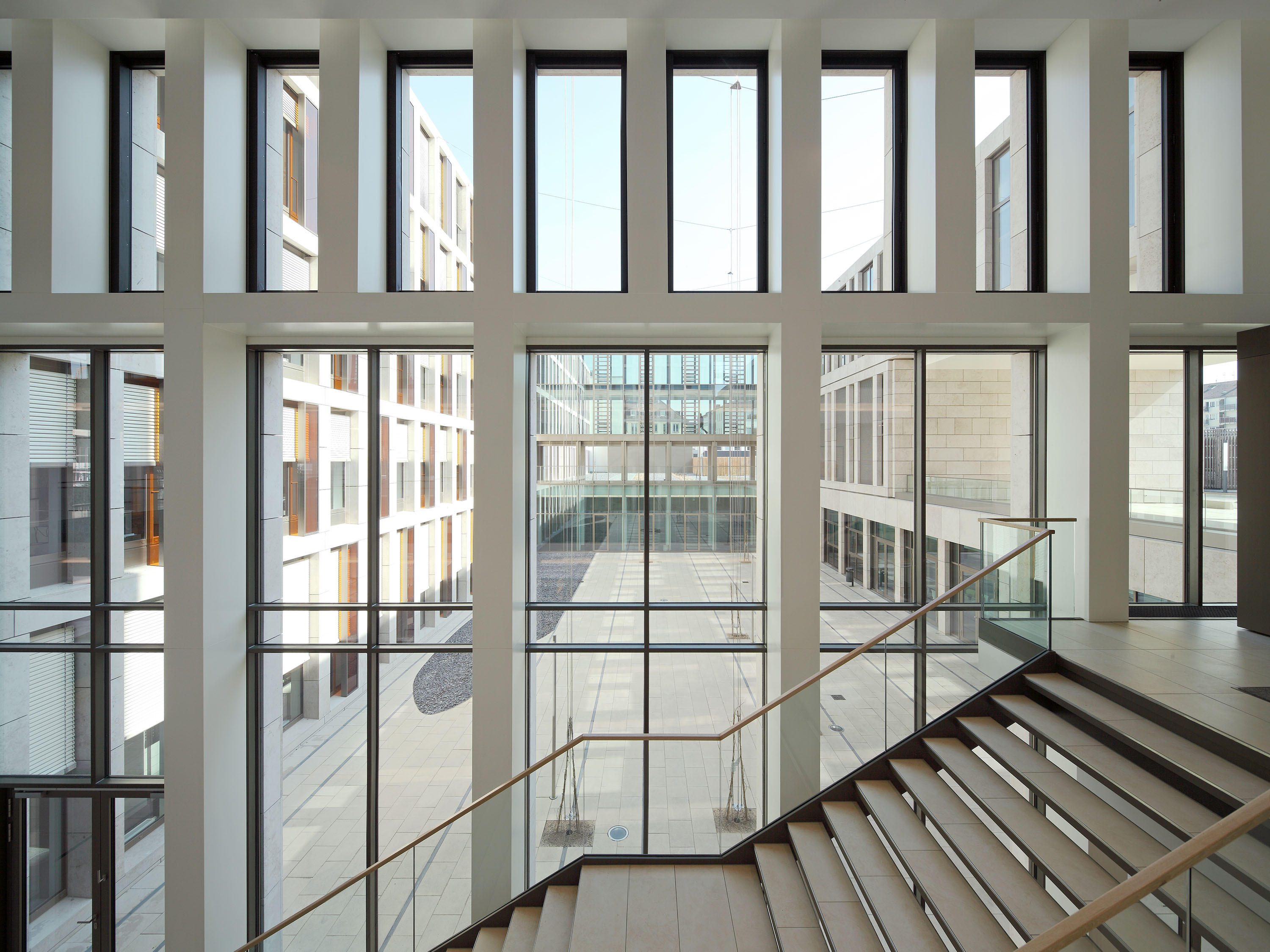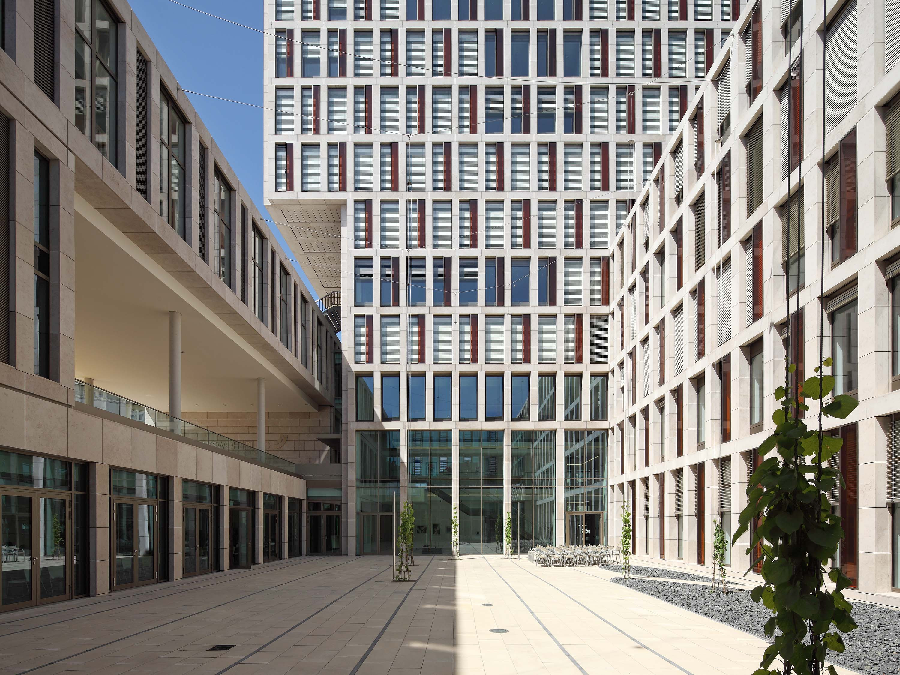 The building is integrated into the existing perimeter block development and is oriented towards the height of the neighbouring buildings. The 17-storey tower of the ensemble, offset from the road junction, makes a self-confident statement.